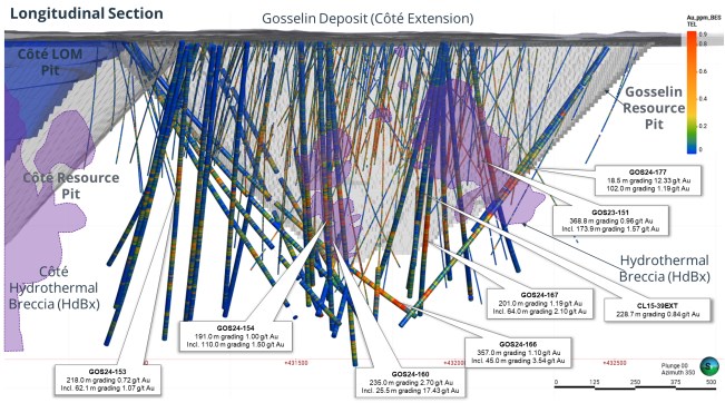 金刚石钻探计划已成功勾勒出Gosselin区在2023年12月31日资源坑壳之外的延伸。在戈塞林西角砾岩的南部和西部,以及在C ô t é和戈塞林西角砾岩之间的深处,有关键的延伸部分相交。戈塞林东部和西部角砾岩之间的含金热液角砾岩的许多短交叉点可能表明角砾岩系统更加连续,角砾岩纹理被强烈的热液蚀变所抹杀。
