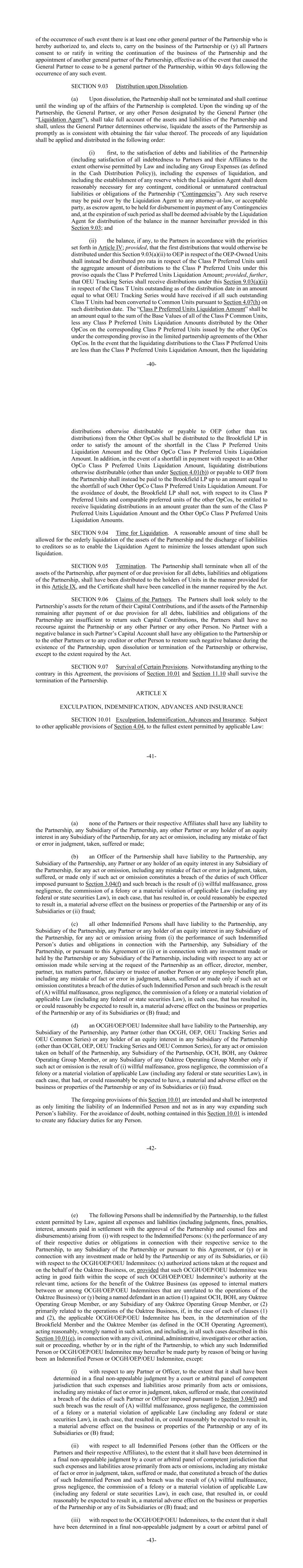 -40-在此类事件发生时,至少有一名合伙企业的其他普通合伙人特此被授权并选择继续经营合伙企业的业务或(y)所有合伙人同意或书面批准继续经营合伙企业的业务和任命合伙企业的另一名普通合伙人,自导致该普通合伙人不再是合伙企业的普通合伙人的事件发生后90天内生效。第9.03节解散时分配。(a)合伙企业解散后,不得终止,并应持续到合伙企业事务的清算结束为止。合伙企业清盘时,普通合伙人或普通合伙人指定的任何其他人员(“清算代理人”)应充分考虑合伙企业的资产和负债,除普通合伙人另有决定外,应在与取得其公允价值一致的情况下,尽快清算合伙企业的资产。任何清算的收益应按以下顺序应用和分配:(i)首先,用于清偿合伙企业的债务和负债(包括在法律另有许可的范围内清偿对合伙人及其关联公司的所有债务,包括任何集团费用(定义见现金分配政策)),包括清算费用,并包括设立清算代理人认为对合伙企业的任何或有、有条件或未到期的合同负债或义务合理必要的任何准备金(“或有事项”)。任何此类准备金可由清算代理人向作为托管代理人的任何律师或可接受的一方支付,以用于支付任何或有事项,并在清算代理人认为可取的期限届满时按本条第9.03条下文规定的方式分配余额;(ii)根据第四条规定的优先顺序将余额(如有)支付给合伙人;但,本应根据本条第9.03(a)(ii)条就OEP拥有的单位向OEP分配的首次分配,应改为就P类优先单位按比例分配,直至根据本但书向P类优先单位分配的总金额等于P类优先单位清算金额;此外,前提是,OEU Tracking Series应根据本条第9.03(a)(ii)款就截至分配日未偿还的T类单位收到分配,金额等于如果所有这些未偿还的T类单位在该分配日已根据第4.07(h)款转换为普通单位,则OEU Tracking Series将收到的金额。“P类优先单位清算金额”的金额应等于所有P类普通单位的基础价值之和,减去其他运营公司根据其他运营公司有限合伙协议中的相应但书在其他运营公司发行的相应P类优先单位上分配的任何P类优先单位清算金额。如果对P类优先单位的清算分配低于P类优先单位清算金额,则应将其他OPCO以其他方式可分配或应付给OEP的清算-41-分配(税收分配除外)分配给Brookfield LP,以满足P类优先单位清算金额和其他OPCO P类优先单位清算金额不足的金额。此外,如果就其他OPCO P类优先股清算金额支付出现短缺,则应向Brookfield LP支付以其他方式可分配的清算分配(根据第4.01(b)节除外)或由合伙企业支付给OEP的清算分配,金额不超过该其他OPCO P类优先股清算金额的短缺。为免生疑问,就其P类优先单位和其他OpCo的可比优先单位而言,Brookfield LP无权获得金额大于P类优先单位清算金额和其他OpCo P类优先单位清算金额之和的清算分配。第9.04节清算时间。应当为合伙企业资产的有序清算和对债权人的债务清偿留出合理的时间,使清算代理人能够最大限度地减少清算时伴随的损失。第9.05节终止。当合伙企业的全部资产,在清偿全部债务或对全部债务进行到期拨备后,合伙企业终止, 合伙企业的责任和义务,应已按照本第九条规定的方式分配给单位持有人,证书应已按照法案要求的方式注销。第9.06节合伙人的债权。合伙人应当只看合伙企业的资产来返还其出资,如果合伙企业在支付或为合伙企业的所有债务、负债和义务提供到期准备后剩余的资产不足以返还该等出资,则合伙人对合伙企业或任何其他合伙人或任何其他人没有追索权。任何在该合伙人资本账户中有负余额的合伙人,对合伙企业或其他合伙人或任何债权人或其他人,均无义务在合伙企业存续期间、在合伙企业解散或终止时或以其他方式恢复该负余额,除非该法案要求的范围内。第9.07节某些规定的存续。尽管本协议有任何相反的规定,第10.01条和第11.10条的规定在合伙关系终止后仍然有效。第十条驱逐、赔偿、垫款和保险第10.01款驱逐、赔偿、垫款和保险。在不违反第4.04节其他适用规定的情况下,在适用法律允许的最大范围内:-42-(a)任何合伙人或其各自的关联公司均不对合伙企业、合伙企业的任何附属公司、任何其他合伙人或合伙企业的任何附属公司的任何股权持有人承担任何责任,因为他们采取、遭受或作出的任何作为或不作为,包括事实错误或判断错误;(b)合伙企业的高级管理人员应对合伙企业、合伙企业的任何附属公司承担责任,任何合伙人或合伙企业任何附属公司的任何股权持有人,仅在此类作为或不作为构成违反根据第3.04(f)节施加的该官员的职责且此类违反是(i)故意渎职、重大过失、犯下重罪或严重违反适用法律(包括任何联邦或州证券法)的结果时,才采取、遭受或作出的任何作为或不作为,包括任何事实错误或判断错误,在每种情况下,已导致或可合理预期将导致,对合伙企业或其任何子公司的业务或财产造成重大不利影响或(ii)欺诈;(c)所有其他受偿人应对合伙企业、合伙企业的任何子公司、任何合伙人或合伙企业的任何子公司的股权的任何持有人承担因(i)履行该受偿人与合伙企业、合伙企业的任何子公司有关的职责和义务而引起的任何作为或不作为的责任,或根据本协议或(ii)或与合伙企业或合伙企业的任何附属公司作出或持有的任何投资有关,包括在应合伙企业的要求担任高级职员、董事、成员、合伙人、税务事务合伙人、受托人或另一人的受托人或任何雇员福利计