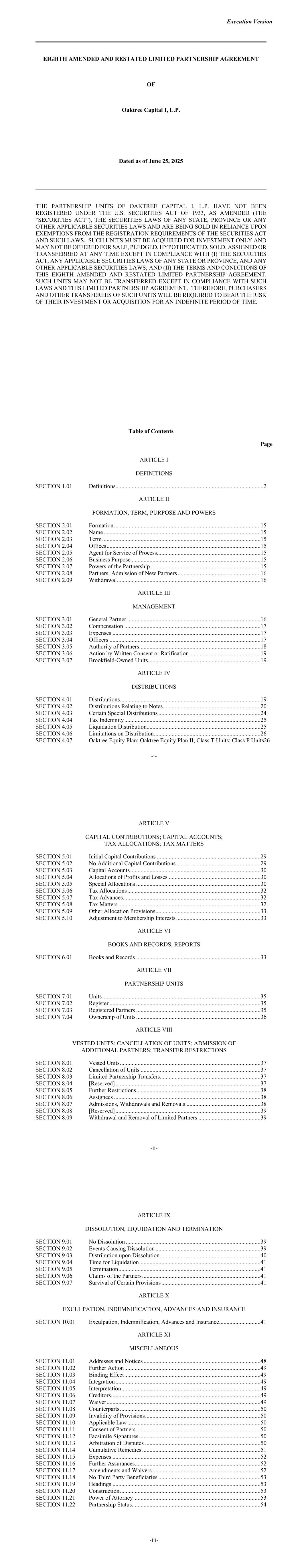 执行第八版修订并重述了Oaktree Capital I,L.P.的有限合伙协议,截至2025年6月25日,Oaktree Capital I,L.P.的合伙单位尚未根据经修订的1933年美国证券法(“证券法”)、任何州、省或任何其他适用的证券法进行登记,并且正在根据注册处的豁免进行出售此类单位必须仅为投资而获得,不得在任何时候提出出售、质押、假说、出售、转让或转让,除非遵守(i)《证券法》、任何国家或省的任何适用证券法以及任何其他适用证券法;以及(ii)本八项经修订和重述的有限合伙协议的条款和条件除非遵守此类法律和本有限伙伴关系协议,否则不得转让此类单位。因此,将要求此类单位的购买者和其他受让人无限期承担其投资或收购的风险。-i-目录页第一条定义第1.01款定义....................................................................................2第二条形成,术语, P U R O S E A N D W C T I 2 . 01formation150ame1503erm1504ffices1505gentForeViceofrocess1506businessurpose1507owersoftheartnership1508artners;dmissionofewartners1609ithdrawal16LMGM301Generalartner1630ompensation17303xpenses17304fficers17305uthorityofartners18306ctionbyrittenonsentoratification19307Brookfield-wnednits19LVB401istributions1940istributionselatingtootes0403ertainpecialistributions4404axndemn
