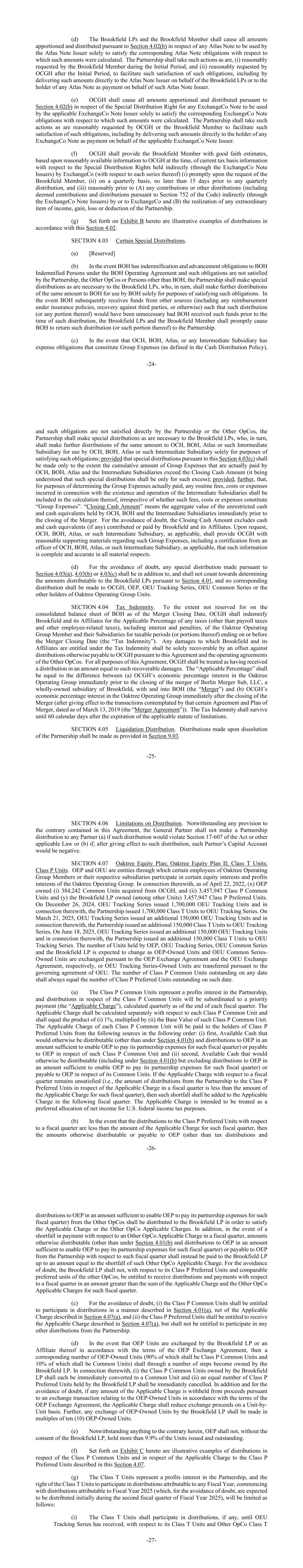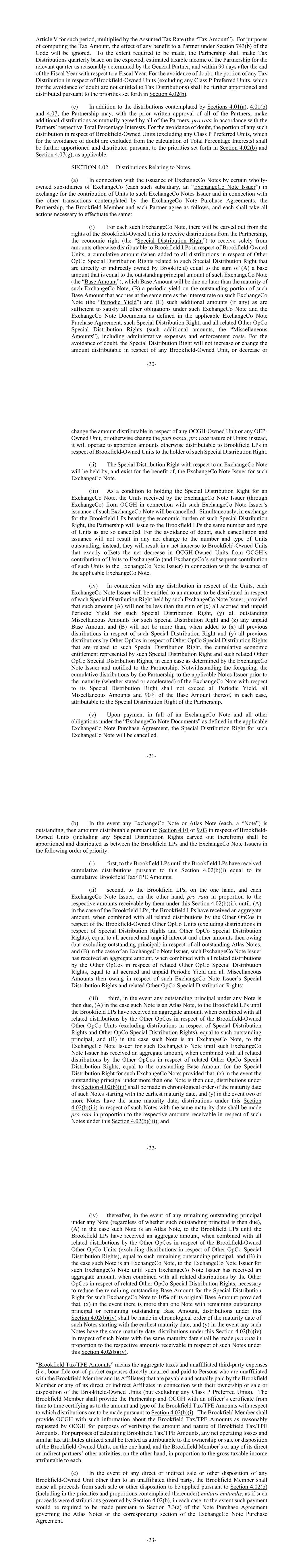 -20-该期间的第五条,乘以假定税率(“税额”)。为了计算税额,将忽略《守则》第743(b)条规定的对合作伙伴的任何好处的影响。在要求的范围内,合伙企业应根据普通合伙人合理确定的合伙企业在相关季度的预期、估计应纳税所得额,并在财政年度结束后的90天内就一个财政年度进行税收分配。为免生疑问,有关Brookfield拥有的单位(不包括任何P类优先单位,为免生疑问,这些单位无权获得税收分配)的任何税收分配部分,应根据第4.02(b)节规定的优先顺序进一步分摊和分配。(c)除第4.01(a)、4.01(b)和4.07条所设想的分配外,合伙企业可在所有合伙人事先书面批准的情况下,按照所有合伙人共同同意的方式,按照合伙人各自的总百分比权益按比例进行额外分配。为免生疑问,有关Brookfield拥有的单位(不包括任何P类优先单位,为免生疑问,这些单位被排除在总百分比权益的计算之外)的任何此类分配部分,应根据第4.02(b)节和第4.07(g)节规定的优先次序(如适用)进一步分摊和分配。第4.02节与票据有关的分配。(a)就ExchangeCo的若干全资附属公司(每一该等附属公司,即“ExchangeCo票据发行人”)发行ExchangeCo票据以换取对该ExchangeCo票据发行人的单位贡献,以及就ExchangeCo票据购买协议所设想的其他交易而言,合伙企业、Brookfield成员和每一合伙人同意如下,并各自应采取一切必要行动以实现相同:(i)就每一份该等ExchangeCo票据而言,将从Brookfield拥有的单位收取合伙企业的分配的权利中剥离,经济权利(“特别分配权”)仅从就Brookfield拥有的单位以其他方式分配给Brookfield LP的金额中收取的累计金额(当与Brookfield直接或间接拥有的与该特别分配权相关的其他OPCO特别分配权的所有分配相加时)等于(a)等于该交易所票据的未偿本金金额(“基准金额”)之和,该基准金额将不迟于该交易所票据到期日到期,(b)该等基本金额的未偿还部分按与该交易所票据利率相同的利率(“定期收益率”)产生的定期收益率,以及(c)足以满足适用的交易所票据购买协议中定义的该交易所票据和交易所票据文件项下的所有其他义务的额外金额(如有)、该特别分配权以及所有相关的其他OPCO特别分配权(该等额外金额,“杂项金额”),包括管理费用和强制执行费用。为免生疑问,特别分配权将不会增加或改变任何Brookfield拥有的单位的可分配金额,或减少或-21-改变任何OCGH拥有的单位或任何OEP拥有的单位的可分配金额,或以其他方式改变单位的按比例平等性质;相反,它将运作,将以其他方式就Brookfield拥有的单位向Brookfield LP分配的金额分配给该特别分配权的持有人。(ii)交易所票据的特别分配权将由交易所票据发行人持有,并为该交易所票据发行人的利益而存在。(iii)作为持有交易所票据特别分配权的条件,交易所票据发行人(透过交易所)就该交易所票据发行人发行该交易所票据而从OCGH收取的单位将被注销。同时,为换取Brookfield LP承担此类特别分配权的经济负担,合伙企业将向Brookfield LP发行与如此取消的相同数量和类型的单位。为免生疑问,此类注销和发行不会导致未偿还单位的数量和类型发生任何净变化;相反, 它们将导致Brookfield拥有的单位净增加,这正好抵消了OCGH在发行适用的ExchangeCo票据时向ExchangeCo贡献的单位(以及ExchangeCo随后向ExchangeCo票据发行人贡献的此类单位)中OCGH拥有的单位的净减少。(iv)就有关单位的任何分派而言,每名交易所票据发行人将有权就该交易所票据发行人所持有的每项特别分配权获得须予分派的金额;但该等金额(a)将不少于(x)该特别分配权的所有应计及未付定期收益率、(y)该特别分配权的所有未付杂项金额及(z)任何未付基本金额及(b)将不多于,当添加到(x)与该特别分配权有关的所有先前分配和(y)与该特别分配权相关的其他OPCO特别分配权的所有先前分配时,该特别分配权和该相关的其他OPCO特别分配权所代表的累积经济权利,在每种情况下由交易所票据发行人确定并通知合伙企业。尽管有上述规定,合伙企业在ExchangeCo票据到期前(无论是明示的还是加速的)向适用票据发行人就其特别分配权进行的累计分配不得超过所有定期收益率、所有杂项金额和其基本金额的90%,在每种情况下,归属于合伙企业的特别分配权。(v)在全额支付交易所票据及适用的交易所票据购买协议所定义的“交易所票据文件”项下的所有其他义务后,该交易所票据的特别分配权将被取消。-22-(b)如果任何ExchangeCo票据或Atlas票据(每一项,“票据”)未偿还,则根据第4.01或9.03节就Brookfield拥有的单位(包括从中划出的任何特别分配权)可分配的金额应在Brookfield LP和ExchangeCo票据发行人之间按以下优先顺序分配和分配:(i)首先,向Brookfield LP分配,直到Brookfield LP根据本条收到的累计分配(b)(i)等于其累计Brookfield税/TPE金额;(ii)其次,向Brookfield LP分配,一方面,另一方面,各交易所票据发行人按其根据本条第4.02(b)(ii)款各自应收款项的比例按比例支付,直至,(a)就Brookfield LP而言,Brookfield LP已收到总额,当与其他运营公司就Brookfield拥有的其他运营公司单位进行的所有相关分配(不包括特别分配权和其他运营公司特别分配权方面的分配)相结合时,等于所有未偿Atlas票据的所有应计和未付利息以及当时所欠的其他金额(但不包括未偿本金),(b)就交易所联合票据发行人而言,该交易所联合票据发行人已收到一笔总额,当与其他期权公司就相关其他期权公司特别