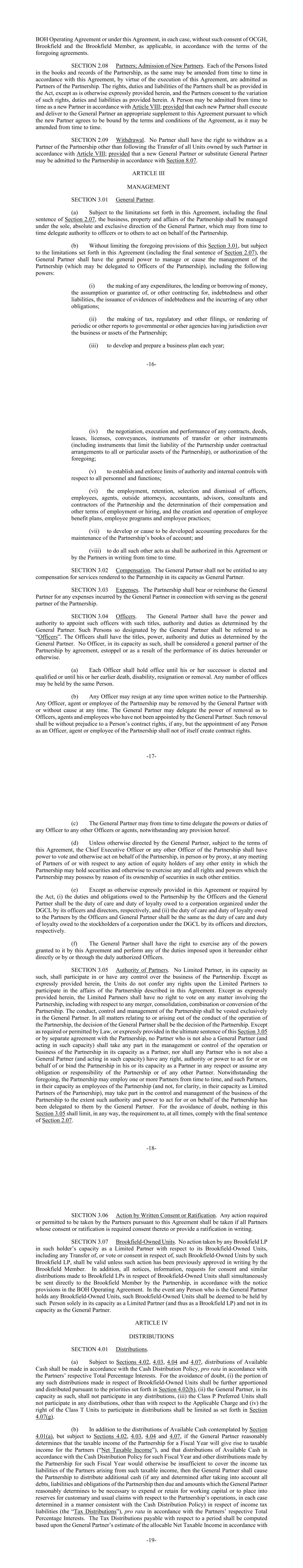 -16-BOH运营协议或根据本协议,在每种情况下,根据上述协议的条款,未经OCGH、Brookfield和Brookfield成员(如适用)的同意。第2.08节合作伙伴;接纳新的合作伙伴。合伙企业的簿册和记录中所列的每一人,由于本协议的执行,可能会根据本协议不时修订,被接纳为合伙企业的合伙人。合伙人的权利、义务和责任应按照法案的规定,除非本文另有明确规定,并且合伙人同意变更本文规定的权利、义务和责任。某人可根据第八条不时被接纳为新合伙人;但条件是每个新合伙人应执行并向普通合伙人交付本协议的适当补充,据此,新合伙人同意受协议条款和条件的约束,该条款和条件可能会不时修订。第2.09节撤回。除根据第八条转让该合伙人所拥有的全部单位后,任何合伙人均无权退出合伙企业的合伙人身份;但可根据第8.07条接纳新的普通合伙人或替代普通合伙人加入合伙企业。第三条管理第3.01款普通合伙人。(a)在不违反本协议规定的限制,包括第2.07节最后一句的情况下,合伙企业的业务、财产和事务应在普通合伙人的唯一、绝对和排他性指导下进行管理,普通合伙人可不时将代表合伙企业行事的权力下放给高级职员或其他人。(b)在不限制本条3.01的前述规定的情况下,但在本协议规定的限制(包括第2.07条最后一句)的限制下,普通合伙人应拥有管理或促使管理合伙企业的一般权力(可授予合伙企业的高级管理人员),包括以下权力:(i)进行任何支出、出借或借钱、承担或担保或以其他方式订约债务和其他负债,出具债务和承担任何其他义务的证据;(ii)向对合伙企业的业务或资产具有管辖权的政府或其他机构提交税务、监管和其他备案,或提交定期报告或其他报告;(iii)每年制定和编制业务计划;-17-(iv)谈判、执行和履行任何合同、契据、租约、许可、转易、转让文书或其他文书(包括将合伙企业在合同安排下的责任限制为合伙企业全部或特定资产的文书),或上述授权;(v)就所有人员和职能制定和执行权限限制和内部控制;(vi)雇用、保留、甄选和解雇高级职员、雇员、代理人、外部律师、合伙企业的会计师、顾问、顾问和承包商,并确定他们的报酬和其他雇用或雇用条件,以及建立和实施雇员福利计划,员工计划和员工做法;(vii)为维护合伙企业的账簿制定或促使制定会计程序;(viii)执行本协议或合伙人不时以书面形式授权的所有其他行为。第3.02节赔偿。对于以普通合伙人身份向合伙企业提供的服务,普通合伙人无权获得任何补偿。第3.03款费用。合伙企业应承担或补偿普通合伙人因担任合伙企业普通合伙人而发生的任何费用。第3.04节干事。普通合伙人有权、有权任命具有普通合伙人确定的职称、权限和职责的高级管理人员。普通合伙人如此指定的人员应称为“高级职员”。高级职员应拥有普通合伙人确定的头衔、权力、权限和职责。任何官员以其本身的身份,不得通过协议、不容反悔或因履行其根据本协议或其他方式承担的职责而被视为合伙企业的普通合伙人。(a)每名高级人员须任职至其继任人当选并符合资格,或直至其较早前去世、伤残, 辞职或免职。任何数目的职位可由同一人担任。(b)任何人员可在向合伙发出书面通知后随时辞职。合伙企业的任何高级管理人员、代理人或雇员可随时被普通合伙人在有理由或无理由的情况下免职。普通合伙人可将免职权力下放给未获普通合伙人任命的高级职员、代理人和雇员。此种解除不得损害某人的合同权利(如有),但任命任何人为合伙企业的高级职员、代理人或雇员本身不应产生合同权利。-18-(c)普通合伙人可不时将任何高级人员的权力或职责转授予任何其他高级人员或代理人,即使本条例另有规定。(d)除非普通合伙人另有指示,在遵守本协议条款的情况下,首席执行官或合伙企业的任何其他高级管理人员有权亲自或通过代理人代表合伙企业在合伙企业可能持有证券的任何其他实体的任何合伙人会议上或就合伙企业可能持有证券的任何其他实体的权益持有人的任何行动中投票或以其他方式行事,并以其他方式行使合伙企业因其对此类其他实体的证券所有权而可能拥有的任何和所有权利和权力。(e)除本协议另有明确规定或法案要求外,(i)高级职员和普通合伙人对合伙企业的义务和义务应是其高级职员和董事分别对根据DGCL组建的公司负有的注意义务和忠诚义务,及(ii)高级人员及普通合伙人对合伙人所负的注意义务及忠诚义务,须与其高级人员及董事分别根据DGCL对法团股东所负的注意义务及忠诚义务相同。(f)普通合伙人有权直接或由正式授权人员或通过正式授权人员行使本协议授予其的任何权力,并履行根据本协议强加给其的任何职责。第3.05节合作伙伴的权威。任何有限合伙人不得以其身份参与或控制合伙企业的业务。除本协议明确规定外,各单位不授予有限合伙人参与本协议所述合伙企业事务的任何权利。除本协议明文规定外,有限合伙人对涉及合伙企业的任何事项,包括对合伙企业的任何合并、合并、合并或转换事项,均无投票权。合伙企业的行为、控制和管理应完全归属于普通合伙人。在与合伙企业经营行为有关或产生的所有事项中,普通合伙人的决定应为合伙企业的决定。除法律要求或许可的情况外,或在本条第3.05款最终句中明文规定或与合伙企业另行协议的情况下,任何非普通合伙人(并以该身份行