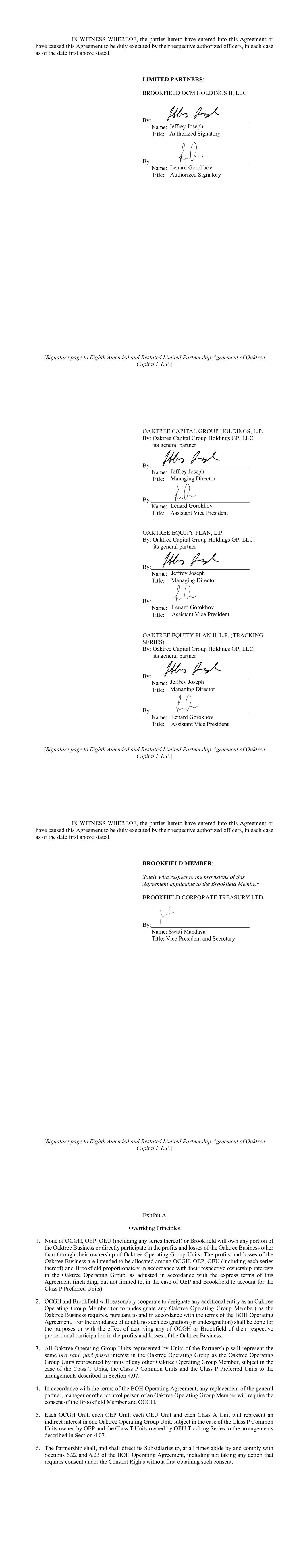 【Oaktree Capital I,L.P.第八份经修订和重述的有限合伙协议之签署页】作为证明,本协议各方已订立本协议或已促使本协议由其各自的授权人员正式签署,在每种情况下均截至上述日期。有限合伙人:Brookfield OCM HOLDINGS II,LLC由:Name:Title:Name:Title:Jeffrey Joseph授权签字人Lenard Gorokhov授权签字人OAKTREE CAPITAL GROUP HOLDINGS,L.P.由:橡树资本 Holdings GP,LLC,其普通合伙人由:Name:Title:Title:Name:Title:Oaktree Capital Group 橡树资本 Holdings GP,LLC,其普通合伙人:姓名:职务:姓名:职务:Jeffrey Joseph董事总经理Lenard Gorokhov助理副总裁Jeffrey Joseph董事总经理Lenard Gorokhov助理副总裁Lenard Gorokhov助理副总裁Jeffrey Joseph董事总经理[ Oaktree Capital I,L.P.第八次修订和重述有限合伙协议签署页] [ Oaktree Capital I,L.P.第八次修订和重述有限合伙协议签署页]作为证据,本协议各方已订立本协议或已促使本协议由其各自的授权人员正式签署,在每种情况下,截至上述日期。布鲁克菲尔德成员:仅就适用于布鲁克菲尔德成员的本协议条款而言:布鲁克菲尔德公司储藏有限公司。作者:姓名:Swati Mandava标题:副总裁兼秘书附件压倒一切的原则1。OCGH、OEP、OEU(包括其任何系列)或Brookfield均不会拥有Oaktree业务的任何部分或直接参与Oaktree业务的损益,除非通过其对Oaktree运营集团单位的所有权。Oaktree业务的损益拟在OCGH、OEP、OEU(包括其各系列)和Brookfield之间按照各自在Oaktree Operating Group的所有权权益按比例分配,并根据本协议的明确条款进行调整(包括但不限于在OEP和Brookfield的情况下占P类优先股)。2.OCGH和Brookfield将合理合作,根据并根据《BOH运营协议》的条款,根据Oaktree业务的需要,指定任何额外的实体为Oaktree运营集团成员(或取消指定任何Oaktree运营集团成员)。为免生疑问,不得为剥夺OCGH或Brookfield各自按比例参与Oaktree业务的利润和亏损的目的或效果而进行此类指定(或取消指定)。3.由合伙企业的单位所代表的所有Oaktree运营集团单位将与由任何其他Oaktree运营集团成员的单位所代表的Oaktree运营集团单位在Oaktree运营集团中代表相同的按比例、同等权益,但在T类单位、P类普通单位和P类优先单位的情况下,须遵守第4.07节所述的安排。4.根据BOH运营协议的条款,Oaktree运营集团成员的普通合伙人、经理或其他控制人的任何更换将需要Brookfield成员和OCGH的同意。5.每个OCGH单位、每个OEP单位、每个OEU单位和每个A类单位将代表一个Oaktree Operating Group单位的间接权益,但在OEP拥有的P类普通单位和OEU Tracking Series拥有的T类单位的情况下,须遵守第4.07节所述安排。6.合伙企业应并应指示其子公司始终遵守和遵守《BOH经营协议》第6.22和6.23条,包括在未首先获得同意的情况下不采取任何根据同意权需要同意的行动。