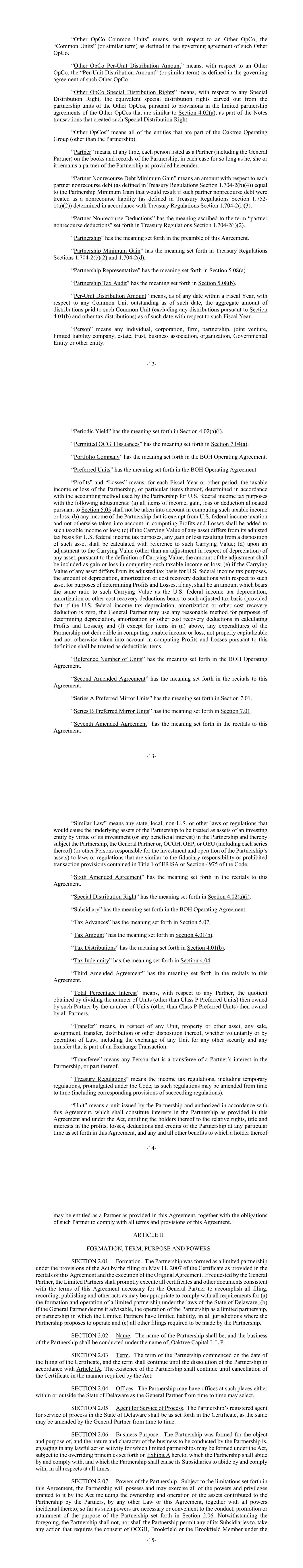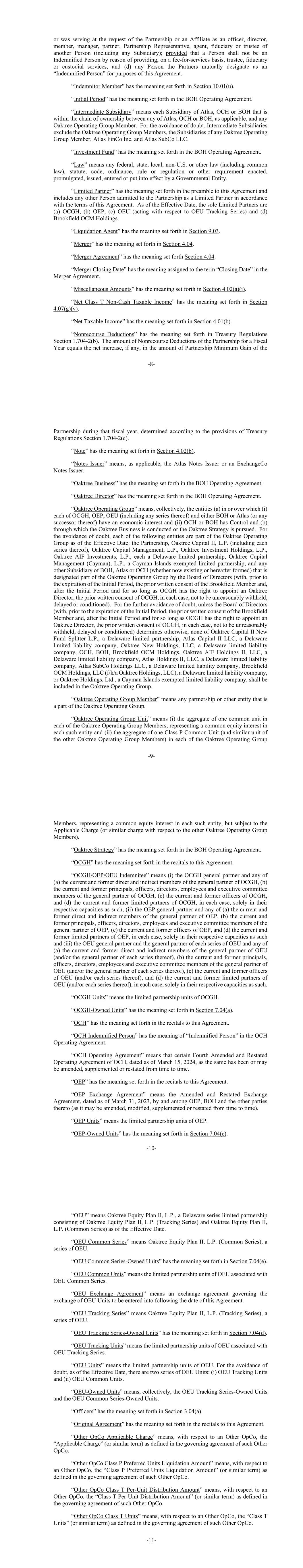 -8-或应合伙企业或关联企业的要求担任另一人(包括任何子公司)的高级职员、董事、成员、经理、合伙人、合伙企业代表、代理人、受托人或受托人;但一人不得因按服务收费提供受托人、受托人或保管服务而成为受弥偿人,以及(d)合伙人为本协议目的相互指定为“受弥偿人”的任何人。“赔偿成员”具有第10.01(u)节规定的含义。“初始期”具有BOH经营协议中规定的含义。“中间子公司”是指Atlas、OCH或BOH中的任何一家(如适用)与Oaktree运营集团的任何成员之间的所有权链中的Atlas、OCH或BOH的每一家子公司。为免生疑问,中间子公司不包括Oaktree运营集团成员、任何Oaktree运营集团成员的子公司、Atlas FinCo Inc.和Atlas SubCo LLC。“投资基金”具有《BOH经营协议》约定的含义。“法律”是指政府实体颁布、颁布、发布、进入或实施的任何联邦、州、地方、非美国或其他法律(包括普通法)、法规、法典、法令、规则或条例或其他要求。“有限合伙人”具有本协议序言中规定的含义,包括根据本协议条款作为有限合伙人被接纳为合伙企业的任何其他人。截至生效日期,唯一有限合伙人为(a)OCGH、(b)OEP、(c)OEU(就OEU追踪系列行事)和(d)Brookfield OCM Holdings。“清算代理人”具有第9.03节规定的含义。“合并”具有第4.04节规定的含义。“合并协议”具有第4.04条规定的含义。“合并截止日”具有合并协议中“截止日”一词赋予的含义。“杂项金额”具有第4.02(a)(i)节规定的含义。“净T类非现金应税收入”具有第4.07(g)(v)节规定的含义。“净应税收入”具有第4.01(b)节规定的含义。“无追索权扣除”具有财政部条例第1.704-2(b)节中规定的含义。合伙企业在一个财政年度的无追索权扣除金额等于根据《财务条例》第1.704-2(c)节的规定确定的该财政年度内-9-合伙企业的合伙企业最低收益金额的净增加额(如果有的话)。“注”具有第4.02(b)节规定的含义。“票据发行人”是指(如适用)Atlas票据发行人或ExchangeCo票据发行人。“Oaktree业务”具有BOH经营协议中规定的含义。“Oaktree Director”具有BOH经营协议中规定的含义。“Oaktree Operating Group”统称为(a)(i)OCGH、OEP、OEU中的每一个(包括其任何系列)以及BOH或Atlas(或其任何继任者)在其中或在其上拥有经济利益和(ii)OCH或BOH拥有控制权以及(b)开展Oaktree业务或推行Oaktree战略的实体。为免生疑问,截至生效日期,以下各实体均属于Oaktree Operating Group的一部分:合伙企业、Oaktree Capital II,L.P.(包括其各系列)、Oaktree Capital Management,L.P.、Oaktree Investment Holdings,L.P.、Oaktree AIF Investments,L.P.,各为特拉华州有限合伙企业、Oaktree Capital Management(Cayman),L.P.为开曼群岛豁免有限合伙企业,以及由董事会指定为Oaktree Operating Group一部分的任何其他子公司(无论是现在存在的还是以后成立的)(在初始期限届满之前,Brookfield成员的事先书面同意,以及在初始期过后且只要OCGH有权任命Oaktree董事,OCGH的事先书面同意,在每种情况下,不得被无理拒绝、延迟或附加条件)。为进一步免生疑问,除非董事会(在初始期限届满之前,获得Brookfield成员的事先书面同意,并且在初始期限之后,只要OCGH有权任命Oaktree董事,OCGH的事先书面同意,在每种情况下,不得被无理拒绝、延迟或附加条件)另有决定,否则Oaktree Capital II New Fund Splitter L.P.(特拉华州有限合伙企业)、Atlas Capital II LLC(特拉华州有限责任公司)、Oaktree New Holdings,LLC(特拉华州有限责任公司,OCH,BOH、Brookfield OCM Holdings、Oaktree 丨AIF Holdings II,LLC,一家特拉华州有限责任公司、Atlas Holdings II,LLC,一家特拉华州有限责任公司、Atlas SubCo Holdings LLC,一家特拉华州有限责任公司、Brookfield OCM Holdings, 特拉华州有限责任公司LLC(f/k/a Oaktree Holdings,LLC)或开曼群岛豁免有限责任公司Oaktree Holdings,Ltd.应被纳入Oaktree Operating Group。“Oaktree Operating Group Member”是指隶属于Oaktree Operating Group的任何合伙企业或其他实体。“Oaktree Operating Group Unit”是指(i)Oaktree Operating Group每个成员中一个共同单位的总和,代表每个此类实体的共同权益;(ii)Oaktree Operating Group每个-10-成员中一个P类共同单位(以及Oaktree Operating Group其他成员的类似单位)的总和,代表每个此类实体的共同权益,但须遵守适用的费用(或其他Oaktree Operating Group成员的类似费用)。“橡树战略”具有BOH经营协议中规定的含义。“OCGH”具有本协议独奏会中规定的含义。“OCGH/OEP/OEU受偿人”是指(i)OCGH普通合伙人和(a)OCGH普通合伙人的现任和前任直接和间接成员中的任何一个,(b)OCGH普通合伙人的现任和前任负责人、高级职员、董事、雇员和执行委员会成员,(c)OCGH的现任和前任高级职员,以及(d)OCGH的现任和前任有限合伙人,在每种情况下,仅以各自的身份,(ii)OEP普通合伙人和(a)OEP普通合伙人的现任和前任直接和间接成员中的任何一个,(b)OEP普通合伙人的现任和前任负责人、高级职员、董事、雇员和执行委员会成员,(c)OEP的现任和前任高级职员,以及(d)OEP的现任和前任有限合伙人,在每种情况下,仅以各自的身份和(iii)OEU普通合伙人和每个OEU系列的普通合伙人以及(a)OEU普通合伙人的现任和前任直接和间接成员(和/或每个系列的普通合伙人)中的任何一位,(b)现任和前任负责人、高级职员、董事,OEU普通合伙人(和/或其每一系列的普通合伙人)的雇员和执行委员会成员,(c)OEU(和/或其每一系列)的现任和前任高级职员,以及(d)OEU(和/