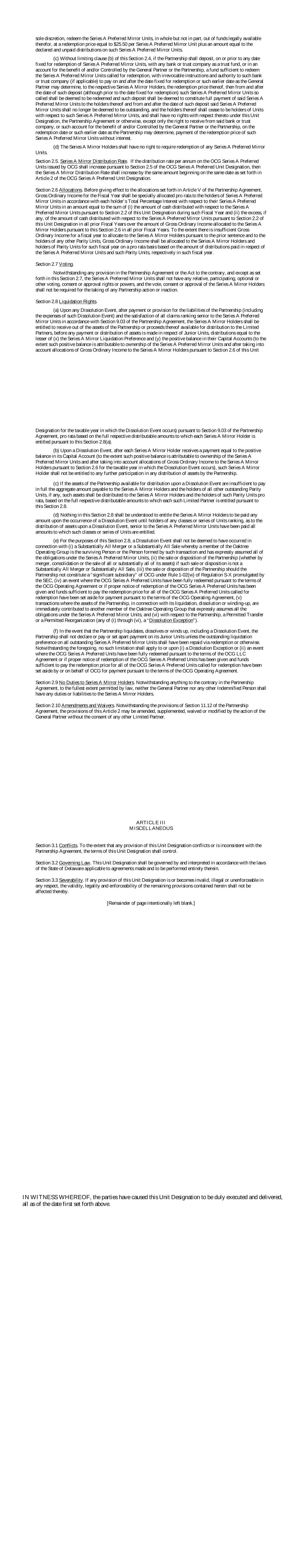 全权酌情从合法可用的资金中赎回全部而非部分A系列优先镜像单位,赎回价格等于每A系列优先镜像单位25.50美元加上等于此类A系列优先镜像单位已宣布和未支付的分配的金额。(c)在不限制本条第2.4条(b)款的情况下,如合伙企业须于任何订定赎回A系列优先镜像单位的日期或之前,将一笔足以赎回要求赎回的A系列优先镜像单位的资金存入任何银行或信托公司作为信托基金,或存入为普通合伙人或合伙企业的利益和/或控制的账户,向该银行或信托公司(如适用)发出不可撤销的指示和授权,在确定的赎回日期或普通合伙人可能确定的较早日期及之后向各自的A系列镜像持有人支付其赎回价格,则自该存款之日起及之后(尽管在确定的赎回日期之前),该等A系列优先镜像单位将被视为已赎回,而该等存款将被视为构成向该等A系列优先镜像单位的持有人全额付款,且自该存款日期起及之后,该等A系列优先镜像单位将不再被视为未偿还,其持有人将不再是该等A系列优先镜像单位的单位持有人,且根据本单位指定、合伙协议或其他方式,除仅有权在赎回日或合伙企业可能确定的较早日期从上述银行或信托公司,或为普通合伙人或合伙企业的利益和/或控制的账户收取该等A系列优先镜像单位的赎回价款而不计利息外,不得享有与此相关的权利。(d)A系列镜像持有人无权要求赎回任何A系列优先镜像单位。第2.5节。A系列镜像分发率。如果根据OCGTERM3 A系列优先份额指定的第2.5节的规定,由OCG发行的OCG A系列优先份额上的年化分配率应有所增加,则A系列镜像分配率应自TERM3 A系列优先份额指定第二条规定的同日开始增加相同数量。第2.6节拨款。在实施合伙协议第五条规定的分配之前,财政年度的普通收入毛额应根据每个持有人对其A系列优先镜像单位的总百分比权益,按比例特别分配给A系列优先镜像单位的持有人,金额等于(i)在该财政年度根据本单位指定第2.2节就A系列优先镜像单位分配的现金金额和(ii)超出部分(如有)之和,根据本单位指定第2.2节在以往所有财政年度分配给A系列优先镜像单位的现金数额超过以往所有财政年度根据本第2.6节分配给A系列镜像持有者的普通收入毛额的数额。如果一个财政年度的普通收入毛额不足以根据前一句分配给A系列镜像持有人和任何其他平价单位的持有人,则普通收入毛额应根据在该财政年度分别就A系列优先镜像单位和此类平价单位支付的分配金额,按比例分配给该财政年度的A系列镜像持有人和平价单位持有人。第2.7节投票。尽管在合伙协议或法案中有任何相反的规定,并且除本2.7节规定的情况外,A系列优先镜像单位不应拥有任何相对的、参与的、可选的或其他投票、同意或批准权利或权力,并且采取任何合伙行动或不作为不需要A系列镜像持有人的投票、同意或批准。第2.8节清算权。(a)在发生任何解散事件时,在根据合伙协议第9.03节支付或提供合伙企业的负债(包括此类解散事件的费用)并满足A系列优先镜像单位的所有优先债权后,A系列镜像持有人有权在就初级单位进行任何资产支付或分配之前,从合伙企业的资产或其可用于分配给有限合伙人的收益中获得收益, 根据合伙协议第9.03节,等于(x)A系列镜像清算优先权和(y)其资本账户中的正余额(在此种正余额可归因于A系列优先镜像单位的所有权并在考虑到根据本单位指定第2.6节为发生解散事件的纳税年度向A系列镜像持有人分配的普通收入毛额后)中较小者的分配,根据每个A系列镜像持有者根据本节2.8(a)有权获得的全部各自可分配金额,按比例分配。(b)一旦发生解散事件,在每个A系列镜像持有人收到相当于其资本账户中正余额的付款后(在此种正余额可归因于A系列优先镜像单位的所有权的范围内,并在考虑到根据第2.6节为发生解散事件的纳税年度分配给A系列镜像持有人的普通收入毛额后),该A系列镜像持有人将无权进一步参与合伙企业的任何资产分配。(c)如果合伙企业在解散事件时可供分配的资产不足以全额支付应付给A系列镜像持有人和所有其他未偿还平价单位(如有)的持有人的总额,则应根据每个此类有限合伙人根据本条第2.8款有权获得的各自可分配的全部金额,按比例将此类资产分配给A系列镜像持有人和此类平价单位的持有人。(d)本条第2.8条不得理解为有权在发生解散事件时向A系列镜像持有人支付任何款额,直至任何类别或系列单位排名的持有人就解散事件时的资产分配而言,优先于A系列优先镜像单位已获得该等类别或系列单位有权获得的所有款额。(e)就本条第2.8节而言,解散事件不得视为与(i)Oaktree Operating Group的成员为存续人或由该交易组成的人并已明确承担A系列优先镜像单位项下的所有义务的基本全部合并或基本全部出售有关,(ii)合伙企业的出售或处分(无论是通过合并,合并或出售其全部或几乎全部资产),如果此类出售或处置不是基本上全部合并或基本上全部出售,(iii)如果根据SEC颁布的S-X条例第1-02(w)条,合伙企业不构成OCG的“重要子公司”,则该合伙企业的出售或处置,(iv)凡OCG A系列优先单位已根据OCG经营协议的条款获得全额赎回的事件,或如已发出赎回OCG A系列优先单位的适当通知且足以支付所有要求赎回的TERM3 A系列优先单位的赎回价款的资金已根据OCG经营协议的条款拨出用于支付,(v)合伙企业的资产就其清算、解散或清盘进行的交易,立即向Oaktree Operating 