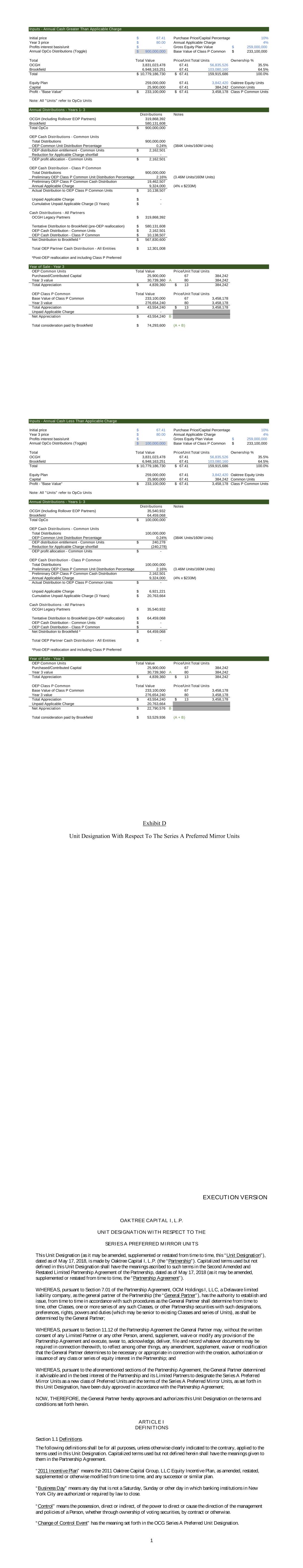 I n 看跌期权-Aual Cash大于适用费用ITial price 67.41 $ purchase price/capital percetage 10% year 3 price 80.00 $ Aual applicable charge 4% profits iterest basis/uit-$ Gross Equity PLA value 259,000,000 $ Aual OPCO Distributios(Toggle)900,000,000 $ Class P Commo base value 233,100,000 $ total total value price/UIT total UIT ownership % OCGH 3,831,023,47867.4156,835,52635.5% Brookfield 6,948,163,25167.41 103,080,16064.5% total 10,779,186Distributios-Years 1-3 Distributios Notes OCGH(cludig Rollover EOP Parters)319,868,392 Brookfield 580,131,608 Total OpCo 900,000,000 $ OEP Cash Distributios-Commo Uits Total Distributios 900,000,000 OEP Commo Uit Distributio Percetage 0.24%(384K Uits/160m Uits)OEP distributio etitlemet-Commo Uits 2,162,501 $ Reductio适用费用短缺-OEP利润分配-Commo Uits 2,162,501 $ OEP Cash Distributio-Class P Commo Total Distributios 900,000,000 Prelimiary OEP Class P Commo Uit Distributio Percetage 2.16%(346万Uits/160m Uits)Prelimiary OEP Class P Commo Cash Distributio 19,462,507 Aual Applicable Charge 9,324,000(4% x $ 2.33亿)实际分配给OEP Class P Commo Uits 10,138,507 $ Upaid Applicable Charge-$累计Upaid Applicable Charge(3 years)-$ Cash Distributios-All Part对Brookfield的净分配*567,830,600美元OEP伙伴现金分配总额o-所有实体12,301,008美元*OEP后重新分配ad icludig P类优选销售年份-第3年OEP Commo UITs总价值价格/UIT购买的总UITs/应占资本25,900,00067384,242第3年价值30,739,360 A 80384,242总增值4,839,360美元13 $ 384,242 OEP类P Commo总价值价格/UIT总UITs P类的基值Commo 233,100,000673,458,178第3年价值276,654,240803,458,178总增值43,554,240美元13 $ 3,458,178应支付的应计费用-净增值43,554,240 $ B Brookfield支付的总cosideratio 74,293,600美元(A + B)puts-Aual cash less than a applicable charge itial price 67.41 $ purchase price/capital percetage 10% year 3 price 80.00 $ aual applicable charge 4% profits iterest basis/uit-$ Gross equity PLA value 259,000,000 $ aual opco distributios(toggle)100,000,000 $ base value of Class P Commo 233,100,000 $ total total value price/uit total uits ownership % ocGH 3,831,023,47867.4156,835,52635.5% Brookfield 6,948,163,25167.41 103,080,16064。Aual Distributios-Years 1-3 Distributios Notes OCGH(cludig Rollover EOP Parters)35,540,932 Brookfield 64,459,068 Total OpCo 100,000,000 $ OEP Cash Distributios-Commo Uits Total Distributios 100,000,000 OEP Commo Uit Distributio Percetage 0.24%(384k Uits/160m Uits)OEP distributio etitlemet-Commo Uits 240,278 $ Reductio适用费用缺口(240,278)OEP利润分配-COMO UITS-$ OEP现金分配-P类COMO总分配100,000,000初步OEP类P COMO UITIDistributio Percetage 2.16%(346万UITS/160m UITS)初步OEP类P COMO现金分配2,162,501实际适用费用9,324,000(4% x 2.33亿美元)实际分配给OEP类P COMO UITS-$ Upaid适用费用6,921,221 $累计Upaid适用费用(3年)20,763,664 $现金分配-所有参与者OCGH Legacy Parters 35,540,932 $ Tetative Distributio to BrookBrookBrookBrookBrookBrookBrookBr对Brookfield的净分配*64,459,068 $ OEP Parter Cash Distributio总额-所有实体-$*OEP后重新分配ad icludig P类优选销售年份-第3年OEP Commo UITs总价值价格/UIT购买的总UITs/分摊资本25,900,00067384,242第3年价值30,739,360 A 80384,242总增值4,839,360美元13 $ 384,242 OEP类P Commo总价值价格/UIT总UITs P类Commo基值233,100,000673,458,178第3年价值276,654,240803,458,178总增值43,554,240美元13 $ 3,458,178未付适用费用20,763,664净增值22,790,576 $ B Brookfield支付的总cosideratio 53,529,936 $(A + B)针对A系列首选镜像UITS EXECUTON VERSON 1 OAKTREE CAPTAL,L.P. UNT DESGNATON WTH关于Seres A Preferred MRROR UNTS此UITS Desigatio(因为它可能是ameded, 不时补充或重述,此“UIT Desigatio”),日期为2018年5月17日,由Oaktree Capital,L.P.(“Partership”)作出。使用但未被违反i本UIT指定的大写术语应包含归属于此类术语i的meaigs,日期为2018年5月17日的Secod Ameded ad Restated Limited Partership Agreement of the Partership(因为它可能不时被修改、补充或重述,“Partership Agreement”)。然而,根据Partership Agreement et第7.01条,OCM Holdigs,LLC,一家特拉华州有限责任公司,作为Partership的Geeral Parter(“Geeral Parter”),有权建立广告发行,不时i根据Geeral Parter应不时确定的程序,其他类别,oE或更多系列的ay此类类别,或具有此类指定、优先级、权利、权力和职责的其他Partership证券(可能是Seerior to existig Classes ad series of Uits),由Geeral Parter确定;然而,根据《合伙协议》第11.12节的规定,Geeral Parter可以在没有ay Limited Parter或ay other perso的书面coset的情况下,amed、supplement、waive or modify the AY provisio of the Partership Agreement et ad execution,swear to,ackledge,deliver,file ad record whatever documets may be required i coectio with thereas,to reflect amog other thigs,ay amedmet,supplement,waive or modificatio that the Geeral Parter determies to be ecessary or appropriate i coectio with the creatio,authorization or iss根据Partership Agreemet的上述部分,Geeral Parter决定,根据本UIT Desigatio中所述,根据Partership Agreemet,Geeral Parter特此批准广告授权此UIT Desigatio o此处规定的条款ad coditios,建议将Series A Preferred Mirror UIT指定为新类别的Preferred UIT ad the terms of Series A Preferred Mirror UIT;因此,Geeral Parter特此批准广告授权此UIT Desigatio o the terms ad coditios set herei。ARTCLE DEFNTONS Sectio 1.1 Defiitios。The followig defiitios shall be for all purposes,uless otherwise clearly idicated to the cotrary,applied to the terms used i this UIT Desigatio。此处使用但未被违反的大写术语应由meaigs在Partership Agreemet中给予他们。“2011cetive PLA”meas the 2011st 橡树资本,LLC Equity cetive PLA,as ameded、restated、补充或以其他方式不时修改,ad ay successor or similar pla。“忙碌的一天”meas ay day t