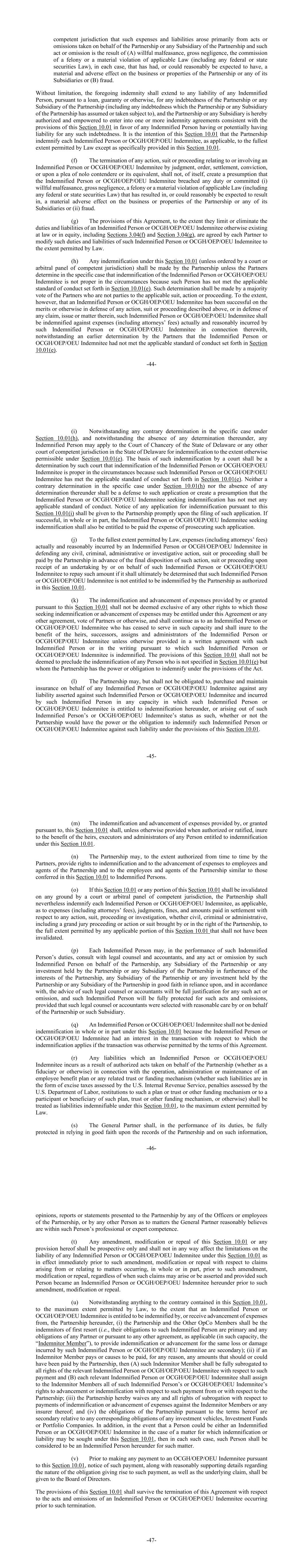 -44-有关管辖权,认为此类费用和责任主要来自代表合伙企业或合伙企业的任何子公司采取的作为或不作为,而此类作为或不作为是(a)故意渎职、重大过失、犯下重罪或严重违反适用法律(包括任何联邦或州证券法)的结果,在每种情况下,已经或可以合理预期会对合伙企业或其任何子公司的业务或财产产生重大不利影响,或(b)欺诈。在不受限制的情况下,上述弥偿应延伸至任何受弥偿人根据贷款、担保或其他方式就合伙企业或合伙企业的任何附属公司的任何债务(包括合伙企业或合伙企业的任何附属公司已承担或承担的任何债务)承担的任何责任,而合伙企业或任何附属公司在此获授权和授权订立一份或多份符合本条第10.01条规定的弥偿协议,以有利于对任何此类债务负有或可能负有责任的任何受弥偿人。本条第10.01款的意图是,合伙企业在法律允许的最大范围内(除本条第10.01款具体规定的情况外)酌情对每个受弥偿人或OCGH/OEP/OEU受弥偿人进行赔偿。(f)通过判决、命令、和解、定罪,或根据nolo竞争者或其同等人的抗辩,终止与或涉及受弥偿人或OCGH/OEP/OEU受弥偿人的任何诉讼、诉讼或程序,其本身不应造成推定,即受弥偿人或OCGH/OEP/OEU受弥偿人违反任何职责或犯下(i)故意渎职、重大过失、重罪或严重违反适用法律(包括任何联邦或州证券法),已导致或可合理预期将导致,对合伙企业或其任何子公司的业务或财产造成重大不利影响或(ii)欺诈。(g)本协议的规定,只要它们限制或消除了在法律上或股权上以其他方式存在的受保人或OCGH/OEP/OEU受保人的义务和责任,包括第3.04(f)节和第3.04(g)节,由每个合伙人同意在法律允许的范围内修改该受保人或OCGH/OEP/OEU受保人的此类义务和责任。(h)根据本条第10.01条作出的任何赔偿(除非由有管辖权的法院或仲裁小组下令)应由合伙企业作出,除非合伙人在特定情况下确定对受赔偿人或OCGH/OEP/OEU受赔偿人的赔偿在当时情况下是不适当的,因为该人未达到第10.01(e)条规定的适用行为标准。这种确定应由非适用诉讼、诉讼或程序当事方的合伙人以多数票作出。然而,如果受弥偿人或OCGH/OEP/OEU受弥偿人在上述任何诉讼、诉讼或程序的案情或其他方面的抗辩中获得胜诉,或在其中的任何索赔、问题或事项的抗辩中,该受弥偿人或OCGH/OEP/OEU受弥偿人应就该受弥偿人或OCGH/OEP/OEU受弥偿人实际和合理地产生的与此有关的费用(包括律师费)获得弥偿,尽管合伙人较早确定受弥偿人或OCGH/OEP/OEU受弥偿人未达到第10.01(e)节规定的适用行为标准。-45-(i)尽管根据第10.01(h)条在特定案件中作出任何相反的裁定,并且尽管没有根据该等裁定作出任何裁定,任何获弥偿者仍可向特拉华州衡平法院或特拉华州任何其他有管辖权的法院申请根据第10.01(e)条另有许可的范围内的赔偿。法院作出此种赔偿的基础,应是该法院认定,由于该受赔偿人或OCGH/OEP/OEU受赔偿人已符合第10.01(e)节规定的适用行为标准,因此在这种情况下,对该受赔偿人或OCGH/OEP/OEU受赔偿人的赔偿是适当的。根据第10.01(h)条在特定案件中作出的相反裁定或没有根据该条作出的任何裁定,均不应成为对该申请的抗辩,或产生一种推定,即寻求赔偿的受保人或OCGH/OEP/OEU受保人未达到任何适用的行为标准。根据本条第10.01(i)款提出的任何赔偿申请的通知,应在提出该申请后立即给予合伙企业。如果全部或部分成功, 寻求赔偿的受保人或OCGH/OEP/OEU受保人也有权获得起诉此类申请的费用。(j)在法律允许的最大范围内,受偿人或OCGH/OEP/OEU受偿人在为任何民事、刑事、行政或调查行动、诉讼或程序进行辩护时实际合理发生的费用(包括律师费),应由合伙企业在该行动的最终处置之前支付,在收到由该受偿人或OCGH/OEP/OEU受偿人或其代表作出的偿还该等款项的承诺后提起诉讼或进行法律程序,前提是最终应确定该受偿人或OCGH/OEP/OEU受偿人无权获得本第10.01条授权的合伙企业的赔偿。(k)由本条第10.01条提供或依据本条批给的费用的补偿及垫付,不得当作不包括寻求补偿或垫付费用的人士根据本协议或任何其他协议、合伙人的投票或其他方式可能有权享有的任何其他权利,并须继续作为已停止以该身分服务的获弥偿人或OCGH/OEP/OEU受弥偿人,并须为继承人、继任人的利益,获弥偿人或OCGH/OEP/OEU获弥偿人的受让人及管理人,除非与该获弥偿人订立的书面协议另有规定,或据此向该获弥偿人或OCGH/OEP/OEU获弥偿人作出弥偿的书面协议另有规定。本第10.01条的规定不应被视为排除第10.01(e)条未指明但合伙企业根据该法规定有权或有义务赔偿的任何人的赔偿。(l)合伙企业可以但无义务代表任何受弥偿人或OCGH/OEP/OEU受弥偿人购买和维持保险,以应对针对该受弥偿人或OCGH/OEP/OEU受弥偿人主张的任何责任,并由该受弥偿人以该受弥偿人或OCGH/OEP/OEU受弥偿人有权根据本协议获得赔偿的任何身份承担的任何责任,或因该受弥偿人或OCGH/OEP/OEU受弥偿人本身的身份而产生的任何责任,无论合伙企业是否有权或有义务就该条款下的该等责任向该受弥偿人或OCGH/OEP/OEU受弥偿人作出赔偿-46-(m)除非授权或批准时另有规定,否则由本第10.01条提供或依据本第10.01条批给的费用的补偿和垫付,对根据本第10.01条有权获得补偿的任何人的继承人、遗嘱执行人和管理人有利。(n)合伙企业可在合伙人不时授权的范围内,向合伙企业的雇员和代理人以及合伙企业的雇员和代
