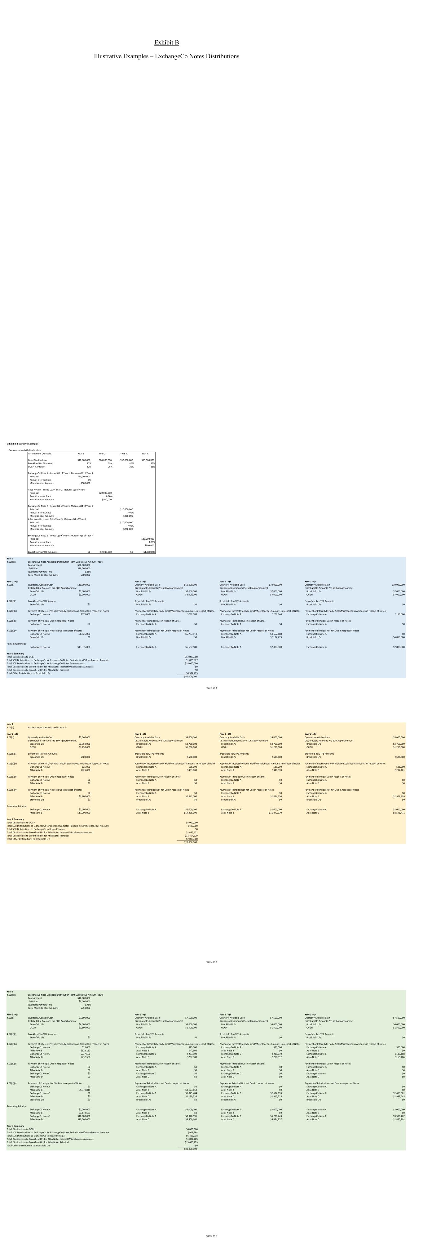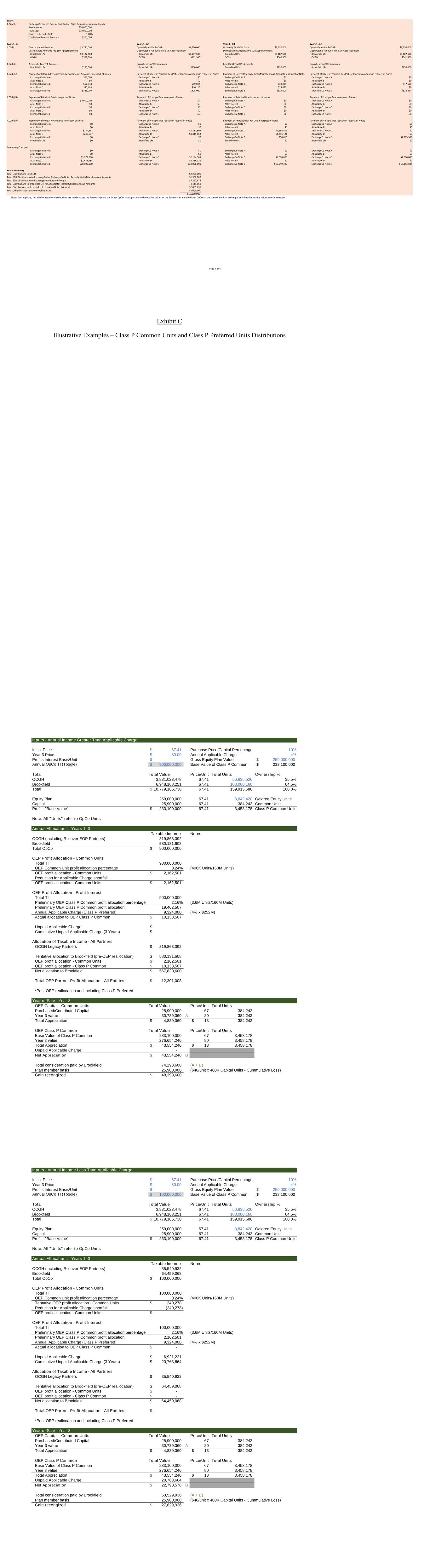 第4年4.02(a)(i)交易所注E:特别分配权累计金额投入基础金额$ 20,000,00090%上限$ 18,000,000季度定期收益率1.00%总杂项金额$ 500,000年第4至第1季第4至第2季第4至第3季第4至第4季4.02(b)季度可用现金$ 3,750,000季度可用现金$ 3,750,000季度可用现金$ 3,750,000季度可用现金$ 3,750,000可分配金额pre-SDR分配权可分配金额pre-SDR分配权可分配金额pre-SDR分配权可分配金额pre-SDR分配权Brookfield LPs $ 3,187,500 Brookfield LPs $ 3,187,500 Brookfield LPs $ 3,187,500 Brookfield LPs $ 3,187,500 Brook税/TPE金额Brookfield税/TPE金额Brookfield税/TPE金额Brookfield LPs $ 250,000Brookfield LPs $ 250,000Brookfield LPs $ 250,000Brookfield LPs $ 250,000Brookfield LPs $ 250,0004.02(b)(ii)利息支付/定期收益率/票据支付利息的杂项金额/定期收益率/票据支付利息的杂项金额/定期收益率/票据支付利息的杂项金额/票据交换票据的杂项金额A $ 25,000 ExchangeCo Note A $ 0 ExchangeCo Note A $ 0 ExchangeCo Note A $ 0 Atlas Note B $ 0 Atlas Note B $ 0 Atlas Note B $ 0 Atlas Note B $ 0 ExchangeCo Note C $ 638,229加元ExchangeCo票据17,500加元Atlas票据D 50,493加元Atlas票据D 46,126加元Atlas票据D 23,032美元Atlas票据D 0美元ExchangeCo票据E 325,000美元ExchangeCo票据E 325,000美元ExchangeCo票据E 325,000美元ExchangeCo票据E 325,000美元ExchangeCo票据E 324,4944.02(b)(iii)就票据支付到期本金就票据支付到期本金就票据支付到期本金就票据支付到期本金A 2,000,000美元ExchangeCo票据A 0美元ExchangeCo票据A 0美元ExchangeCo票据A 0美元Atlas票据B 0美元Atlas票据B 0美元Atlas票据B 0美元Atlas Note B $ 0 ExchangeCo Note C $ 0 ExchangeCo Note C $ 0 ExchangeCo Note C $ 0 ExchangeCo Note C $ 0 Atlas Note D $ 0 Atlas Note D $ 0 Atlas Note D $ 0 ExchangeCo Note E $ 0 ExchangeCo Note E $ 0 ExchangeCo Note E $ 0 ExchangeCo Note E $ 0 ExchangeCo Note E $ 04.02(b)(iv)就票据支付尚未到期的本金就票据支付尚未到期的本金就票据支付尚未到期的本金就票据支付尚未到期的本金ExchangeCo Note A $ 0 ExchangeCo NoteA $ 0 ExchangeCo Note A $ 0 ExchangeCo Note A $ 0 Atlas Note B $ 0 Atlas Note B $ 0 Atlas Note B $ 0 ExchangeCo Note C $ 224,557 ExchangeCo Note C $ 1,187,697 ExchangeCo Note C $ 1,184,509 ExchangeCo Note C $ 0 Atlas Note D $ 249,507 Atlas Note D $ 1,319,663 Atlas Note D $ 1,316,121 Atlas Note D $ 0 ExchangeCo Note E $ 0 ExchangeCo Note E $ 0 ExchangeCo Note E $ 50,610 ExchangeCo Note E $ 2,595,506 Brookfield LPs 0 Brookfield LPs 0 Brookfield LPs 0 Brookfield L$0 ExchangeCo Note A $ 0 Atlas Note B $ 0 Atlas Note B $ 0 Atlas Note B $ 0 ExchangeCo Note C $ 3,372,206 ExchangeCo Note C $ 2,184,509 ExchangeCo Note C $ 1,000,000 ExchangeCo Note C $ 1,000,000 Atlas Note D $ 2,635,784 Atlas Note D $ 1,316,121 Atlas Note D $ 0 Atlas Note D $ 0 ExchangeCo Note E $ 20,000,000 ExchangeCo Note E $ 20,000,000 ExchangeCo Note E $ 19,949,390 ExchangeCo Note E $ 17,353,884 Year 4 Summary Total Distributions to OCGH $ 2,250,000 Total SDRExchangeCo Notes定期收益率/杂项金额1,502,180美元向ExchangeCo分配的SDR总额偿还本金7,242,878美元向Brookfield LP分配的Atlas Notes利息/杂项金额119,651美元向Brookfield LP分配的Atlas Notes本金总额2,885,291美元向Brookfield LP分配的其他分配总额1,000,000美元15,000,000美元注:为简单起见,本展览假设在整个合伙企业和其他运营公司之间按照第一次交换时合伙企业和其他运营公司的相对价值的比例进行分配, And thattherelativevaluesremainconstantPage4of4ExhibitCIllustrativeExamples – classPCommonunitsandClassPPreferredUnitsDistributionsInputs-AnnualIncomeGreaterthanApplicableChargeInitialPrice67.41 $ PurchasePrice/CapitalPercentage10 % Year3Price80.00 $ AnnualApplicableCharge4 % ProfitsInterestBasis/Unit-$ GrossEquityPlanValue259,000,000 $ AnnualOpCoTI(Toggle)900,000,000 $ BaseValueofClassPCommon233,100,*OEP-pre-locationandincludingclassPPreferredYearofSale-Year3oEPCapital-CommonunitsTotalValuePrice/UnitTotalUnitsPurchased/ContributedCapital25,900,00067384,242Year3value30,739,360A80384,242TotalAppreciation4,839,360 $ 13 $ 384,242OEPClassPCommonTotalValuePrice/unitTotalUnitsBaseValueofClassPCommon233,100,000673,458,178year3value276,654,240803,458,178totalAppreciation43,554,240 $ 13 $ 3,458,178UnpaidApplicableCharge-NetAppreciation43,554,240 $ BTotalConsiderationpaidbyBrookfield 74,293,600(A + B)Planmemberbasis25,900,000($ 40/unitx400KCapitalUnits-CumulativeLoss)gainrecongized48,393,600 $ Inputs-AnnualInc*首次公开募股后重新定位和包括gClassPPreferredYearofSale-Year3oEPCapital-CommonunitsTotalValuePrice/UnitTotalUnitsPurchased/ContributedCapital25,900,00067384,242Year3value30,739,360A80384,242TotalAppreciation4,839,360 $ 13 $ 384,242OEPClassPCommonTotalValuePrice/UnitTotalUnitsBaseValueofClassPCommon233,100,000673,458,178Year3value276,654,240803,458,178TotalAppreciation43,554,240 $ 13 $ 3,458,