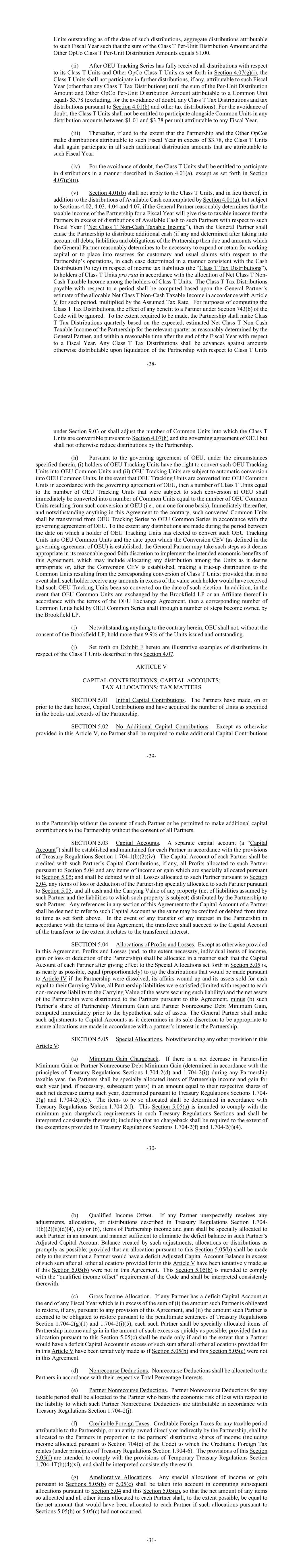 -28-截至此类分配之日未偿还的单位,归属于该财政年度的总分配,使得每单位T类分配金额和其他OPCO每单位T类分配金额之和等于1.00美元。(ii)在OEU Tracking Series完全收到第4.07(g)(i)节规定的关于其T类单位和其他OPCO T类单位的所有分配后,T类单位不得参与归属于该财政年度的任何进一步分配(任何T类税收分配除外),直到归属于一个普通单位的每单位分配金额和其他OPCO每单位分配金额之和等于3.78美元(为免生疑问,不包括根据第4.01(b)节的任何T类税收分配和税收分配以及其他税收分配)。为免生疑问,T类单位无权与普通单位一起参与归属于任何财政年度的每单位1.01美元至3.78美元之间的任何分配金额。(iii)此后,如果合伙企业和其他运营公司进行的归属于该财政年度的分配超过3.78美元,则T类单位应再次参与归属于该财政年度的所有此类额外分配金额。(iv)为免生疑问,T类单位有权以第4.01(a)条所述方式参与分派,但第4.07(g)(ii)条所规定的除外。(v)第4.01(b)节不适用于T类单位,取而代之的是,除了第4.01(a)节设想的可用现金分配外,但须遵守第4.02、4.03、4.04和4.07节,如果普通合伙人合理地确定合伙企业在一个财政年度的应税收入将为合伙人带来超过在该财政年度向此类合伙人分配的可用现金的应税收入(“净T类非现金应税收入”),然后,普通合伙人应促使合伙企业就所得税负债(“T类税收分配”)分配额外现金(如有,并在考虑到合伙企业当时到期的所有债务、负债和义务以及普通合伙人合理地确定为支出或保留营运资金或为与合伙企业运营相关的习惯和通常债权存入准备金所必需的金额后确定),按照T类单位持有人之间的T类非现金应纳税所得额净额分配比例向T类单位持有人发放。某一期间应付的T类税收分配应根据普通合伙人根据第五条对该期间的可分配净T类非现金应纳税所得额的估计,乘以假定税率计算。出于计算T类税收分配的目的,《守则》第743(b)条规定的对合作伙伴的任何好处的影响将被忽略。在要求作出的范围内,合伙企业应根据普通合伙人合理确定的相关季度合伙企业的预期、估计净T类非现金应纳税所得额,并在相对于一个会计年度的会计年度结束后的合理时间内,按季度进行T类税收分配。任何T类税收分配应是根据第9.03条就T类单位-29-在合伙企业清算时以其他方式分配的金额的预付款,或应根据第4.07(h)条和OEU的管理协议调整T类单位可转换成的普通单位的数量,但不得以其他方式减少合伙企业的分配。(h)根据OEU的管理协议,在其中规定的情况下,(i)OEU追踪单位的持有者有权将此类OEU追踪单位转换为OEU共同单位,以及(ii)OEU追踪单位可自动转换为OEU共同单位。如果根据OEU的管理协议将OEU追踪单位转换为OEU共同单位,则相当于在OEU进行此类转换的OEU追踪单位数量的若干T类单位应立即转换为相当于在OEU进行此类转换产生的OEU共同单位数量的若干共同单位(即在一对一基础上)。紧随其后,尽管本协议中有任何相反的规定, 此类转换的共同单位应根据OEU的管理协议从OEU跟踪系列转移到OEU共同系列。如果在OEU追踪单位持有人选择将此类OEU追踪单位转换为OEU共同单位之日至转换CEV(定义见OEU管理协议)成立之日之间的期间内进行了任何分配,则普通合伙人可根据其合理的善意酌处权采取其认为适当的步骤,以实现本协议的预期经济利益,其中可能包括在其认为适当的情况下在各单位之间分配任何分配,或在转换CEV成立后,对因相应转换T类单位而产生的普通单位进行校准分配;但在任何情况下,该持有人均不得收到超过该持有人在该选择之日如此转换该等OEU跟踪单位本应收到的价值的任何金额。此外,如果OEU共同单位由Brookfield LP或其关联公司根据OEU交换协议的条款进行交换,则OEU共同系列持有的相应数量的共同单位应通过多个步骤成为Brookfield LP拥有。(i)尽管本文有任何相反规定,未经Brookfield LP同意,OEU不得持有已发行和未偿还单位的9.9%以上。(j)本协议中列于附件 F的是关于本节4.07中所述T类单位的分配的说明性示例。第五条出资;资本账户;税收分配;税务事项第5.01款初始出资。合伙人已在本协议日期或之前作出出资,并已获得合伙企业账簿和记录中规定的单位数量。第5.02节不追加出资。除本第五条另有规定外,不得要求任何合伙人未经该合伙人同意向合伙企业追加出资-30-或未经全体合伙人同意获准向合伙企业追加出资。第5.03款资本账户。应根据《财务条例》第1.704-1(b)(2)(四)节的规定,为每个合伙人建立和维持一个单独的资本账户(“资本账户”)。每个合伙人的资本账户应记入该合伙人的出资(如有)、根据第5.04节分配给该合伙人的所有利润以及根据第5.05节特别分配的任何收入或收益项目;并应记入根据第5.04节分配给该合伙人的所有损失、根据第5.05节特别分配给该合伙人的合伙企业的任何损失或扣除项目的借方,以及合伙企业分配给该合伙人的所有现金和任何财产的账面价值(扣除该合伙人承担的负债和该财产承担的负债)。本协议任何部分中对合伙人资本账户的任何提述均应被视为是指上述可能不时贷记或借记的资本账户。如根据本协议条款转让合伙企业的任何权益,受让方应在与所转让权益相关的范围内继承转让方的资本账户。第5.04款损益分配。除本协议另有规定外,利润和损失(以及在必要情况下,合伙企业的个别收入、收益或损失或扣除项目)