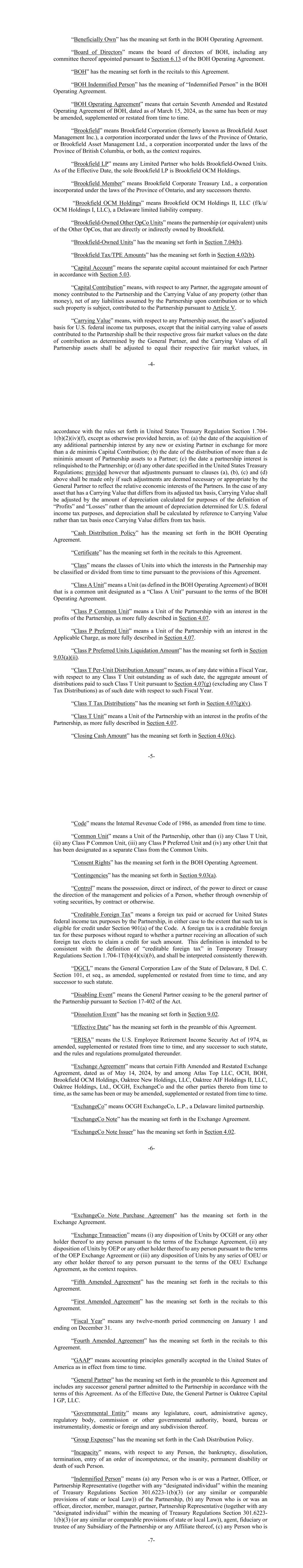 -4-“实益拥有”具有《BOH经营协议》载明的含义。“董事会”指BOH的董事会,包括其根据《BOH经营协议》第6.13节任命的任何委员会。“BOH”具有本协议说明中所述的含义。“BOH受弥偿人”在BOH经营协议中具有“受弥偿人”的含义。“BOH经营协议”指日期为2024年3月15日的某些经第七次修订及重述的BOH经营协议,因为该协议已或可能会不时修订、补充或重述。“Brookfield”是指Brookfield Corporation(前身为Brookfield Asset Management Inc.),一家根据安大略省法律注册成立的公司,或Brookfield Asset Management Ltd.,一家根据不列颠哥伦比亚省法律注册成立的公司,或两者兼而有之,视文意而定。“Brookfield LP”是指持有Brookfield拥有的单位的任何有限合伙人。截至生效日期,唯一的Brookfield LP为Brookfield OCM Holdings。“Brookfield会员”是指Brookfield Corporate Treasury Ltd.,一家根据安大略省法律注册成立的公司,以及该公司的任何继任者。“Brookfield OCM Holdings”是指Brookfield OCM Holdings II,LLC(f/k/a/OCM Holdings I,LLC),一家特拉华州有限责任公司。“布鲁克菲尔德拥有的其他运营公司单位”是指其他运营公司的合伙(或同等)单位,由布鲁克菲尔德直接或间接拥有。“布鲁克菲尔德拥有的单位”具有第7.04(b)节规定的含义。“布鲁克菲尔德税/TPE金额”具有第4.02(b)节规定的含义。“资本账户”是指根据第5.03节为每个合伙人维护的单独资本账户。“出资”是指,就任何合伙人而言,向合伙企业出资的资金总额和任何财产(金钱除外)的账面价值,扣除合伙企业在出资时承担的任何负债或此类财产受其约束,根据第五条向合伙企业出资。“账面价值”是指,就任何合伙企业资产而言,该资产用于美国联邦所得税目的的调整基础,除向合伙企业出资的资产的初始账面价值应为其各自在出资之日由普通合伙人确定的公允市场总值外,所有合伙企业资产的账面价值应根据美国财政部条例第1.704-1(b)(2)(iv)(f)节规定的规则,按照-5-调整为等于其各自的公允市场价值,除非本文另有规定,截至:(a)任何新的或现有的合伙人获得任何额外的合伙权益以换取超过微量出资的日期;(b)向合伙人分配超过微量的合伙资产的日期;(c)合伙权益被放弃给合伙的日期;或(d)美国财政部条例规定的任何其他日期;但前提是根据(a)、(b)条进行的调整,(c)和(d)只有在普通合伙人认为有必要或适当进行此类调整以反映合伙人的相对经济利益时,才应作出上述调整。在任何资产的账面价值与其调整后的计税基础不同的情况下,账面价值应根据为“利润”和“损失”定义而计算的折旧额而不是为美国联邦所得税目的确定的折旧额进行调整,一旦账面价值与计税基础不同,则应参照账面价值而不是计税基础计算折旧。“现金分配政策”具有《BOH经营协议》中规定的含义。“证书”具有本协议独奏会中规定的含义。“类”是指根据本协议的规定,合伙企业中的权益可能不时被分类或分割成的单位类别。“A类单位”是指BOH的一个单位(定义见BOH经营协议),该单位是根据BOH经营协议条款指定为“A类单位”的普通单位。“P类共同单位”是指在合伙企业利润中拥有权益的合伙企业单位,详见第4.07节。“P类优先单位”是指合伙企业中在适用费用中拥有权益的单位,详见第4.07节。“P类优先股清算金额”具有第9.03(a)(ii)节中规定的含义。“T类每单位分配金额”是指,在一个财政年度内的任何日期,就截至该日期尚未偿还的任何T类单位而言, 根据第4.07(g)节向该T类单位支付的分配总额(不包括任何T类税收分配)截至该日期就该财政年度而言。“T类税收分配”具有第4.07(g)(v)节规定的含义。“T类单位”是指在合伙企业的利润中拥有权益的合伙企业单位,详见第4.07节。“期末现金金额”具有第4.03(c)节中规定的含义。-6-“法典”是指经不时修订的1986年《国内税收法典》。“共同单位”是指合伙企业的一个单位,但(i)任何T类单位、(ii)任何P类共同单位、(iii)任何P类优先单位和(iv)任何其他已被指定为与共同单位分开的类别的单位除外。“同意权”具有BOH经营协议中规定的含义。“或有事项”具有第9.03(a)节规定的含义。“控制”是指拥有直接或间接的权力,以指导或导致一个人的管理和政策的方向,无论是通过投票证券的所有权,还是通过合同或其他方式。“可抵税的外国税款”是指合伙企业为美国联邦所得税目的支付或应计的外国税款,在任何一种情况下,只要此类税款符合《守则》第901(a)条规定的抵免条件。外国税收是出于这些目的的可抵免的外国税收,而不考虑获得此类外国税收分配的合作伙伴是否选择就此类金额申请抵免。这一定义旨在与临时国库条例第1.704-1T(b)(4)(xi)(b)节中“可贷记外国税收”的定义保持一致,并应与之一致解释。“DGCL”是指美国特拉华州的一般公司法,8 Del。C.不时修订、补充或重述的第101条等,以及此类法规的任何继承者。“致残事件”是指根据该法案第17-402条,普通合伙人不再是合伙企业的普通合伙人。“解散事件”具有第9.02节规定的含义。“生效日期”具有本协议序言部分规定的含义。“ERISA”是指经不时修订、补充或重述的1974年美国《雇员退休收入保障法》,以及该法规的任何继承者,以及据此颁布的规则和条例。“交换协议”指由Atlas Top LLC、OCH、BOH、Brookfield OCM Holdings、Oaktree New Holdings,LLC、Oaktree AIF Holdings II,LLC、Oaktree Holdin