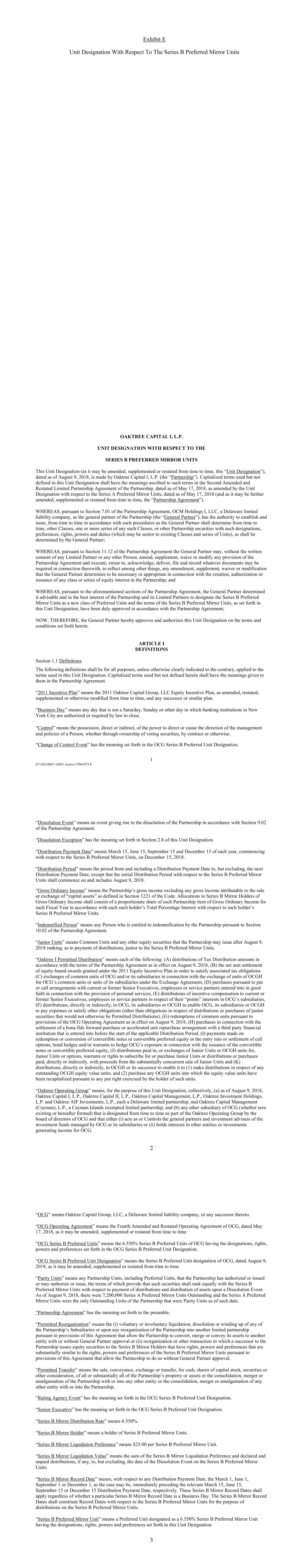 关于B系列优选镜像单元1 071565-0087-16881-Active.27041975.8 OAKTREE CAPITAL I,L.P.关于B系列优选镜像单元的单元指定此单元指定(可能会不时修订、补充或重述,此“单元指定”),日期为2018年8月9日,由Oaktree Capital I,L.P.(“合伙企业”)作出。本单位指定中使用但未定义的大写术语应具有截至2018年5月17日经单位指定就A系列优先镜像单位修订的截至2018年5月17日的合伙企业第二次经修订和重述的有限合伙协议中这些术语所赋予的含义(以及可能不时进一步修订、补充或重述的“合伙协议”)。鉴于根据合伙协议第7.01节,OCM Holdings I,LLC,一家特拉华州有限责任公司,作为合伙企业的普通合伙人(“普通合伙人”),有权根据普通合伙人不时确定的程序,建立和发行其他类别、任何此类类别的一个或多个系列,或由普通合伙人确定的具有此类指定、优惠、权利、权力和义务(可能优先于现有类别和系列单位)的其他合伙证券;然而,根据合伙协议第11.12条,普通合伙人可在未经任何有限合伙人或任何其他人书面同意的情况下,修订、补充、放弃或修改合伙协议的任何条款,并执行、宣誓、承认、交付、归档和记录与此相关可能需要的任何文件,以反映普通合伙人认为与合伙企业的任何类别或系列股权的创建、授权或发行有关的任何必要或适当的任何修订、补充、放弃或修改;而鉴于,根据合伙协议的上述章节,普通合伙人认为将B系列优先镜像单位指定为新的优先单位类别并符合合伙企业及其有限合伙人的最佳利益是可取的,并且本单位指定中规定的B系列优先镜像单位的条款已根据合伙协议获得正式批准;因此,普通合伙人特此根据此处规定的条款和条件批准并授权此单位指定。第一条定义第1.1节定义。以下定义应适用于所有目的,除非另有明确相反说明,适用于本单位名称中使用的术语。此处使用但未定义的大写术语应具有合伙协议中赋予它们的含义。“2011年激励计划”指经不时修订、重述、补充或以其他方式修改的2011年橡树资本,LLC股权激励计划及任何后续或类似计划。“营业日”是指不是纽约市银行机构被授权或法律要求关闭的周六、周日或其他日子的任何一天。“控制”是指拥有直接或间接的权力,以指导或导致一个人的管理和政策的方向,无论是通过投票证券的所有权,还是通过合同或其他方式。“控制权变更事件”具有OCG B系列优选单位名称中规定的含义。2“解散事件”是指根据合伙协议第9.02条导致合伙企业解散的事件。“解散例外”具有本单位名称第2.8节规定的含义。“分配付款日期”是指每年的3月15日、6月15日、9月15日和12月15日,就B系列优先镜像单元而言,于2018年12月15日开始。“分配期”是指从(包括)分配付款日期到(但不包括)下一个分配付款日期的期间,但B系列优先镜像单位的初始分配期应于8月9日开始并包括在内, 2018.“普通总收入”是指合伙企业的总收入,不包括《守则》第1221条所定义的“资本资产”出售或交换的任何总收入。分配给B系列镜像持有人的普通收入毛额应包括该财政年度每个普通收入毛额合伙项目的按比例份额,按照每个此类持有人相对于该持有人的B系列优先镜像单位的总百分比权益。“受偿人”指根据合伙协议第10.02条有权获得合伙企业赔偿的任何人。“初级单位”是指合伙企业在2018年8月9日之后可能发行的普通单位和任何其他股本证券,就分配的支付而言,低于B系列优先镜像单位。“Oaktree I Permitted Distribution”指以下各项:(A)根据于2018年8月9日生效的合伙协议条款分配税收分配金额,(B)为履行相关纳税义务而根据2011年股权激励计划授予的基于股权的奖励的净单位结算(C)就根据交换协议将OCGH的单位交换为OCG的普通单位或其子公司的普通单位,(d)根据与现任或前任高级管理人员、雇员或服务伙伴就提供个人服务善意订立的看跌期权或看涨期权安排进行购买,(e)就其在OCG子公司的“积分”权益向现任或前任高级管理人员、雇员或服务合作伙伴分配激励薪酬,(f)直接或间接向OCG、其子公司或OCGH进行分配,以使OCG、其子公司或OCGH能够支付费用或履行其他义务(有关分配的义务或购买初级证券的义务除外,否则不会被允许分配),(g)根据2018年8月9日生效的《OCG经营协议》的规定赎回普通单位,(h)与在适用的分配期开始前与第三方金融机构订立的善意远期购买或加速单位回购安排的结算有关的购买,(i)就赎回或转换可转换票据或可转换优先股或订立或结算看涨期权而支付的款项,债券对冲和/或认股权证以对冲OCG与发行可转换票据或可转换优先股有关的风险,(J)以初级单位或OCGH单位支付的分派,或以初级单位或OCGH单位交换初级单位或期权、认股权证或认购或购买初级单位的权利,或以基本上同时出售初级单位的收益直接或间接支付的分派或购买,以及(K)直接或间接向OCGH或其继任者进行的分派,以使其能够(1)就任何未偿还的OCGH股权价值单位进行分派,及(2)购买根据该等单位持有人行使的任何认沽权而将权益价值单位进行资本重组的任何OCGH单位。“Oaktree Operating Group”是指,就本单位指定而言,(a)截至2018年8月9日,Oaktree Capital I,L.P.、Oaktree Capital II,L.P.、Oaktree Capital Management,L.P.、Oaktree Investment Holdings,L.P.及Oaktree AIF Investments,L.P.各自为特拉华州有限合伙企业,Oaktree Capital Management(Cayman),L.P.为开曼群岛豁免有限合伙企业,及(b)由OCG董事会不时