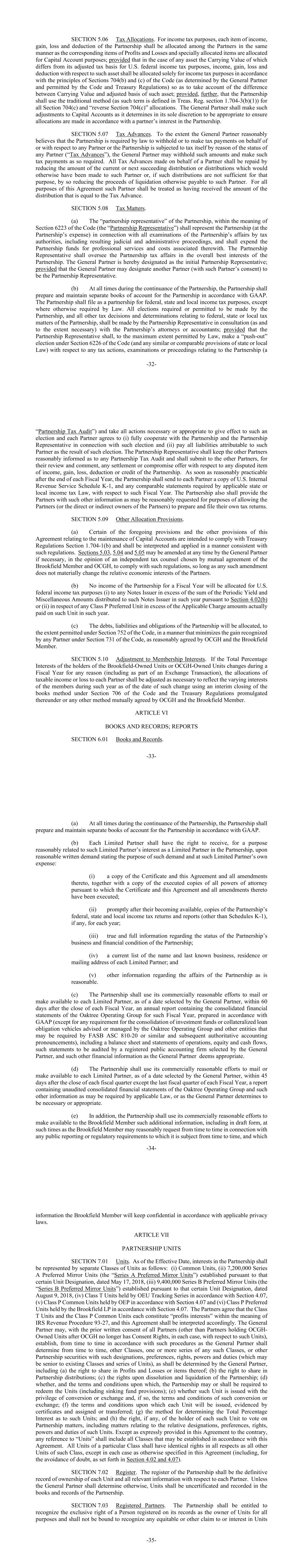 -32-第5.06款税收分配。为所得税目的,合伙企业的每一项收入、收益、损失和扣除,应在合伙人之间按照为资本账户目的分配相应的损益项目和特别分配项目的相同方式进行分配;但如果任何资产的账面价值与其为美国联邦所得税目的调整的税基不同,则收入、收益、与该资产有关的损失和扣除应仅根据《守则》第704(b)和(c)节的原则(由普通合伙人确定并经《守则》和《财务条例》允许)分配所得税,以便考虑到该资产的账面价值和调整后基础之间的差异;此外,前提是合伙企业应使用传统方法(该术语在Treas Reg.section 1.704-3(b)(1)中定义)进行所有第704(c)节和“反向第704(c)节”分配。普通合伙人应自行决定对资本账户进行适当的调整,以确保按照合伙人在合伙企业中的利益进行分配。第5.07款预缴税款。如果普通合伙人合理地认为法律要求合伙企业代为或就任何合伙人代扣代缴税款或合伙企业自身因任何合伙人的地位而需缴纳税款(“预缴税款”),则普通合伙人可以按要求代扣该等款项并缴纳该等税款。代表合伙人进行的所有预缴税款应通过减少本应向该合伙人进行的当前或下一个后续分配或分配的金额来偿还,或者,如果此类分配不足以用于该目的,则通过减少以其他方式应支付给该合伙人的清算收益来偿还。就本协议的所有目的而言,该合作伙伴应被视为已收到与预缴税款相等的分配金额。第5.08节税务事项。(a)《守则》第6223条含义内的合伙企业“合伙代表”(“合伙代表”)应代表合伙企业(由合伙企业承担费用)参与税务机关对合伙企业事务的所有审查,包括由此产生的司法和行政程序,并应将合伙企业的资金用于专业服务和与之相关的费用。合伙企业代表应根据合伙企业的整体最佳利益监督合伙企业的税务事务。特此指定普通合伙人为首次合伙代表;条件是普通合伙人可指定另一名合伙人(经该合伙人同意)担任合伙代表。(b)在合伙企业存续期间的任何时候,合伙企业应根据公认会计原则为合伙企业编制和保存单独的账簿。除法律另有规定外,合伙企业应为联邦、州和地方所得税目的作为合伙企业进行备案。合伙企业要求或允许进行的所有选举,以及与合伙企业的联邦、州或地方税务事项有关的所有其他税务决定和决定,应由合伙企业代表与合伙企业的律师或会计师协商(必要时并在必要范围内)作出;但合伙企业代表应在法律允许的最大范围内,根据《守则》第6226条(以及州或地方法律的任何类似或类似规定)就任何税务行动进行“推出”选举,与合伙企业有关的审查或程序(-33-“合伙企业税务审计”),并采取一切必要或适当的行动以使此类选举生效,并且每个合伙人同意(i)就此类选举与合伙企业和合伙企业代表充分合作,以及(ii)支付由于此类选举而归属于该合伙人的所有负债。合伙企业代表应就任何合伙企业税务审计向其他合伙人保持合理的信息,并应就合伙企业的任何收入、收益、损失、扣除或信用争议项目向其他合伙人提交任何和解或妥协要约,供其审查和评论。在每个财政年度结束后,合伙企业应在合理可行的范围内尽快向每个合伙人发送一份美国国税局附表K-1的副本,以及适用的州或地方所得税法要求的任何可比报表, 关于这样的财政年度。合伙企业还应向合伙人提供合理要求的其他信息,以便允许合伙人(或合伙人的直接或间接所有者)编制和提交自己的纳税申报表。第5.09节其他分配规定。(a)上述某些条款和本协定有关维持资本账户的其他条款旨在遵守《财务条例》第1.704-1(b)节,并应以符合这些条例的方式加以解释和适用。根据Brookfield成员和OCGH共同协议选择的独立税务顾问的意见,普通合伙人可在必要时随时修订第5.03、5.04和5.05条,以遵守此类规定,只要任何此类修订不会实质性改变合伙人的相对经济利益。(b)合伙企业在一个财政年度的收入将不会分配给任何票据发行人用于美国联邦所得税目的(i)超过根据第4.02(b)或(ii)条就任何P类优先单位在该年度分配给该票据发行人的定期收益率和杂项金额之和,超过该年度实际支付给该单位的适用费用金额。(c)合伙企业的债务、负债和义务将在《守则》第752条允许的范围内,按照OCGH和Brookfield成员合理同意的方式,以尽量减少任何合伙人根据《守则》第731条确认的收益的方式进行分配。第5.10节对会员权益的调整。如果Brookfield拥有的单位或OCGH拥有的单位的持有人的总百分比权益在一个财政年度内因任何原因发生变化(包括作为交换交易的一部分),则应根据需要调整分配给每个合伙人的应税收入或亏损,以反映截至该变化之日的该年度内成员的不同利益,使用《守则》第706节和据此颁布的《财务条例》下的临时结账方法或OCGH与Brookfield成员共同商定的任何其他方法。第六条账簿和记录;报告第6.01款账簿和记录。-34-(a)在合伙企业存续期间的任何时候,合伙企业应按照公认会计原则为合伙企业编制和保存单独的账簿。(b)每个有限合伙人应有权根据合理的书面要求,并由该有限合伙人自费,出于与该有限合伙人作为有限合伙人在合伙企业中的利益合理相关的目的,收取:(i)一份证书和本协议及其所有修订的副本,连同一份已签署的所有授权书的副本,据此,证书和本协议及其所有修订均已签署;(ii)在获得这些副本后立即收到合伙企业的联邦,每年的州和地方所得税申报表和报告(附表K-1除外)(如有);(