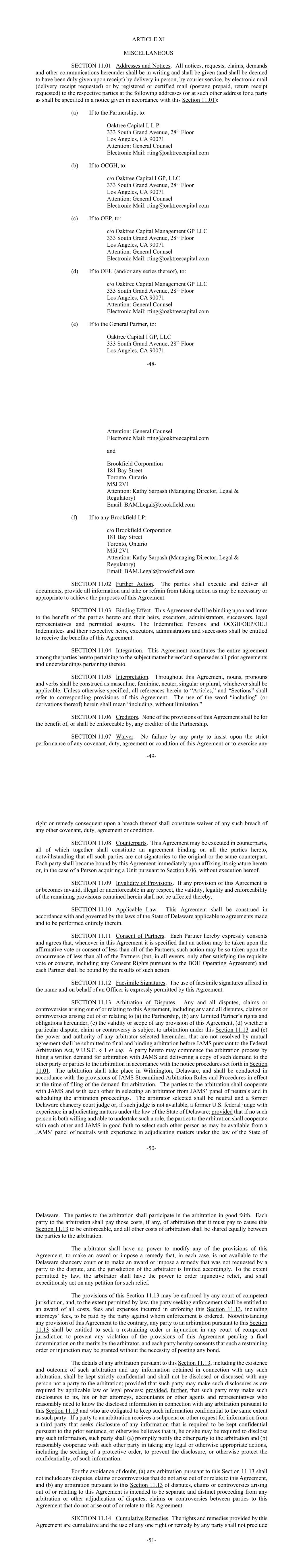 -48-第一条XI杂项第11.01款地址和通知。本协议项下的所有通知、请求、索赔、要求和其他通信均应以书面形式发出,并应以亲自送达、快递服务、电子邮件(要求的交货收据)或挂号或挂号邮件(已预付邮资、要求的回执)的方式(或在根据本条第11.01条发出的通知中为一方指明的其他地址)向各自当事人发出(并应视为在收到时已妥为发出):(a)如向合伙企业发出,致:Oaktree Capital I,L.P. 333 South Grand Avenue,28楼Los Angeles,加利福尼亚州 90071注意:总法律顾问电子邮件:rting@oaktreecapital.com(b)if to OCGH,to:c/o Oaktree Capital I GP,LLC 333 South Grand Avenue,28th Floor Los Angeles,加利福尼亚州 90071注意:总法律顾问电子邮件:rting@oaktreecapital.com(c)if to OEP,to:c/o Oaktree Capital Management GP LLC 333 South Grand Avenue,28th Floor Los Angeles,加利福尼亚州 90071注意:总法律顾问电子邮件:rting@oaktreecapital.com(d)if to OEU(和/或其任何系列),to:c/o Oaktree Capital Management GP LLC 333 South Grand Avenue,28th Fl加利福尼亚州 90071收件人:总法律顾问电子邮件:rting@oaktreeCapital.com(e)如果发送给普通合伙人,则发送至:Oaktree Capital I GP,LLC 333 South Grand Avenue,28th Floor Los Angeles,加利福尼亚州 90071-49-收件人:总法律顾问电子邮件:rting@oaktreeCapital.com和Brookfield Corporation 181 Bay Street Toronto,Ontario M5J 2V1收件人:Kathy Sarpash(法律与监管部门董事总经理)电子邮件:BAM.legal@brookfield.com(f)如果发送给任何Brookfield LP:c/o Brookfield Corporation 181 Bay Street Toronto,Ontario M5J 2V1收件人:Kathy Sarpash(法律与监管部门董事总经理各方应签署和交付所有文件,提供所有信息,并采取或不采取必要或适当的行动,以实现本协议的目的。第11.03节约束效力。本协议对协议各方及其继承人、遗嘱执行人、管理人、继承人、法定代表人和许可受让人具有约束力,并符合其利益。受偿人和OCGH/OEP/OEU受偿人及其各自的继承人、遗嘱执行人、管理人和继承人有权获得本协议的利益。第11.04节整合。本协议构成双方就本协议标的事项达成的全部协议,并取代此前所有与之相关的协议和谅解。第11.05节释义。在本协议通篇中,名词、代词和动词应解释为阳性、阴性、中性、单数或复数,以适用者为准。除非另有说明,本文中所有提及的“条款”、“部分”均指本协议的相应条款。本文使用“包括”(或其派生)一词,是指“包括但不限于”。第11.06条债权人。本协议的任何条款均不得为合伙企业的任何债权人的利益或由其强制执行。第11.07条放弃。任何一方如不坚持严格履行本协议的任何契诺、义务、协议或条件,或因违反该等契诺、义务、协议或条件而行使任何-50-权利或补救,均不构成对任何该等违反任何其他契诺、义务、协议或条件的放弃。第11.08节对应方。本协议可在对应方执行,所有这些共同构成对本协议所有各方均具有约束力的协议,尽管所有这些各方均不是原始对应方或同一对应方的签字方。每一方在签署本协议后应立即受本协议约束,或在个人根据第8.06条获得单位的情况下,无需执行本协议。第11.09节规定无效。如果本协议的任何条款在任何方面无效、非法或不可执行,则本协议所载其余条款的有效性、合法性和可执行性不受影响。第11.10节适用法律。本协议应根据适用于所订立和将完全在其中履行的协议的特拉华州法律解释并受其管辖。第11.11节合伙人的同意。各合伙人在此明确同意并同意,每当本协议中规定可在少于全体合伙人的赞成票或同意下采取行动时,可在少于全体合伙人的同意下采取此类行动(但在所有情况下,只有在满足必要的投票或同意后, 包括根据《BOH经营协议》享有的任何同意权),每个合伙人均应受此类行动结果的约束。第11.12节传真签字。本协议明确允许以官员的名义和代表官员使用传真签名。第11.13节争议仲裁。由本协议引起或与本协议有关的任何和所有争议、索赔或争议,包括由(a)合伙企业引起或与之有关的任何和所有争议、索赔或争议,(b)任何有限合伙人在本协议下的权利和义务,(c)本协议任何条款的有效性或范围,(d)特定争议、索赔或争议是否可根据本条第11.13条进行仲裁,以及(e)根据本协议选定的任何仲裁员的权力和权限,根据《联邦仲裁法》,9 U.S.C. § 1 et seq,未通过双方协议解决的问题应提交JAMS进行最终且具有约束力的仲裁。合同一方可以通过向JAMS提出书面仲裁请求并按照第11.01节规定的通知程序将此种请求的副本交付给另一方或多方仲裁方来启动仲裁程序。仲裁应在特拉华州威尔明顿进行,并应按照提出仲裁请求时有效的JAMS简化仲裁规则和程序的规定进行。仲裁各方应与JAMS合作,并在从JAMS的中立人小组中选择仲裁员和安排仲裁程序方面相互合作。被选中的仲裁员应是中立的,是一名前特拉华州衡平法院法官,如果没有该法官,则应是一名具有根据特拉华州法律裁决事项经验的前美国联邦法官;但前提是,如果没有此类人既愿意也能够承担这样的角色,仲裁各方应与彼此和JAMS真诚合作,从JAMS的中立人员小组中挑选出可能具有根据-51-特拉华州法律裁决事项经验的其他人。仲裁当事人应当诚信参与仲裁。仲裁各方应支付其为使本条第11.13款可强制执行而必须支付的仲裁费用(如有),所有其他仲裁费用应由仲裁各方平摊。仲裁员无权修改本协议的任何条款,无权作出裁决或施加特拉华州衡平法院在每种情况下都无法获得的补救措施,也无权作出裁决或施加