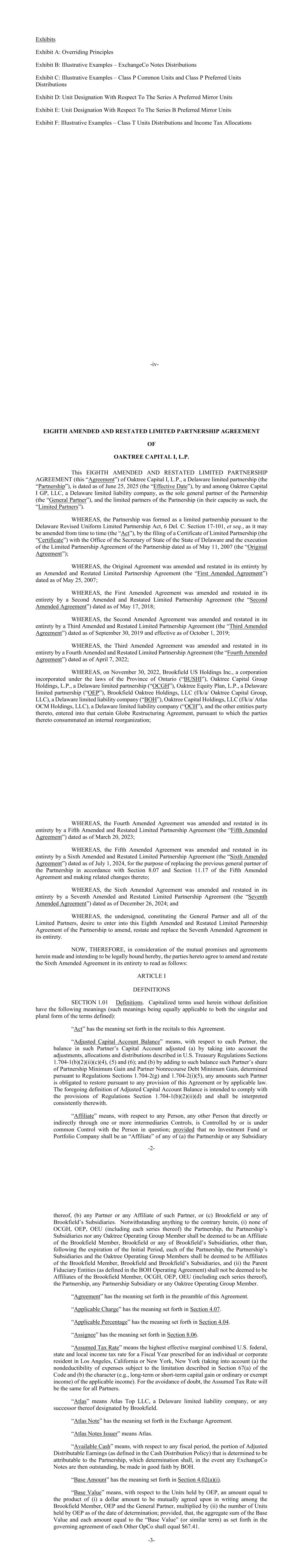-iv-展品附件 A:压倒一切的原则附件 B:说明性例子– ExchangeCo Notes Distributions 附件 C:说明性例子– P类共同单位和P类优先单位分布附件 D:关于A系列优先镜像单位的单位指定TERM0附件 E:关于B系列优先镜像单位的单位指定丨附件 F:说明性例子– T类单位分布和所得税分配第八次修订和重述OAKTREE CAPITAL I,L.P.有限合伙协议。特拉华州有限合伙企业Oaktree Capital I,L.P.(“合伙企业”)的这份经修订和重述的第八份有限合伙协议(本“协议”)的日期为2025年6月25日(“生效日期”),由作为合伙企业唯一普通合伙人的特拉华州有限责任公司Oaktree Capital I GP,LLC(“普通合伙人”)和合伙企业的有限合伙人(以其本身的身份,“有限合伙人”)签署。然而,该合伙企业是根据特拉华州修订的《统一有限合伙企业法》(6 Del.)成立的有限合伙企业。C.第17-101条等(可能不时修订)(“法案”),通过向特拉华州州务卿办公室提交有限合伙证书(“证书”)并执行日期为2007年5月11日的合伙企业有限合伙协议(“原始协议”);然而,原始协议已通过日期为2007年5月25日的经修订和重述的有限合伙协议(“第一次修订协议”)进行了修订和重述;鉴于,第一份经修订协议经日期为2018年5月17日的第二份经修订及重述的有限合伙协议(「第二份经修订协议」)修订及重述其全部内容;然而,第二份经修订协议经日期为2019年9月30日并自2019年10月1日起生效的第三份经修订及重述的有限合伙协议(「第三份经修订协议」)修订及重述其全部内容;然而,第三份经修订协议经日期为4月7日的第四份经修订及重述的有限合伙协议(「第四份经修订协议」)修订及重述其全部内容,2022年;然而,于2022年11月30日,Brookfield US Holdings Inc.,一家根据安大略省法律注册成立的公司(“BUSHI”)、橡树资本 Holdings,L.P.,一家特拉华州有限合伙企业(“OCGH”)、Oaktree Equity Plan,L.P.,一家特拉华州有限合伙企业(“OEP”)、Brookfield Oaktree Holdings,LLC(f/k/a/BOH),一家特拉华州有限责任公司(“TERM2”)、Oaktree Capital Holdings,LLC(f/k/a/Atlas OCM Holdings,LLC),一家特拉华州有限责任公司(“OCH”)及其订约方的其他实体,订立该若干Globe重组协议,据此,其订约方完成内部重组;-2-WHEH第四份经修订协议已由截至2023年3月20日的第五份经修订及重述的有限合伙协议(「第五份经修订协议」)修订及重述其全部内容;然而,第五份经修订协议已由截至2024年7月1日的第六份经修订及重述的有限合伙协议(「第六份经修订协议」)修订及重述其全部内容,目的是根据第五份经修订协议第8.07条及第11.17条的规定,取代该合伙的先前普通合伙人,并对其作出相关更改;然而,第六份经修订协议已由截至2024年12月26日的第七份经修订及重述的有限合伙协议(「第七份经修订协议」)修订及重述其全部内容;而鉴于以下签署人(即构成普通合伙人及所有有限合伙人)希望订立该合伙的第八份经修订及重述的有限合伙协议,以修订、重述及取代第七份经修订协议的全部内容。因此,考虑到在此作出并打算在此受法律约束的相互承诺和协议,本协议各方同意将第六次修订协议全文修改和重申如下:第一条定义第1.01节定义。此处使用的未经定义的大写术语具有以下含义(这些含义同样适用于所定义术语的单数和复数形式):“act”具有本协议背诵中规定的含义。“调整后的资本账户余额”是指,就每个合伙人而言,该合伙人资本账户中的余额经调整(a),其中考虑了美国财政部条例第1.704-1(b)(2)(ii)(c)(4)节中所述的调整、分配和分配, (5)和(6);(b)通过将该合伙人在根据条例第1.704-2(g)和1.704-2(i)(5)节确定的合伙最低收益和合伙人无追索权债务最低收益中所占份额相加,该合伙人有义务根据本协议的任何条款或适用法律恢复的任何金额。调整后资本账户余额的上述定义旨在符合《条例》第1.704-1(b)(2)(二)(d)节的规定,并应与之一致解释。“关联”是指,就任何人而言,通过一个或多个中介直接或间接控制、受相关人员控制或与相关人员处于共同控制之下的任何其他人;但任何投资基金或投资组合公司不得是(a)合伙企业或其任何子公司-3-,(b)该合伙人的任何合伙人或该合伙人的任何关联公司,或(c)Brookfield或Brookfield的任何子公司的“关联公司”。尽管本文中有任何相反的规定,(i)OCGH、OEP、OEU(包括其每个系列)中的任何一方、合伙企业的子公司或Oaktree运营集团的任何成员均不得被视为Brookfield成员、Brookfield或Brookfield的任何子公司的关联公司,但在初始期届满后,合伙企业、合伙企业的子公司和Oaktree运营集团成员中的每一方均应被视为Brookfield成员、Brookfield和Brookfield的子公司的关联公司,(ii)母公司受托实体(定义见BOH运营协议)不应被视为Brookfield成员、OCGH、OEP、OEU(包括其每个系列)、合伙企业、任何合伙子公司或任何Oaktree运营集团成员的关联公司。“协议”具有本协议序言部分规定的含义。“适用费用”具有第4.07节规定的含义。“适用百分比”具有第4.04节中规定的含义。“受让人”具有第8.06节规定的含义。“假定税率”是指为加利福尼亚州洛杉矶市或纽约州纽约市的个人或企业居民规定的一个财政年度的最高有效边际合并美国联邦、州和地方所得税税率(考虑到(a)受《守则》第67(a)节所述限制的费用的不可扣除性和(b)适用收入的性质(例如,长期或短期资本收益或普通或豁免收入)。为免生疑问,所有合作伙伴的假定税率将相