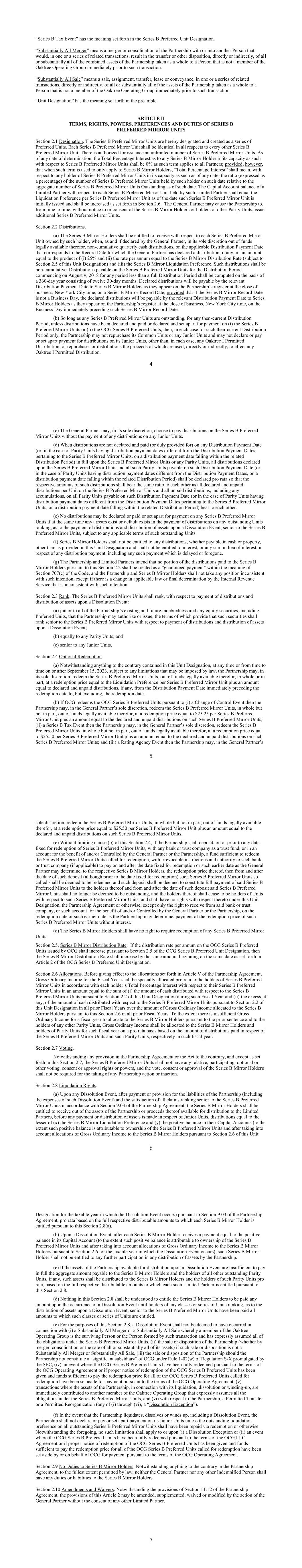 4“B系列税务事件”具有B系列优选单位指定中规定的含义。“基本上全部合并”是指合伙企业与另一人或与另一人合并或合并,在一项或一系列相关交易中,将导致合伙企业的全部或基本上全部合并资产作为一个整体直接或间接转让或以其他方式处置给紧接该交易之前不是Oaktree Operating Group成员的人。“基本全部出售”是指在一项或一系列相关交易中,直接或间接将合伙企业的全部或基本全部资产作为一个整体出售、转让、转让、租赁或转让给紧接该交易之前不是Oaktree Operating Group成员的人。“单位定点”具有序言部分阐述的含义。第二条B系列的条款、权利、权力、优惠和义务优先采用镜像单元第2.1节指定。B系列优选镜像单元特此指定并创建为一系列优选单元。每个B系列优选镜面单元应在所有方面与所有其他B系列优选镜面单元相同。有授权发行不限数量的B系列优选镜像单元。截至任何确定日期,任何B系列镜像持有人以其身份就B系列优先镜像单位享有的总百分比权益应为0%,因为该术语适用于所有合作伙伴;但如果该术语仅适用于B系列镜像持有人,则“总百分比权益”应指,就任何日期以其身份的B系列优先镜像单位持有人而言,该持有人在该日期持有的B系列优先镜像单位数量相对于截至该日期未偿还的B系列优先镜像单位总数的比率(以百分比表示)。有限合伙人相对于该有限合伙人持有的每个B系列优先镜像单位的资本账户余额应等于该B系列优先镜像单位最初发行之日的每个B系列优先镜像单位的清算优先权,并应按第2.6节的规定增加。普通合伙人可促使合伙企业不时在不通知B系列镜像持有人或其他平价单位持有人或其同意的情况下,发行额外的B系列优先镜像单位。第2.2节分配。(a)B系列镜像持有人应有权就该持有人所拥有的每个B系列优先镜像单位收取非累积季度现金分配,如普通合伙人宣布的那样,在适用的分配支付日,对应于普通合伙人宣布分配的记录日期(如有),金额等于(i)25%和(ii)等于B系列镜像分配率(受本单位指定第2.5节限制)和(iii)B系列镜像清算优先权的年费率的乘积。此类分配应为非累积分配。在2018年8月9日开始的分配期内,B系列优先镜像单位在少于一个完整分配期的任何期间内应支付的分配应根据由十二个30天月份组成的360天年度计算。宣布的分配将在相关分配付款日期之前支付给B系列镜像记录日期的B系列镜像持有人,因为他们在B系列镜像记录日期的纽约市时间营业结束时出现在合伙企业的登记册上,但前提是如果B系列镜像记录日期不是营业日,则宣布的分配将在相关分配付款日期之前支付给B系列镜像持有人,因为他们在紧接该B系列镜像记录日期之前的营业日的营业结束时出现在合伙企业的登记册上。(b)只要任何B系列优先镜像单位尚未偿还,在当时的任何分配期间,除非已就(i)B系列优先镜像单位或(ii)OCG B系列优先单位宣布并支付或宣布并拨出分配款项,否则,在每种情况下,仅就该当时的分配期间,合伙企业不得回购其普通单位或任何初级单位,也不得就其初级单位的分配宣布或支付或拨出付款,但在每种情况下,任何Oaktree I允许的分配除外,或回购或分配其收益直接或间接用于实现任何Oaktree I允许的分配。5(c)普通合伙人可全权酌情决定, 选择在B系列优先镜像单元上支付分配,而无需在任何初级单元上支付任何分配。(d)在任何分配付款日期(或在平价单位的分配付款日期与有关B系列优先镜像单位的分配付款日期不同的情况下,在相关分配期限内的分配付款日期)未对B系列优先镜像单位或任何平价单位全额宣布和支付分配款项时,在B系列优先镜像单位上宣布的所有分配款项以及在该分配付款日期应付的所有该等平价单位(或,在平价单位的分配付款日期与分配付款日期不同的情况下,在属于相关分配期内的分配付款日期)应按比例申报,以便此类分配的相应金额应与B系列优先镜像单位上的所有已申报和未支付的每单位分配以及所有未支付的分配(包括任何累积)相互承担相同的比例,在该分配支付日(或在分配支付日与B系列优先镜像单位有关的分配支付日不同的情况下,在相关分配期限内的分配支付日)应付的所有平价单位上相互承担。(e)不得就任何B系列优先镜像单位宣布或支付或拨出任何分配,如果同时在任何未偿还单位排名的分配支付方面存在任何欠款或违约,就解散事件时优先于B系列优先镜像单位的分配和资产分配而言,但须遵守此类未偿还单位的任何适用条款。(f)除本单位指定规定外,B系列镜像持有人无权获得任何分派,不论以现金或财产支付,亦无权就任何分派付款(包括任何延迟或放弃的该等付款)获得利息或任何代替利息的款项。(g)合伙企业和有限合伙人打算,根据本条第2.2款支付给B系列镜像持有人的任何部分的分配均不得被视为《守则》第707(c)条含义内的“保证付款”,合伙企业和B系列镜像持有人不得采取与此种意图不一致的任何立场,除非适用法律发生变化或国内税务局的最终裁定与此种意图不一致。第2.3节排名。B系列优先镜像单位在解散事件时支付分配和分配资产方面的排名应为:(a)低于合伙企业的所有现有和未来债务以及合伙企业可能授权或发行的任何股本证券,包括优先单位,其条款规定,此类证券在解散事件时支付分配和分配资产方面的排名应高于B系列优先镜像单位;(b)与任何平价单位
