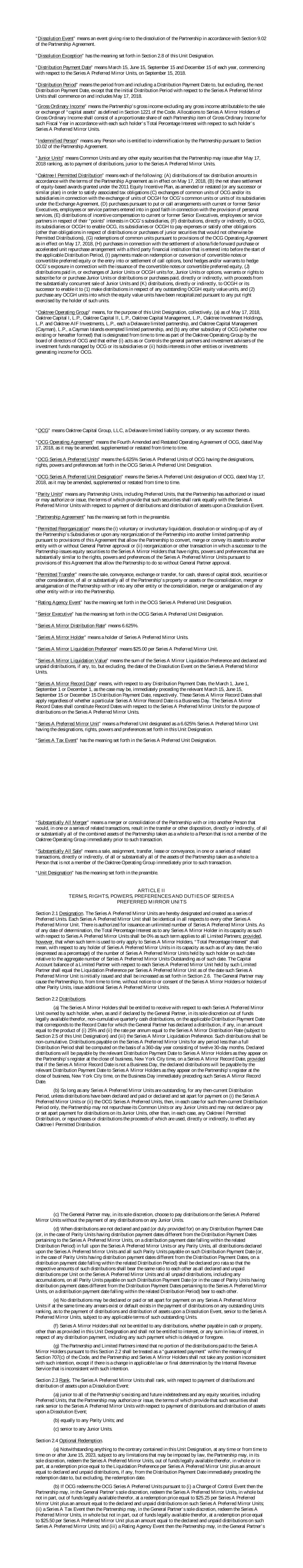 “解散事件”是指根据合伙协议第9.02条导致合伙企业解散的事件。“解散例外”具有本单位名称第2.8节规定的含义。“分配付款日期”是指每年的3月15日、6月15日、9月15日和12月15日,就A系列优先镜像单元而言,于2018年9月15日开始。“分配期”是指从(包括)分配付款日期到(但不包括)下一个分配付款日期的期间,但A系列优先镜像单位的初始分配期应从2018年5月17日开始并包括在内。“普通总收入”是指合伙企业的总收入,不包括《守则》第1221条所定义的“资本资产”出售或交换的任何总收入。分配给A系列镜像持有人的普通收入毛额应包括该财政年度每个普通收入毛额合伙项目的按比例份额,按照每个此类持有人相对于该持有人的A系列优先镜像单位的总百分比权益。“受偿人”指根据合伙协议第10.02条有权获得合伙企业赔偿的任何人。“初级单位”是指合伙企业在2018年5月17日之后可能发行的普通单位和任何其他股本证券,就支付分配而言,低于A系列优先镜像单位。“Oaktree I Permitted Distribution”指以下各项:(A)根据于2018年5月17日生效的合伙协议条款分配税收分配金额,(b)根据经修订或重述的2011年股权激励计划(或任何后续或类似计划)授予的基于股权的奖励的净份额结算,以履行相关的税收义务(c)将OCG和/或其子公司的普通单位交换,与根据交换协议将OCGH的单位交换为OCG的普通单位或其子公司的单位有关,(d)根据与现任或前任高级管理人员、雇员或服务合作伙伴就提供个人服务善意订立的看跌或看涨安排进行购买,(e)就其在OCG子公司的“积分”权益向现任或前任高级管理人员、雇员或服务合作伙伴分配激励薪酬,(f)直接或间接向OCG、其子公司或OCGH进行分配,以使OCG、其子公司或OCGH能够支付费用或履行其他义务(有关分配的义务或购买初级证券的义务除外,否则不得进行分配),(g)根据2018年5月17日生效的《OCG经营协议》的规定赎回普通单位,(h)与在适用的分配期开始前与第三方金融机构订立的善意远期购买或加速单位回购安排的结算有关的购买,(i)就赎回或转换可转换票据或可转换优先股或订立或结算看涨期权而支付的款项,债券对冲和/或认股权证以对冲OCG与发行可转换票据或可转换优先股有关的风险,(J)以初级单位或OCGH单位支付的分派,或以初级单位或OCGH单位交换初级单位或期权、认股权证或认购或购买初级单位的权利,或以基本上同时出售初级单位的收益直接或间接支付的分派或购买,以及(K)直接或间接向OCGH或其继任者进行的分派,以使其能够(1)就任何未偿还的OCGH股权价值单位进行分派,(2)购买根据该等单位持有人行使的任何认沽权而将权益价值单位进行资本重组的任何OCGH单位。“Oaktree Operating Group”是指,就本单位指定而言,(a)截至2018年5月17日,Oaktree Capital I,L.P.、Oaktree Capital II,L.P.、Oaktree Capital Management,L.P.、Oaktree Investment Holdings,L.P.及Oaktree AIF Investments,L.P.各自为特拉华州有限合伙企业,Oaktree Capital Management(Cayman),L.P.为开曼群岛豁免有限合伙企业,及(b)由OCG董事会不时指定为Oaktree Operating Group一部分的任何其他OCG附属公司(不论现时是否现有或其后成立),且该附属公司(i)作为或控制OCG或其附属公司管理的投资基金的普通合伙人和投资顾问,或(ii)持有其他实体的权益或为OCG产生收入的投资。“OCG”指特拉华州有限责任公司橡树资本,LLC, 或其任何继任者。“OCG经营协议”指OCG经修订及重列的第四份经营协议,日期为2018年5月17日,该协议可能会不时修订、补充或重列。“OCGA系列优先股”是指具有OCGA系列优先股指定中规定的指定、权利、权力和优惠的TERM1 6.625% A系列优先股。“OCG A系列优先单位指定”指日期为2018年5月17日的OCG A系列优先单位指定,其可能会不时修订、补充或重述。“平价单位”是指合伙企业已授权或发行或可能授权或发行的任何合伙单位,包括优先单位,其条款规定,在支付分配和在解散事件时分配资产方面,此类证券应与A系列优先镜像单位享有同等地位。“合伙协议”具有序言中阐述的含义。“许可重组”是指(i)自愿或非自愿清算、解散或清盘合伙企业的任何子公司,或在根据本协议允许合伙企业在有或无普通合伙人批准的情况下将其资产转换、合并或转让给另一实体的条款将合伙企业重组为另一有限合伙企业时,或(ii)重组或其他交易,其中合伙企业的继承人向A系列镜像持有人发行股本证券,其权利、权力和优先权与权利基本相似,A系列优先镜像单位的权力和优惠根据本协议的规定,允许合伙企业在没有普通合伙人批准的情况下这样做。“允许转让”是指以现金、股本份额、证券或其他对价出售、转让、交换或转让合伙企业的全部或几乎全部财产或资产,或将合伙企业与任何其他实体合并、合并或合并为任何其他实体,或将任何其他实体与合伙企业合并、合并或合并为任何其他实体。“评级机构事件”具有OCG A系列优选单位认定中阐述的含义。“高级管理人员”具有OCG系列A优先单位指定中规定的含义。“A系列镜分发率”是指6.625%。“A系列镜架”是指A系列优选镜架的持有者。“A系列镜像清算优先”是指每A系列优先镜像单位25.00美元。“A系列镜像清算价值”是指A系列镜像清算优先权和已宣布和未支付的分配(如果有的话)的总和,以A系列优先镜像单位上的解散事件日期为准,但不包括在内。“A系列镜像记录日期