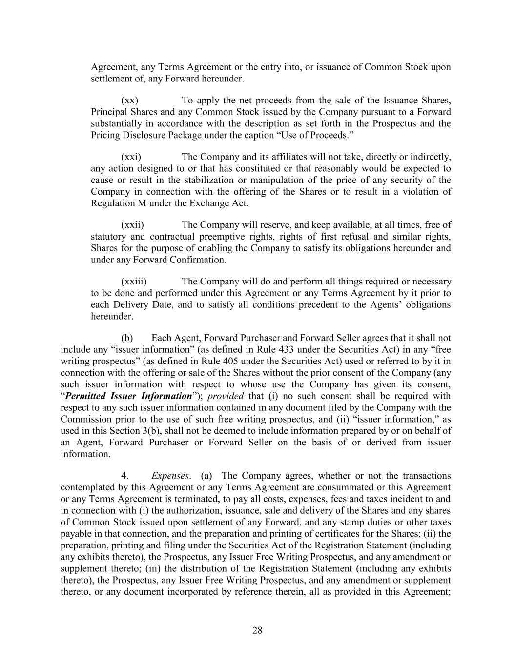 协议、任何条款协议或订立或在结算时发行普通股,本协议下的任何远期。(xx)将出售发行股份、本金股份和公司根据远期发行的任何普通股的所得款项净额基本上按照招股说明书和定价披露包中“所得款项用途”标题下的描述进行应用。(xxi)公司及其关联公司将不会直接或间接采取任何旨在或已经构成或合理预期会导致或导致公司任何证券的价格稳定或操纵与股份发售有关或导致违反《交易法》第M条规定的任何行动。(xxii)公司将在任何时候保留并保持股份,以使公司能够履行其在本协议项下和任何远期确认书项下的义务,不受法定和合同约定的优先购买权、优先购买权和类似权利的限制。(xxiii)公司将于每个交付日期前作出及履行其根据本协议或任何条款协议须作出或必须作出及履行的一切事情,并满足代理人在本协议项下的义务的所有先决条件。(b)各代理、远期买方和远期卖方同意,在未经公司事先同意的情况下,不得将其在与股份发售或销售有关的任何“自由编写招股说明书”(定义见《证券法》第433条)中使用或提及的任何“发行人信息”(定义见《证券法》第405条)(公司已就其用途给予同意的任何此类发行人信息,“允许的发行人信息”);但前提是(i)在使用此类自由编写的招股说明书之前,公司向委员会提交的任何文件中包含的任何此类发行人信息无需获得此类同意,以及(ii)本第3(b)节中使用的“发行人信息”不应被视为包含由代理、远期买方或远期卖方或其代表根据或源自发行人信息编制的信息。4.费用。(a)无论本协议或任何条款协议所设想的交易是否完成或本协议或任何条款协议是否终止,公司同意支付与(i)授权、发行、出售和交付股份及在任何远期结算时发行的任何普通股股份有关的所有成本、开支、费用和税款,以及在这方面应付的任何印花税或其他税款,以及为股份编制和印刷证书;(ii)编制,根据《证券法》印制和归档注册声明(包括其任何证物)、招股说明书、任何发行人自由撰写的招股说明书及其任何修订或补充;(iii)分发注册声明(包括其任何证物)、招股说明书、任何发行人自由撰写的招股说明书及其任何修订或补充,或以引用方式并入其中的任何文件,所有这些均在本协议中规定;28