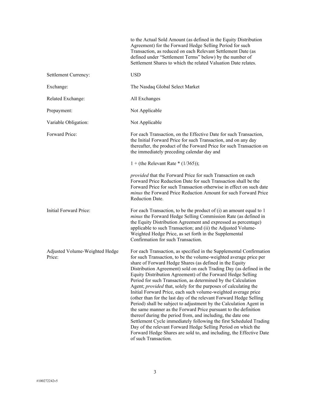 3 # 100272242v5至该等交易的远期对冲卖出期的实际售出金额(定义见Equity Distribution协议),在每个相关结算日(定义见下文“结算条款”)减去相关估值日期所关乎的结算股份数目。结算货币:美元交易所:纳斯达克全球精选市场相关交易所:所有交易所预付款:不适用可变义务:不适用远期价格:就每笔交易而言,在该交易的生效日期,该交易的初始远期价格,以及在其后的任何一天,上述交易在紧接前一个日历日的远期价格与1 +的乘积(相关费率*(1/365));但在该交易的每个远期减价日,该交易的远期价格应为该交易在该日期另有效力的远期价格减去该远期减价日的远期减价金额。初始远期价格:就每笔交易而言,为(i)金额等于1减去适用于该交易的远期对冲销售佣金率(定义见Equity Distribution协议,并以百分比表示);及(ii)调整后的成交量加权对冲价格的乘积,详见该交易的补充确认书。调整后的成交量加权套期保值价格:就该交易的补充确认书中规定的每笔交易,为计算代理确定的该交易的远期套期保值销售期的每个交易日(定义见Equity Distribution协议)卖出的远期套期保值股份(定义见该协议)的成交量加权平均每股价格;但仅为计算初始远期价格的目的,每一该等成交量加权平均价格(相关远期对冲卖出期最后一天除外)须由计算代理根据其定义在紧接相关远期对冲卖出期的第一个预定交易日之后的一个结算周期日期(包括该交易生效日期)起的期间内按与远期价格相同的方式进行调整。