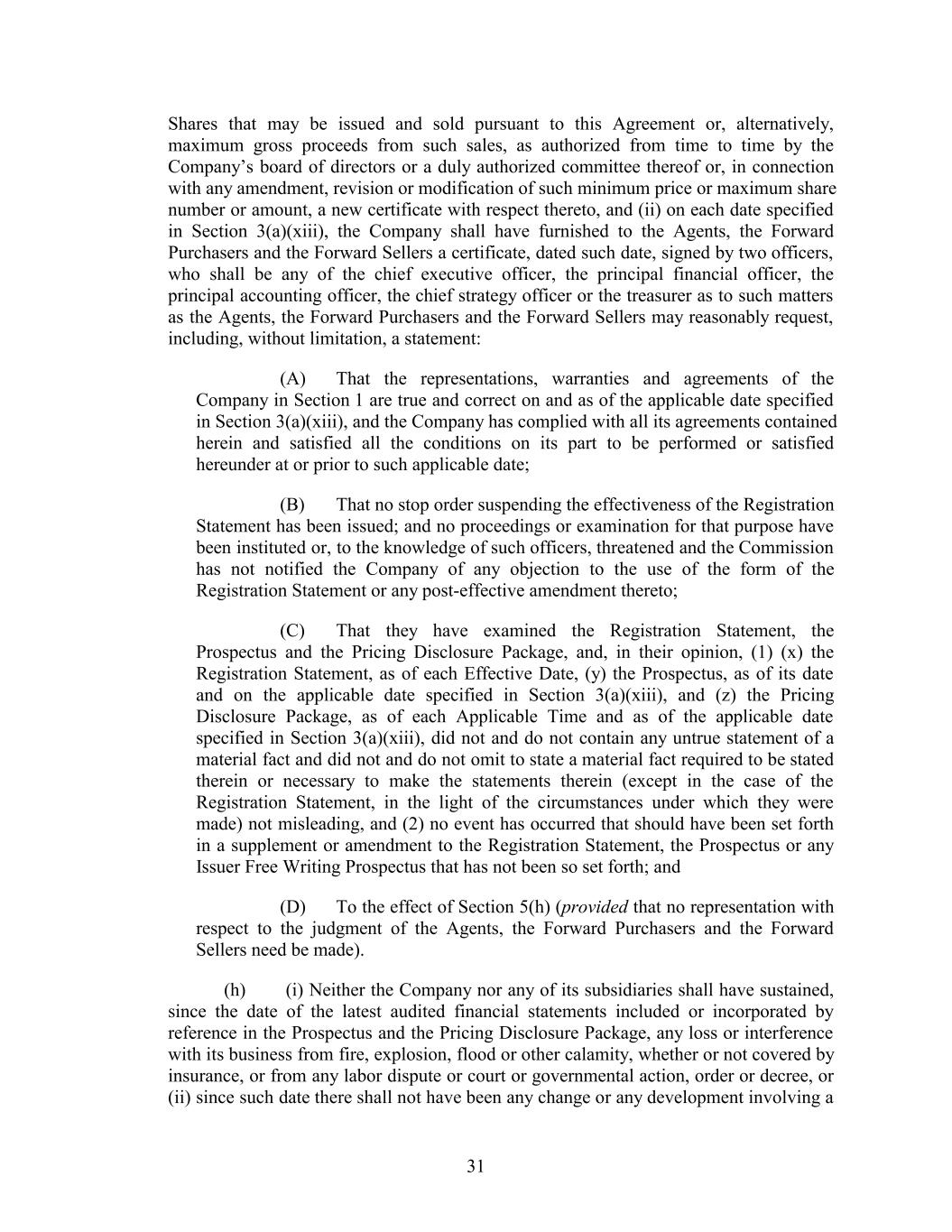 可根据本协议发行及出售的股份,或可根据公司董事会或其正式授权的委员会不时授权的该等出售的最高总收益,或就该等最低价格或最高股份数目或金额的任何修订、修订或修改而言,有关的新证书,及(ii)于第3(a)(xiii)条所指明的每个日期,公司须已向代理、远期买方及远期卖方提供一份日期为该日期、由两名高级人员签署的证书,就代理、远期买方及远期卖方可合理要求(包括但不限于)作出以下声明:(a)公司在第1条中的陈述、保证及协议于第3(a)(xiii)条所指明的适用日期及截至该日期均属真实及正确,及公司已遵守本协议所载的所有协议,并在该适用日期或之前达成其根据本协议须履行或达成的所有条件;(b)并无发出暂停注册声明有效性的停止令;且并无为此目的提起法律程序或审查,或据该等高级人员所知,威胁,且证监会未将任何反对使用注册声明表格或任何生效后修订通知公司;(c)他们已审查注册声明、招股章程和定价披露包,并认为,(1)(x)注册声明,截至每个生效日期,(y)招股章程,截至其日期和第3(a)(xiii)节规定的适用日期,以及(z)定价披露包,截至每个适用时间和第3(a)(xiii)节规定的适用日期,没有、也没有包含任何关于重大事实的不真实陈述,也没有、也没有遗漏陈述必须在其中陈述或作出其中陈述所必需的重大事实(注册声明的情况除外,根据作出这些陈述的情况)没有误导,以及(2)没有发生本应在注册声明的补充或修订中阐述的事件,招股章程或任何未经如此载列的发行人自由书面招股章程;及(d)就第5(h)条而言(但无须就代理、远期买方及远期卖方的判断作出陈述)。(h)(i)公司或其任何附属公司自招股章程及定价披露资料包所包括或以提述方式纳入的最近一期经审核财务报表日期起,均不得承受因火灾、爆炸、水灾或其他灾害(不论是否在保险范围内)或因任何劳资纠纷或法院或政府行动、命令或法令而对其业务造成的任何损失或干扰,或(ii)自该日期起,不得有任何变更或任何发展涉及31