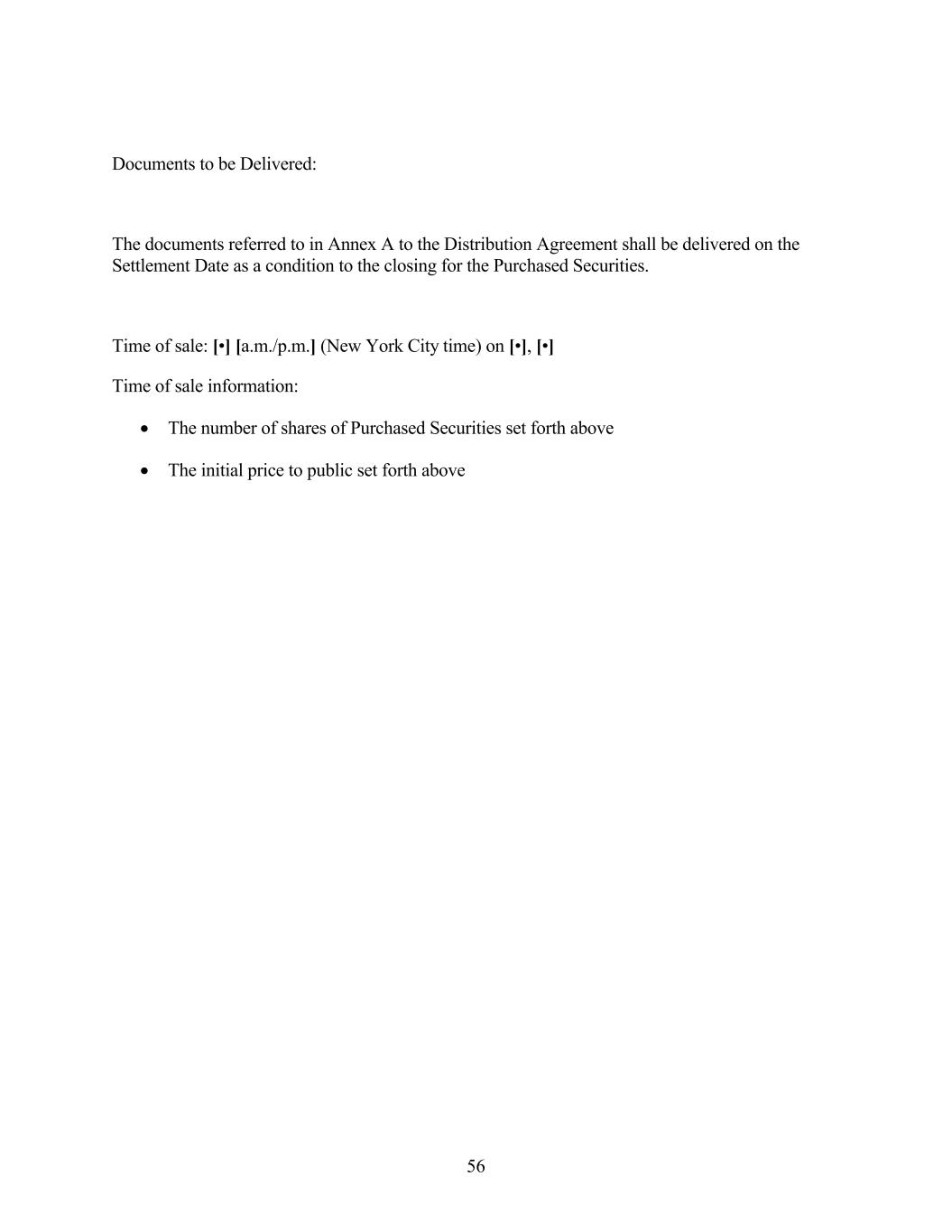 交付文件:分销协议附件A所指文件应于结算日交付,作为所购买证券收盘的条件。发售时间:[ • ] [ a.m./p.m. ](纽约市时间)上[ • ],[ • ]发售时间信息:上述首次公开发售价格所列购买证券的股份数量56