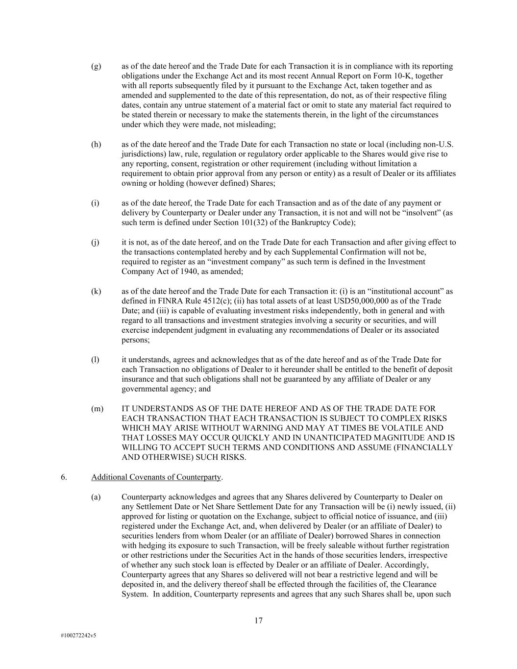 17 # 100272242v5(g)截至本协议之日和每笔交易的交易日期,它遵守《交易法》规定的报告义务,其最近的10-K表格年度报告,连同其随后根据《交易法》提交的所有报告,合并起来并经修订和补充至本陈述之日,截至其各自提交日期,不包含任何关于重大事实的不真实陈述,或未说明任何需要在其中陈述或作出其中陈述所必需的重大事实,鉴于作出这些交易的情况,不会产生误导;(h)截至本协议日期和每笔交易的交易日期,没有任何适用于股份的州或地方(包括非美国司法管辖区)法律、规则、条例或监管命令会因交易商或其关联公司拥有或持有(无论定义如何)股份而产生任何报告、同意、登记或其他要求(包括但不限于获得任何个人或实体事先批准的要求);(i)截至本协议日期,每笔交易的交易日期,以及截至交易对手或交易商根据任何交易进行的任何付款或交付之日,它不是也不会是“资不抵债”(因为该术语是根据《破产法》第101(32)条定义的);(j)截至本协议日期,在每笔交易的交易日期,以及在本协议所设想的交易生效后和每一份补充确认书都不会被要求注册为《1940年投资公司法》中定义的“投资公司”,经修订;(k)截至本协议日期及其每笔交易的交易日期:(i)是FINRA规则第4512(c)条所定义的“机构账户”;(ii)截至交易日期的总资产至少为50,000,000美元;(iii)能够独立评估投资风险,包括一般情况以及涉及证券或证券的所有交易和投资策略,并将在评估交易商或其关联人的任何建议时行使独立判断;(l)了解,同意并承认,自本协议之日起,以及自每笔交易的交易日期起,交易商在本协议项下对其承担的任何义务均无权享有存款保险和此类义务不得由交易商的任何关联机构或任何政府机构提供担保;(m)它了解到,截至本协议日期和每笔交易的交易日期,每笔交易都面临复杂的风险,这些风险可能会在没有警告的情况下产生,有时可能是不稳定的,损失可能会迅速发生并达到意想不到的规模,并且愿意接受此类条款和条件,并承担(在财务上和其他方面)此类风险6.交易对手的附加契约。(a)交易对手承认并同意,交易对手在任何交易的任何结算日或净股份结算日交付给交易商的任何股份将是(i)新发行的,(ii)获准在交易所上市或报价,但须遵守正式的发行通知,以及(iii)根据《交易法》注册,并且当由交易商(或交易商的关联公司)交付给交易商(或交易商的关联公司)为对冲其在该交易中的风险而向其借入股份的证券出借人时,将可自由出售,无需根据《证券法》在这些证券出借人手中进行进一步注册或其他限制,无论任何此类股票贷款是由交易商还是交易商的关联公司进行的。据此,交易对方同意,如此交付的任何股份将不带有限制性图例,并将存入清算系统,其交付应通过清算系统的设施进行。此外,交易对方声明并同意,任何该等股份应于