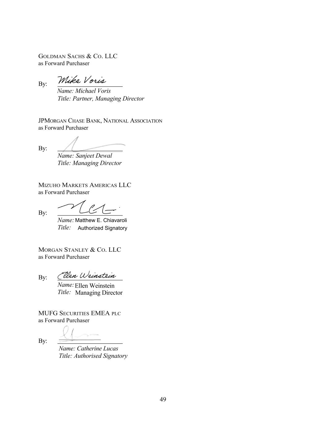 GOLDMAN SACHS & CO. LLC作为远期买方:职务:合伙人、董事总经理JPMorgan CHASE BANK、美国国家协会作为远期买方:姓名:Sanjeet Dewal职务:董事总经理MIZUHO MARKETS AMERICAS LLC作为远期买方:姓名:职务:MORGAN STANLEY & CO. LLC作为远期买方:姓名:职务:MUFG SECURITIES EMEA PLC作为远期买方:49姓名:Michael Voris Matthew E. Chiavaroli授权签字人Ellen Weinstein董事总经理姓名:Catherine Lucas职务:授权签字人