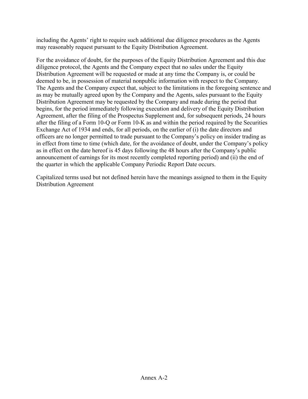 包括代理有权根据《Equity Distribution协议》要求代理可能合理要求的额外尽职调查程序。为免生疑问,就Equity Distribution协议及本尽职调查协议而言,代理及公司预期,在公司掌握或可能被视为掌握有关公司的重大非公开资料的任何时间,将不会要求或作出任何根据Equity Distribution协议进行的销售。代理商及公司预期,在受前述句子的限制及公司与代理商可能相互议定的情况下,根据Equity Distribution协议进行的销售可由公司提出要求,并可在开始的期间内、紧接执行及交付Equity Distribution协议后的期间、于招股章程补充文件备案后的期间内以及就后续期间而言,在提交表格10-Q或表格10-K后24小时,如1934年《证券交易法》规定的期限内,并在所有期限内,在(i)根据公司不时生效的内幕交易政策不再被允许进行交易之日(为免生疑问,该日期,根据公司政策,于本协议日期生效的日期为公司公布其最近完成的报告期间的收益后48小时后的45天)和(ii)适用的公司定期报告日期发生的季度末。此处使用但未定义的大写词语具有《Equity Distribution协议》附件A-2赋予的含义