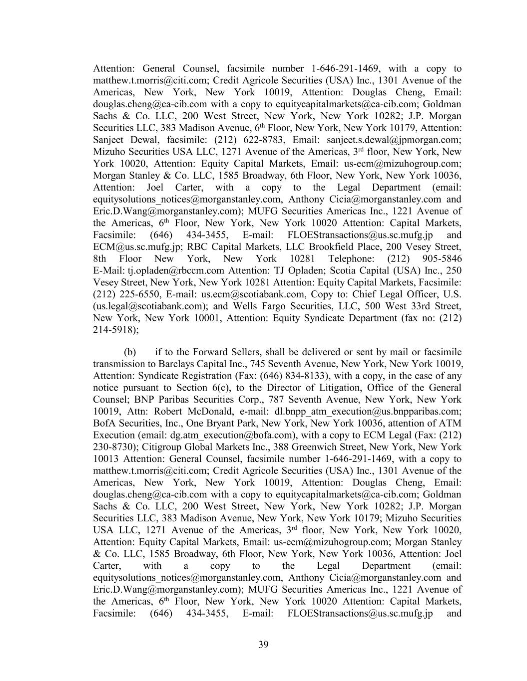 注意:总法律顾问,传真号码1-646-291-1469,复印至matthew.t.morris@citi.com;Credit Agricole Securities(USA)Inc.,1301 Avenue of the Americas,New York,New York 10019,注意:Douglas Cheng,Email:douglas.cheng@ca-cib.com,复印至equitycapitalmarkets@ca-cib.com;高盛 Sachs & Co. LLC,200 West Street,New York,New York 10282;J.P. Morgan Securities LLC,383 Madison Avenue,6th Floor,New York,New York 10179,注意:Sanjeet Dewal,传真:(212)622-8783,Email:sanjeet.s.dewal1585 Broadway,6th Floor,New York,New York 10036,收件人:Joel Carter,附法务部副本(邮箱:equitysolutions _ notices@morganstanley.com,Anthony Cicia@morganstanley.com和Eric.D.Wang@morganstanley.com);MUFG Securities Americas Inc.,1221 Avenue of the Americas,6th Floor,New York,New York 10020收件人:Capital Markets,传真:(646)434-3455,邮箱:FLOEStransactions @ us.sc.mufg.jp和ECM @ us.sc.mufg.jp;RBC Capital Markets,LLC Brookfield Place,200 Vesey Street,8th Floor,New抄送:首席法务官,美国(us.legal@scotiabank.com);及富国银行 Securities,LLC,500 West 33rd Street,New York,New York 10001,收件人:Equity Syndicate Department(传真号码:(212)214-5718);(b)如发给远期卖方,应通过邮件或传真方式送达或发送至BARCLAYS CAPITAL INC.,745 Seventh Avenue,New York,New York 10019,收件人:Syndicate Registration(Fax:(646)834-8133),连同一份副本,如根据第6(c)节有任何通知,则发给总法律顾问办公室诉讼总监;法国巴黎证券公司,787 Seventh Avenue,New York,New York 10019,Attn:Robert McDonald,e-mail:dl.bnpp _ atm _ execution@us.bnpparibas.com;BofA Securities,Inc.,One Bryant Park,New York,New York 10036,ATM Execution Attention(email:dg.atm _ execution@bofa.com),并抄送ECM Legal(fax:(212)230-8730);花旗集团 Global Markets Inc.,388 Greenwich Street,New York,New York 10013收件人:总法律顾问,传真号码1-646-291-1469,抄送matthew.t.morris@citi.com;Credit Agricole Securities(USA)Inc.,1301 Avenue of the Americas,New York,New York 10019,New York,New York 10179;Mizuho Securities USA LLC,1271 Avenue of the Americas,3rd Floor,New York,New York,New York 10020,关注:Equity Capital Markets,Email:us-ecm@mizuhogroup.com;摩根士丹利 & Co. LLC,1585 Broadway,6th Floor,New York,New York 10036,关注:Joel Carter,并抄送法律部(email:equitysolutions _ notices@morganstanley.com,Anthony Cicia@morganstanley.com and Eric.D.Wang@morganstanley.com);TERMSecurities Americas Inc.,1221 Avenue of the Americas,6th Floor,New York,New York 10020关注: