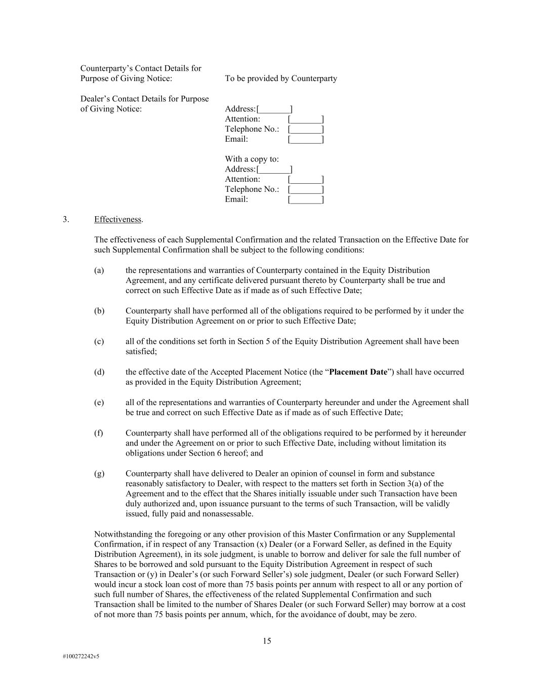 15 # 100272242v5以发出通知为目的的交易对手联系方式:以发出通知为目的的交易对手交易商联系方式提供:地址:[ ________ ]注意:[ ________ ]电话号码:[ ________ ]邮箱:[ _______ ]并复印至:地址:[ _______ ]注意:[ _______ ]电话号码:[ _______ ]邮箱:[ _______ ] 3。有效性。每一份补充确认及关联交易在该补充确认生效日的有效性,需满足以下条件:(a)Equity Distribution协议所载交易对方的陈述和保证,及任何由交易对方依据其交付的证明书,在生效日期为如于该生效日期作出;(b)交易对方应已于该生效日期或之前履行其在《Equity Distribution协议》项下所要求履行的所有义务;(c)《Equity Distribution协议》第5节规定的所有条件均已满足;(d)所接受的配售通知的生效日期(“配售日”)应已发生于《Equity Distribution协议》的规定;(e)交易对方在本协议项下及在本协议项下的所有陈述和保证均为真并在生效日期更正,犹如是在该生效日期作出的一样;(f)交易对手应已在该生效日期或之前履行其根据本协议和根据本协议须履行的所有义务,包括但不限于其根据本协议第6条承担的义务;及(g)交易对手应已向交易商交付交易商合理满意的形式和实质上的大律师意见,关于协议第3(a)节所述事项,大意是,根据该交易最初可发行的股份已获得正式授权,一旦根据该交易的条款发行,将有效发行、全额支付和不可评估。尽管有上述规定或本主确认书或任何补充确认书的任何其他规定,如就任何交易(x)交易商(或Equity Distribution协议所定义的远期卖方)在其自行判断下,无法就该交易借入并交付根据《Equity Distribution协议》借入和出售的全部股份数量,或(y)交易商(或该远期卖方)自行判断,交易商(或此类远期卖方)将就此类全部数量的股份的全部或任何部分产生每年超过75个基点的股票贷款成本,相关补充确认和此类交易的有效性应限于交易商(或此类远期卖方)可能以每年不超过75个基点的成本借款的股份数量,为免生疑问,该成本可能为零。