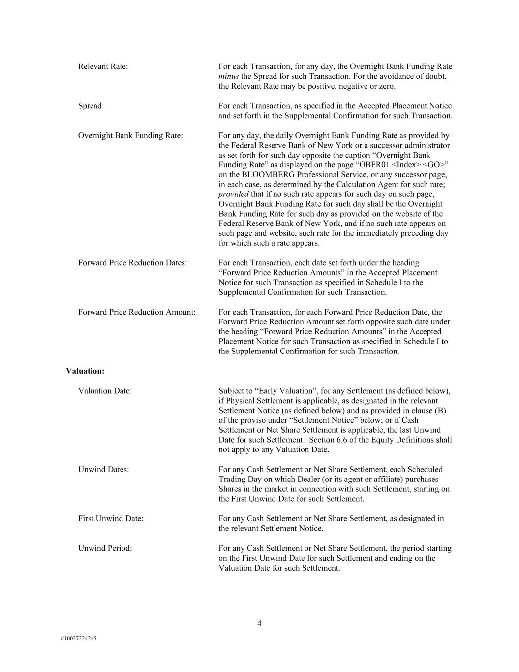 4 # 100272242v5相关利率:对于每笔交易,对于任何一天,隔夜银行资金利率减去此类交易的利差。为免生疑问,有关利率可能为正、负或零。价差:就每宗交易而言,如已接纳的配售通知书所指明,并载于有关该等交易的补充确认书。隔夜银行资金利率:对于任何一天,由纽约联邦储备银行或继任管理人提供的每日隔夜银行资金利率,如在彭博专业服务的页面“OBFR01 < Index > < GO >”显示的标题“隔夜银行资金利率”对面,或任何后续页面上显示,在每种情况下,由该利率的计算代理确定;前提是,如果在该页面上没有出现该天的该利率,该日的隔夜银行资金利率应为纽约联邦储备银行网站上提供的该日的隔夜银行资金利率,如该页面和网站上未出现该利率,则为出现该利率的前一日的该利率。远期降价日期:就每宗交易而言,就该等交易的补充确认书附表I所指明的该等交易而言,在已接受的配售通知中「远期降价金额」标题下所列的每一日期。远期减价金额:就每宗交易而言,就每宗远期减价日期而言,就该等交易的补充确认书附表一所列明的该等交易的已接纳配售通知书的「远期减价金额」标题下与该日期相对之处载明的远期减价金额。估值:估值日期:以“提前估值”为准,就任何结算(定义见下文)而言,如适用实物结算,则为相关结算通知(定义见下文)所指定,并为下文“结算通知”项下的但书(b)条所规定;或如适用现金结算或净股份结算,则为该等结算的最后平仓日期。股权定义第6.6节不适用于任何估值日期。解套日期:对于任何现金结算或净股份结算,交易商(或其代理或关联公司)在市场上购买与该结算有关的股份的每个预定交易日,自该结算的第一个解套日期开始。第一次解套日期:对于任何现金结算或净份额结算,按相关结算通知中指定的。解盘期:对于任何现金结算或净份额结算,自该结算的第一个解盘日起至该结算的估值日止的期间。