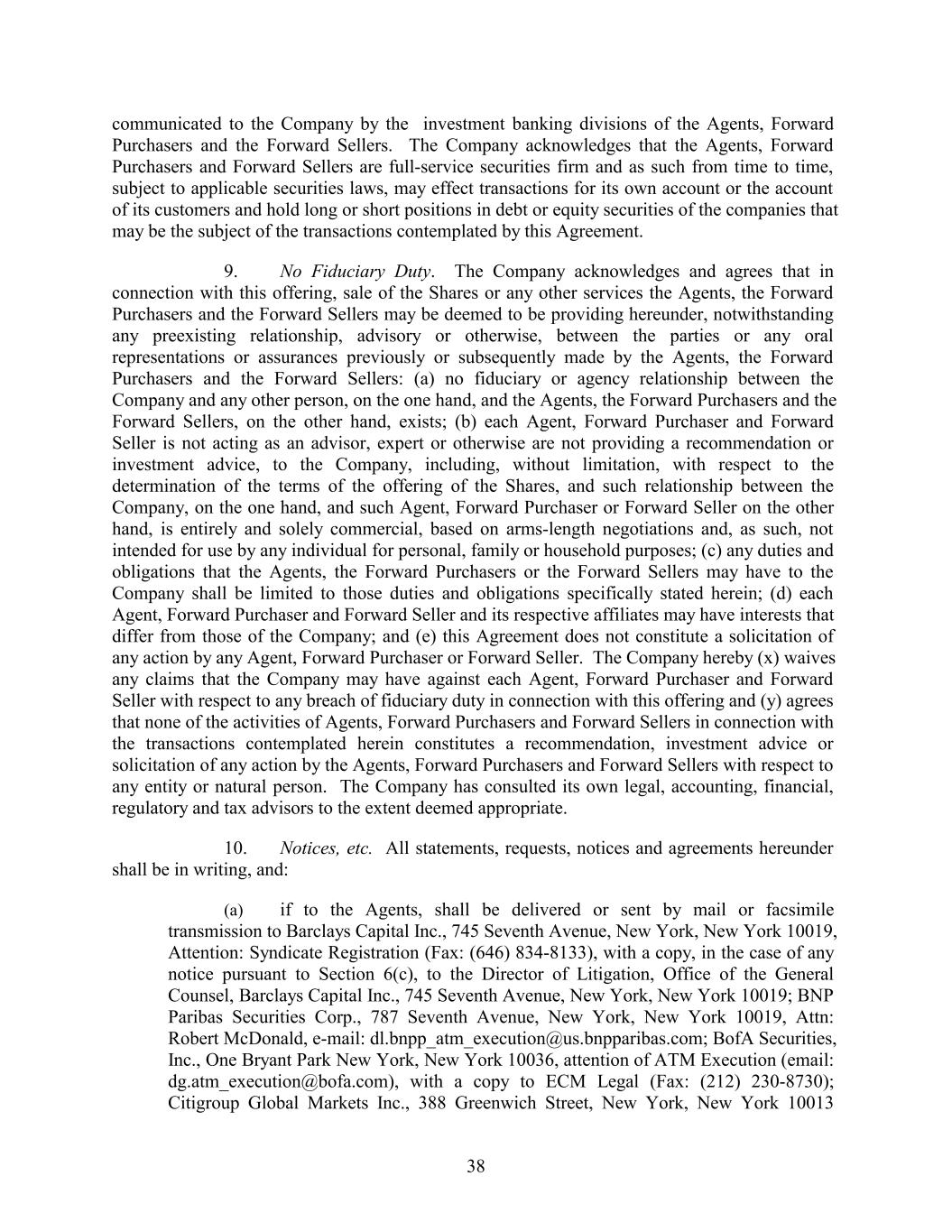 代理、远期买方和远期卖方的投资银行部门与公司进行了沟通。本公司确认,代理、远期买方及远期卖方均为提供全方位服务的证券公司,因此,根据适用的证券法,不时可能为其自己的账户或其客户的账户进行交易,并持有可能为本协议所设想的交易标的的公司的债务或股本证券的多头或空头头寸。9.没有受托责任。公司承认并同意,就本次发售、出售股份或任何其他服务而言,代理、远期买方和远期卖方可被视为根据本协议提供,尽管各方之间存在任何先前存在的关系、咨询或其他关系,或代理、远期买方和远期卖方之前或之后作出的任何口头陈述或保证:(a)公司与任何其他人(一方面)以及代理、远期买方和远期卖方(另一方面)之间没有任何受托或代理关系,存在;(b)各代理、远期买方和远期卖方均不作为顾问、专家或以其他方式向公司提供推荐或投资建议,包括但不限于有关股份发售条款的确定,而公司与该代理、远期买方或远期卖方之间的这种关系,一方面是完全和完全商业的,基于公平谈判,因此,不打算供任何个人用于个人,家庭或家庭用途;(c)代理、远期买方或远期卖方可能对公司承担的任何义务和义务应限于此处具体说明的那些义务和义务;(d)每个代理、远期买方和远期卖方及其各自的关联公司可能拥有与公司不同的利益;(e)本协议不构成任何代理、远期买方或远期卖方的任何行动的招揽。公司特此(x)放弃公司就与本次发行有关的任何违反信托义务而可能对每个代理、远期买方和远期卖方提出的任何索赔,并且(y)同意代理、远期买方和远期卖方与本协议所设想的交易有关的任何活动均不构成代理、远期买方和远期卖方对任何实体或自然人的任何行动的推荐、投资建议或招揽。公司已在认为适当的范围内咨询其自身的法律、会计、财务、监管和税务顾问。10.通告等本协议项下的所有声明、请求、通知和协议均应以书面形式提出,并且:(a)如果发给代理,则应通过邮件或传真方式送达或发送至BARCLAYS CAPITAL INC.,地址为745 Seventh Avenue,New York,New York 10019,注意:Syndicate Registration(传真:(646)834-8133),连同一份副本,如根据第6(c)节发出任何通知,则发送给总法律顾问办公室诉讼总监,地址为745 Seventh Avenue,New York,New York,10019;BNP Paribas Securities Corp.,787 Seventh Avenue,New York,New York 10019,Attn:Robert McDonald,e-mail:dl.bnpp _ atm _ execution@us.bnpparibas.com;BoInc.,One Bryant Park New York,New York 10036,ATM Execution关注(邮箱:dg.atm _ execution@bofa.com),并抄送ECM Legal(传真:(212)230-8730);花旗集团 Global Markets Inc.,388 Greenwich Street,New York,New York 1001338