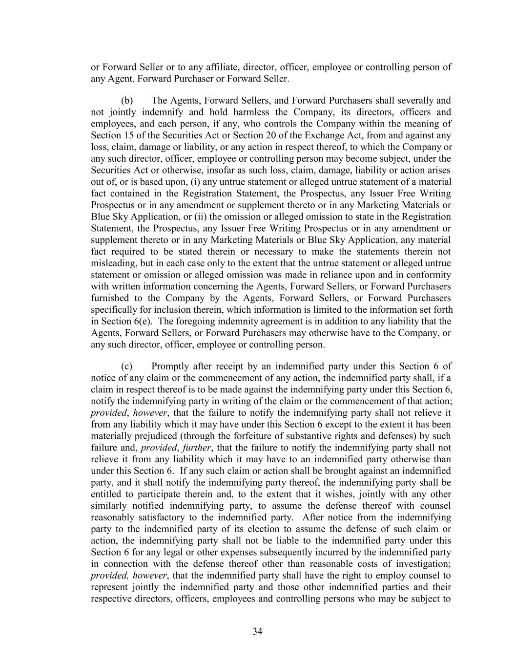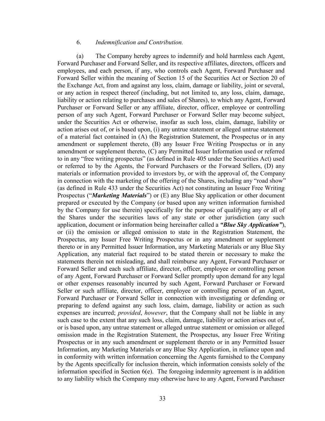 6.赔偿和贡献。(a)公司特此同意就《证券法》第15条或《交易法》第20条所指的任何损失、索赔、损害或责任,或与此相关的任何行动(包括但不限于与股份买卖有关的任何损失、索赔、损害、责任或行动),对每一代理人、远期买方和远期卖方及其各自的关联公司、董事、高级职员和雇员,以及控制每一代理人、远期买方和远期卖方的每一个人(如果有的话)进行赔偿并使其免受损害,远期买方或远期卖方或任何此类代理、远期买方或远期卖方的任何关联公司、董事、高级职员、雇员或控制人可能会根据《证券法》或其他规定,只要此类损失、索赔、损害、责任或诉讼产生于或基于(i)(a)注册声明、招股说明书或其任何修订或补充、(b)任何发行人自由编写招股说明书或其任何修订或补充中所载重大事实的任何不真实陈述或被指称的不真实陈述,(c)代理、远期买方或远期卖方使用或提及的任何“自由编写招股说明书”(定义见《证券法》第405条)中使用或提及的任何许可发行人信息,(d)公司向投资者提供的或经其批准的与股份发售营销有关的任何材料或信息,包括任何“路演”(定义见《证券法》第433条),不构成发行人自由编写的招股说明书(“营销材料”)或(e)任何由公司编制或执行的蓝天申请或其他文件(或基于公司为在其中使用而提供的任何书面信息),专门用于根据任何州或其他司法管辖区的证券法对任何或所有股份进行资格认定(任何此类申请、文件或信息以下称为“蓝天申请”),或(ii)在注册声明中的遗漏或被指称的遗漏,招股章程、任何发行人免费撰写招股章程或在其任何修订或补充或在任何许可的发行人信息、任何营销材料或任何蓝天申请中、其中要求说明或使其中的陈述不具误导性所必需的任何重要事实,并应在要求时立即补偿任何代理、远期买方或远期卖方以及每一该等关联公司、董事、高级职员、雇员或任何代理的控制人、远期买方或远期卖方合理产生的任何法律或其他费用,远期买方或远期卖方或该等关联公司、董事、高级职员,代理、远期买方或远期卖方的雇员或控制人,涉及调查或抗辩或准备抗辩任何此类损失、索赔、损害、责任或诉讼,因为这些费用已经产生;但前提是,在任何此类情况下,公司不承担责任,只要任何此类损失、索赔、损害、责任或诉讼是由或基于注册声明、招股说明书中作出的任何不真实陈述或被指称的不真实陈述或遗漏或被指称的遗漏,任何发行人免费编写招股说明书或在其任何此类修订或补充或在任何允许的发行人信息、任何营销材料或任何蓝天申请中,依赖并符合由代理商提供给公司的有关代理商的书面信息,专门用于纳入其中,这些信息仅包含第6(e)节规定的信息。上述赔偿协议是公司可能对任何代理人承担的任何责任的补充,远期买方33