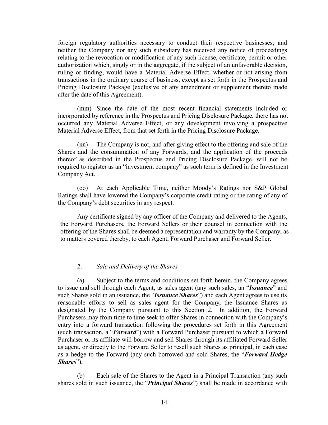 开展各自业务所需的外国监管机构;公司或任何此类子公司均未收到任何与撤销或修改任何此类许可、证书、许可或其他授权有关的程序通知,如果不利的决定、裁决或调查结果的主体单独或合计会产生重大不利影响,无论是否产生于正常业务过程中的交易,但招股说明书和定价披露包中规定的情况除外(不包括在本协议日期之后作出的任何修改或补充)。(mm)自《招股说明书》和定价披露包中所列或以引用方式并入的最近一期财务报表之日起,没有发生定价披露包中所列的任何重大不利影响或涉及预期重大不利影响的任何发展。(nn)公司不是,并且在实施股份的发售和出售以及任何远期交易的完成以及招股说明书和定价披露包中所述的收益的应用后,将不需要注册为《投资公司法》中定义的“投资公司”。(oo)在每个适用时间,穆迪评级或标普全球评级均不得在任何方面降低公司的公司信用评级或公司任何债务证券的评级。任何由公司任何高级人员签署并交付给代理、远期买方、远期卖方或其大律师的与股份发售有关的证书,应被视为公司就其所涵盖的事项向各代理、远期买方和远期卖方作出的陈述和保证。2.股份的出售及交付(a)在符合本协议所载条款及条件的情况下,公司同意透过各代理、作为销售代理(任何该等销售、“发行”及在发行中出售的该等股份、“发行股份”)发行及销售,而各代理同意以其合理努力为公司的销售代理出售公司根据本条第2款指定的发行股份。此外,远期买方可不时寻求就公司按照本协议规定的程序与远期买方进行远期交易(此类交易,“远期”)而发售股份,据此,远期买方或其关联公司将通过其作为代理人的关联远期卖方借入和出售股份,或直接向远期卖方转售该等股份作为本金,在每种情况下作为对远期的对冲(任何此类借入和出售的股份,“远期对冲股份”)。(b)在主要交易中向代理人出售的每笔股份(在该发行中出售的任何该等股份,“主要股份”)应按照14