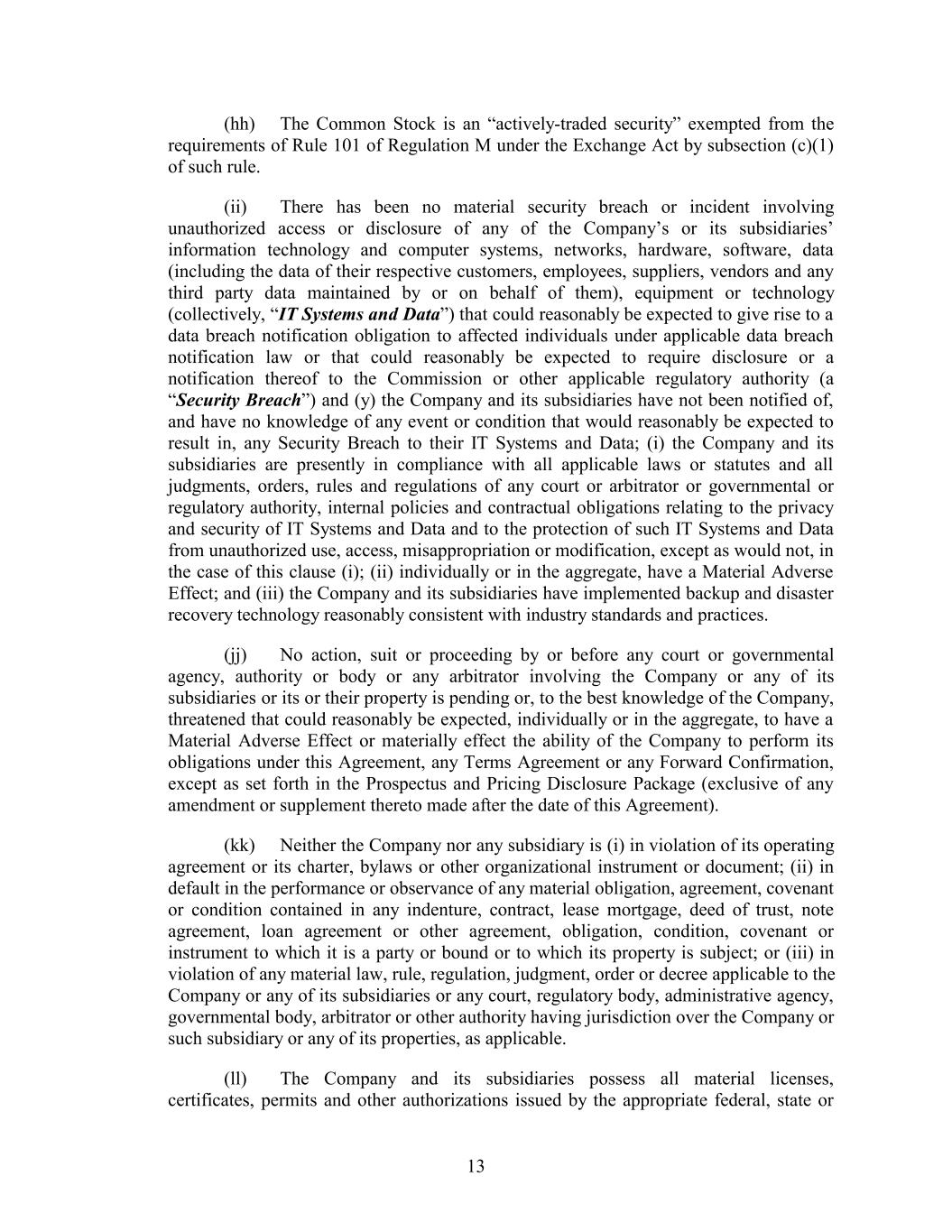 (hh)普通股是一种“活跃交易的证券”,根据《交易法》第(c)(1)款,该规则豁免了第M条规则101的要求。(二)公司或其子公司的任何信息技术和计算机系统、网络、硬件、软件、数据(包括其各自客户、雇员、供应商、供应商的数据以及由其维护或代表其维护的任何第三方数据)、设备或技术(统称,“IT系统和数据”)可以合理预期会根据适用的数据泄露通知法对受影响的个人产生数据泄露通知义务,或者可以合理预期会要求向委员会或其他适用的监管机构披露或通知相关信息(“安全漏洞”),以及(y)公司及其子公司没有收到通知,也不知道合理预期会导致的任何事件或情况,对其IT系统和数据的任何安全漏洞;(i)公司及其子公司目前遵守所有适用的法律或法规以及任何法院或仲裁员或政府或监管机构的所有判决、命令、规则和条例、与IT系统和数据的隐私和安全以及保护此类IT系统和数据免受未经授权的使用、访问、盗用或修改有关的内部政策和合同义务,除非在本(i)条的情况下不会这样做;(ii)单独或合计,有重大不利影响;及(iii)公司及其附属公司已实施合理符合行业标准及惯例的备份及灾后恢复技术。(jj)任何法院或政府机构、权威机构或机构或任何仲裁员涉及公司或其任何附属公司或其财产的任何诉讼、诉讼或程序均未待决,或据公司所知,威胁可合理预期个别或总体上会对公司履行本协议、任何条款协议或任何远期确认书项下义务的能力产生重大不利影响或产生重大影响,招股说明书和定价披露包中规定的除外(不包括在本协议日期之后作出的任何修订或补充)。(kk)公司或任何附属公司均未(i)违反其经营协议或其章程、附例或其他组织文书或文件;(ii)在履行或遵守任何契约、合同、租赁抵押、信托契据、票据协议、贷款协议或其作为一方或受其约束或其财产受其约束的其他协议、义务、条件、契诺或文书所载的任何重大义务、协议、契诺或条件方面违约;或(iii)违反任何重大法律、规则、条例、判决,适用于公司或其任何附属公司或任何法院、监管机构、行政机构、政府机构、仲裁员或对公司或该附属公司或其任何财产(如适用)具有管辖权的其他当局的命令或法令。(ll)公司及其附属公司拥有适当的联邦、州或13所颁发的所有材料许可证、证书、许可证和其他授权