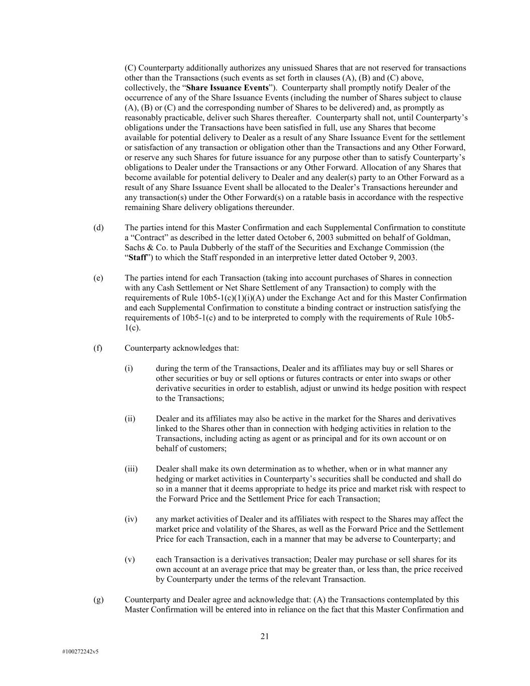 21 # 100272242v5(C)交易对方额外授权任何未预留用于交易以外的交易的未发行股份(如上文(a)、(b)及(c)条所述的事件,统称“股份发行事件”)。交易对手方应将任何股份发行事件的发生(包括受(A)、(B)或(C)条款约束的股份数量及相应的股份交付数量)及时通知交易商,并在合理可行的情况下尽快在其后交付该等股份。在交易对手在交易项下的义务全部得到履行之前,交易对手不得将因任何股份发行事件而可能交付给交易商的任何股份用于结算或履行交易及任何其他远期以外的任何交易或义务,或为未来发行保留任何该等股份,用于履行交易或任何其他远期下交易对手对交易商的义务以外的任何目的。因任何股份发行事件而可供潜在交付给交易商和其他远期的任何交易商(其)方的任何股份的分配,应根据各自在其下的剩余股份交付义务,按可按比例分配给交易商在本协议下的交易和其他远期下的任何交易。(d)各方拟就本主确认书及每项补充确认书构成日期为2003年10月6日代表高盛,Sachs & Co.向美国证券交易委员会(Securities and Exchange Commission)职员Paula Dubberly(“职员”)提交的信函中所述的“合同”,该职员在日期为2003年10月9日的解释性信函中对此作出了回复。(e)各方打算就每笔交易(考虑到与任何交易的任何现金结算或净股份结算有关的股份购买)遵守《交易法》第10b5-1(c)(1)(i)(a)条的要求,并就本主确认书和每项补充确认书而言,构成满足10b5-1(c)要求的具有约束力的合同或指示,并被解释为符合规则10b5-1(c)的要求。(f)交易对手承认:(i)在交易期限内,交易商及其关联公司可能会买卖股份或其他证券或买卖期权或期货合约或订立掉期或其他衍生证券,以建立、调整或解除其与交易相关的对冲头寸;(ii)交易商及其关联公司也可能活跃于与股份相关的股份和衍生工具的市场,但与交易相关的对冲活动除外,包括作为代理人或委托人以及为自己或代表客户;(iii)交易商应自行决定是否、何时或以何种方式进行交易对手证券的任何套期保值或市场活动,并应以其认为适当的方式进行,以对冲其与远期价格和每笔交易的结算价有关的价格和市场风险;(iv)交易商及其关联公司与股份有关的任何市场活动可能会影响股份的市场价格和波动性,以及每笔交易的远期价格和结算价,每笔交易的方式均可能对交易对手不利;(v)每笔交易均为衍生品交易;交易商可为自己的账户以可能高于或低于交易对手根据相关交易条款收到的价格的平均价格购买或出售股票。(g)交易对手和交易商同意并承认:(a)本主确认书所设想的交易将依据本主确认书和