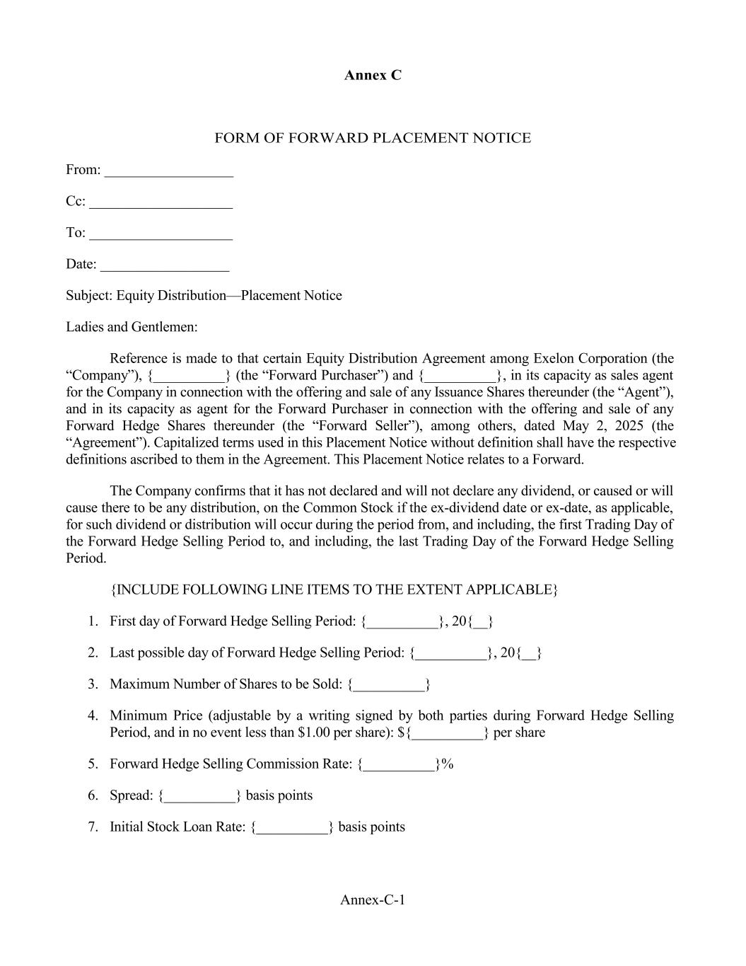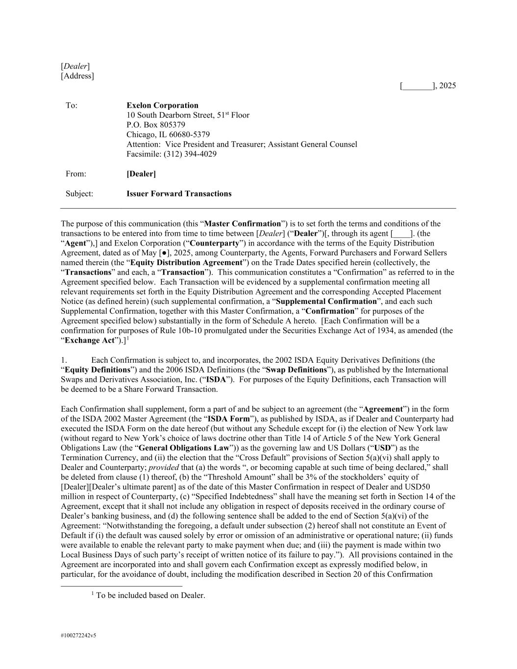 # 100272242v5 [交易商] [地址] [ ______ ],2025 to:爱克斯龙公司 10 South Dearborn Street,51 Floor P.O. Box 805379 Chicago,IL 60680-5379注意:副总裁兼财务主管;助理总法律顾问传真:(312)394-4029 from:[交易商] subject:发行人转发交易本通讯(本“主确认”)的目的是阐明[交易商](“交易商”)之间不时订立的交易的条款和条件[,通过其代理[ _____ ]。(“代理人”)、】和爱克斯龙公司(“交易对方”)根据截至2025年5月[ ● ]日的交易对方、其中指定的代理、远期买方和远期卖方之间在本协议规定交易日期(“Equity Distribution协议”)的条款(统称“交易”,每一项为“交易”)。本通讯构成下文规定的协议中提及的“确认”。每笔交易将由一份补充确认书作为证明,该补充确认书基本上以附表A的形式满足了Equity Distribution协议和相应的已接受的配售通知(定义见本协议)中规定的所有相关要求(该等补充确认书,“补充确认书”,以及每一份该等补充确认书,连同本主确认书,就下文所指明的协议而言为“确认书”)。[每次确认将是根据经修订的1934年《证券交易法》(“交易法”)颁布的规则10b-10的确认。] 11。每份确认均受制于并纳入了国际掉期和衍生品协会(International Swaps and Derivatives Association,Inc.,“ISDA”)发布的2002年ISDA股票衍生品定义(“股票定义”)和2006年ISDA定义(“掉期定义”)。就权益定义而言,每笔交易将被视为股份远期交易。每份确认书应补充、构成ISDA 2002主协议(“ISDA表格”)形式的协议(“协议”),并受ISDA公布的协议(“协议”)约束,如同交易商和交易对手已在本协议日期执行ISDA表格(但没有任何附表,但(i)选择纽约州法律(不考虑纽约一般义务法(“一般义务法”)第5条第14条以外的纽约法律选择原则)作为准据法和美元(“USD”)作为终止货币,(ii)选择第5(a)(vi)条的“交叉违约”条款适用于交易商和交易对手;但条件是(a)“,或在被宣布时变得有能力,”应从其第(1)款中删除,(b)“门槛金额”应为[交易商] [交易商最终母公司]截至本主确认书之日关于交易商的股东权益的3%和关于交易对手的5000万美元,(c)“特定债务”应具有协议第14节中规定的含义,但不包括与交易商银行业务正常过程中收到的存款有关的任何义务,(d)应在协议第5(a)(vi)节末尾添加以下句子:“尽管有上述规定,如果(i)违约完全是由行政或操作性质的错误或遗漏造成的;(ii)有资金可用于使相关方能够在到期时付款;以及(iii)在该方收到其未付款的书面通知后的两个当地营业日内付款,则根据本条第(2)款发生的违约不构成违约事件。”)。协议中包含的所有条款均被纳入并应适用于每项确认,但下文明确修改的除外,特别是为免生疑问,包括本确认1第20节中描述的基于交易商的修改。