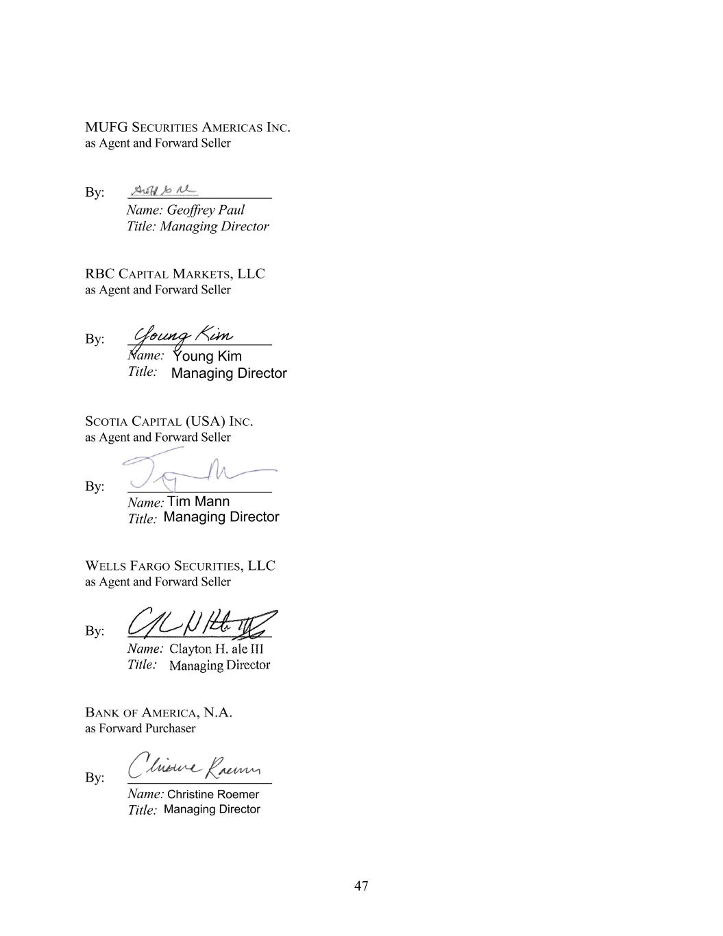 MUFG SECURITIES AMERICAS INC.作为代理和远期卖方由:RBC CAPITAL Markets,LLC作为代理和远期卖方由:名称:标题:SCOTIA CAPITAL(USA)INC.作为代理和远期卖方由:名称:标题:WELLS FARGO SECURITIES,LLC作为代理和远期卖方由:Bank of AMERICA,N.A.作为远期买方由:名称:标题:47 Christine Roemer董事总经理姓名:Geoffrey Paul职务:董事总经理Young Kim董事总经理Tim Mann董事总经理姓名:Clayton H. ale Ill职务:董事总经理