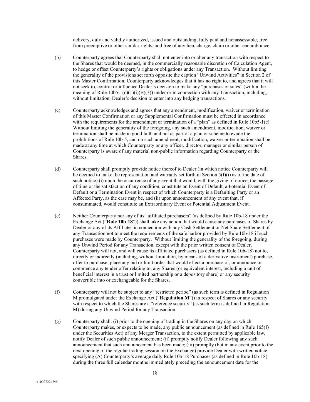 18 # 100272242v5交付,正式和有效授权,已发出和未结清,已全额支付和不可评估,没有优先购买权或其他类似权利,也没有任何留置权、押记、索赔或其他产权负担。(b)交易对手同意,交易对手不得就计算代理的商业上合理的酌处权将被视为对冲或抵消交易对手在任何交易下的权利或义务的股份进行或更改任何交易。在不限制本主确认书第2节中“解除活动”标题相对的规定的一般性的情况下,交易对手承认其无权且同意其不会寻求、控制或影响交易商根据任何交易或与任何交易相关的任何“购买或销售”(在规则10b5-1(c)(1)(i)(b)(3)的含义内)的决定,包括但不限于交易商进行任何对冲交易的决定。(c)交易对方承认并同意,对本主确认书或任何补充确认书的任何修改、修改、放弃或终止必须按照规则10b5-1(c)中定义的“计划”的修改或终止要求进行。在不限制前述一般性的情况下,任何该等修订、修改、放弃或终止均应善意作出,而非作为规避规则10b-5禁止的计划或计划的一部分,且不得在交易对手或交易对手的任何高级人员、董事、经理或类似人士知悉任何有关交易对手或股份的重大非公开信息的任何时间作出该等修订、修改、放弃或终止。(d)交易对手须迅速向交易商提供有关通知(在该通知中,交易对手将被视为在该通知日期作出第5(f)(i)条所述的陈述和保证)(i)在任何事件发生时,而该事件将随着通知的发出、时间的推移或任何条件的满足而构成违约事件、潜在违约事件或终止事件,而交易对手是违约方或受影响方(视情况而定),及(ii)在宣布任何事件后,如果完成,将构成非常事件或潜在调整事件。(e)交易对手或其任何“关联购买者”(根据《交易法》第10b-18条规则(“第10b-18条规则”)的定义)均不得采取任何行动,导致交易商或其任何关联公司就任何交易的任何现金结算或净股份结算进行的任何股份购买不符合规则10b-18提供的安全港要求,前提是此类购买是由交易对手进行的。在不限制前述一般性的情况下,在任何交易的任何解盘期内,除非事先征得交易商的书面同意,否则交易对手将不会,并将促使其关联购买者(定义见规则10b-18)不直接或间接(包括但不限于通过衍生工具)购买、要约购买、发出任何将导致购买任何股份(或同等权益)、或宣布或开始任何要约收购的任何出价或限价令,包括信托或有限合伙的实益权益单位或存托股份)或任何可转换为或可交换股份的证券。(f)在任何交易的任何解盘期内,交易对手将不会受到任何有关股份或股份为“参考证券”的任何证券的“限制期”(该术语在根据《交易法》颁布的条例M(“条例M”)中定义)。(g)交易对手方应:(i)在适用法律允许的范围内,在交易对手方就任何合并交易作出或预期作出任何公开公告(定义见《证券法》第165(f)条)的任何日期的股票开盘交易之前,将该等公告通知交易商;(ii)在任何该等公告后迅速通知交易商该等公告已作出;(iii)迅速(但无论如何在交易所常规交易时段的下一次开盘前)向交易商提供书面通知,指明(a)交易对手在紧接公告日期前三个完整日历月内的平均每日第10b-18条规则的购买量(定义见第10b-18条规则)