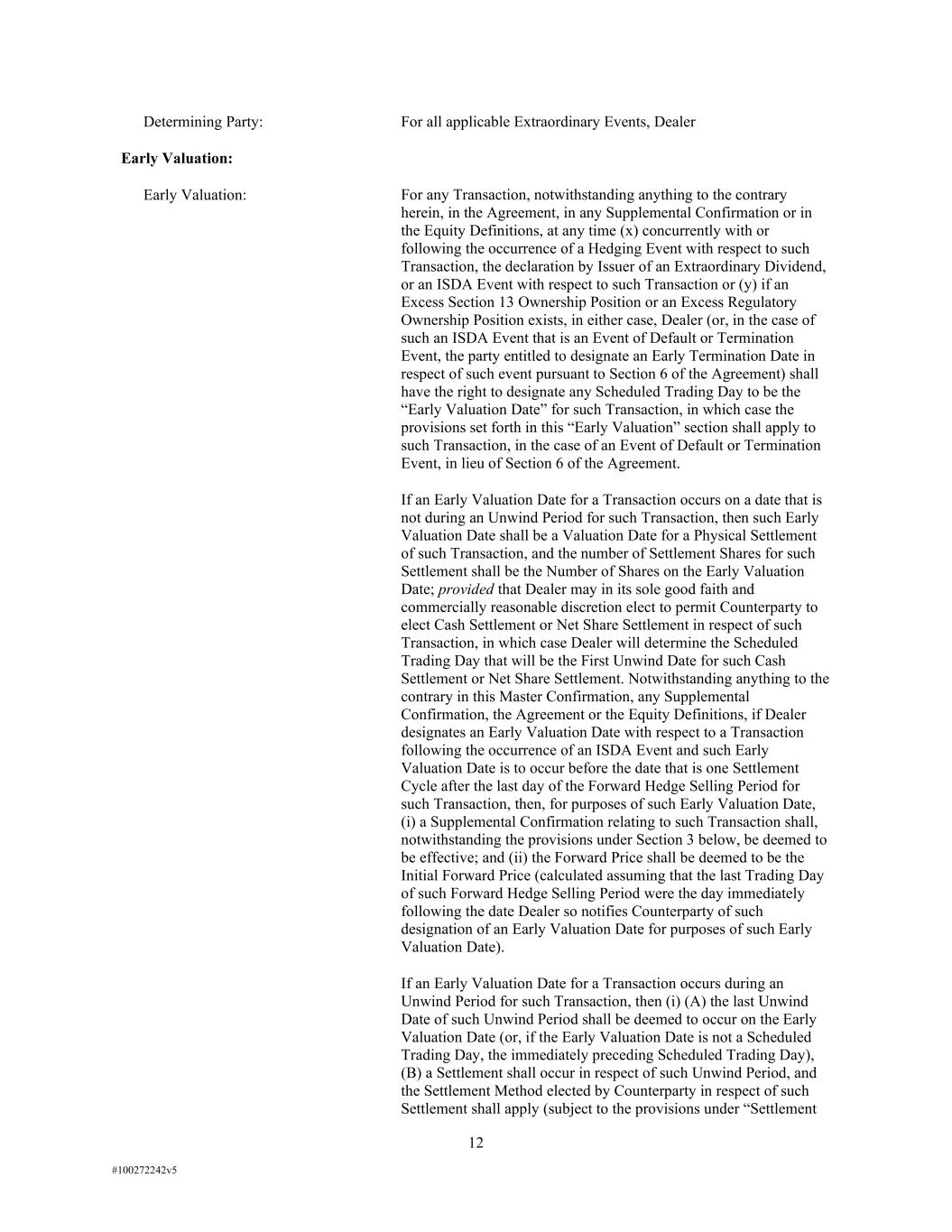 12 # 100272242v5决定方:对于所有适用的非常事件,交易商提前估值:提前估值:对于任何交易,尽管有本协议中的任何相反规定,在协议中、在任何补充确认中或在股权定义中,在与该交易相关的对冲事件发生时或之后的任何时间(x),发行人宣布特别股息,或与该交易相关的ISDA事件,或(y)如果存在超额第13条所有权头寸或超额监管所有权头寸,在任何一种情况下,交易商(或,在此类ISDA事件属于违约事件或终止事件的情况下,有权根据协议第6条就该事件指定提前终止日期的一方)有权指定任何预定交易日为该交易的“提前估值日期”,在这种情况下,在发生违约或终止事件的情况下,本“提前估值”部分规定的条款应适用于该交易,而不是协议第6条。如果某项交易的提前估值日期发生在不在该交易解盘期的日期,则该提前估值日期应为该交易的实物结算的估值日期,该结算的结算股份数量应为该提前估值日期的股份数量;但交易商可凭其唯一善意和商业上合理的酌情权选择允许交易对手就该交易选择现金结算或净股份结算,在这种情况下,交易商将确定将是此类现金结算或净份额结算的第一个解盘日的预定交易日。尽管本主确认书、任何补充确认书、协议或权益定义中有任何相反的规定,如果交易商在ISDA事件发生后就某项交易指定了一个提前估值日期,而该提前估值日期将发生在该交易的远期套期保值销售期最后一天之后的一个结算周期的日期之前,那么,就该提前估值日期而言,(i)与该交易有关的补充确认书,尽管有下文第3节的规定,被视为有效;(ii)远期价格应被视为初始远期价格(计算时假设该远期对冲卖出期的最后交易日是紧接交易商就该提前估值日期向交易对手如此通知该指定的提前估值日期的日期的次日)。如交易的提前估值日期发生在该交易的解盘期内,则(i)(a)该解除盘期的最后一次解除盘日应被视为发生在该提前估值日(或,如该提前估值日不是预定交易日,则为紧接的前一个预定交易日),(b)该解除盘期应发生结算,并适用交易对手就该结算选择的结算方式(但须遵守“结算