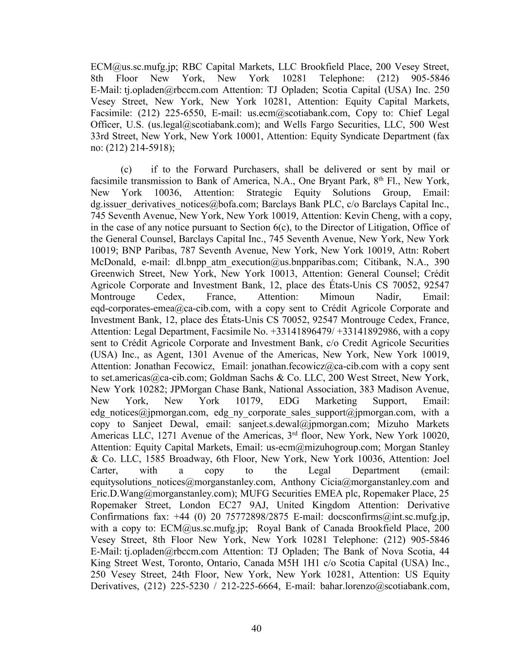 ECM @ us.sc.mufg.jp;RBC Capital Markets,LLC Brookfield Place,200 Vesey Street,8th Floor New York,New York 10281电话:(212)905-5846邮箱:tj.opladen@rbccm.com收件人:TJ Opladen;Scotia Capital(USA)Inc. 250 Vesey Street,New York,New York 10281,收件人:Equity Capital Markets,传真:(212)225-6550,邮箱:us.ecm@scotiabank.com,抄送:美国首席法务官(us.legal@scotiabank.com);及富国银行 Securities,LLC,500 West 33rd Street,New York,New York 10001,收件人:Equity Syndicate8th FL.,New York,New York 10036,收件人:Strategic Equity Solutions Group,Email:dg.issuer _ derivatives _ notices@bofa.com;巴克莱银行 PLC,c/o BARCLAYS CAPITAL INC.,745 Seventh Avenue,New York,New York 10019,收件人:郑嘉颖,连同一份副本,如根据第6(c)节发出任何通知,请向总法律顾问办公室诉讼总监BARCLAYS CAPITAL INC.,745 Seventh Avenue,New York,New York 10019;BNP Paribas,787 Seventh Avenue,New York,New York 10019,Attn:Robert McDonald,e-mail:dl.bnpp _ atm _ execution@us.bnpparibas.com;Citibank,N。关注:总法律顾问;法国农业信贷银行,12,Place des é tats-Unis CS 70052,92547 Montrouge Cedex,France,关注:Mimoun Nadir,Email:eqd-corporates-emea@ca-cib.com,并抄送法国农业信贷银行,12,Place des é tats-Unis CS 70052,92547 Montrouge Cedex,France,关注:Legal Department,Facsimile No。+ 33141896479/+ 33141892986,附送法国农业信贷银行企业和投资银行,c/o法国农业信贷证券(美国)公司,作为代理,1301 Avenue of the Americas,New York,New York 10019,收件人:Jonathan Fecovicz,邮箱:jonathan.fecowicz@ca-cib.com,并附送set.americas@ca-cib.com;高盛 Sachs & Co. LLC,200 West Street,New York,New York 10282;摩根大通 Bank,National Association,383 Madison Avenue,New York,New York 10179,EDG Marketing Support,Email:edg _ notices@jpmorgan.com,edg _ ny _ corporate _ sales _ support @ jpm关注:Equity Capital Markets,Email:us-ecm@mizuhogroup.com;摩根士丹利 & Co. LLC,1585 Broadway,6th Floor,New York,New York,10036,Attention:Joel Carter,with a copy to the Legal Department(email:equitysolutions _ notices@morganstanley.com,Anthony Cicia@morganstanley.com and Eric.D.Wang@morganstanley.com);MUFG Securities EMEA plc,Ropemaker Place,25 Ropemaker Street,London EC27 9AJ,United Kingdom Attention:Derivative Confirmations传真:+ 44(0)2075772898/2875 E-mail:加拿大安大略省M5H 1H1 c/o Scotia Capital(USA)Inc.,250 Vesey Street,24th Floor,New York,New York 10281,关注:US Equity Derivatives,(212)225-5230/212-225-6664,E-mail:bahar.lorenzo@scotiabank.com,40