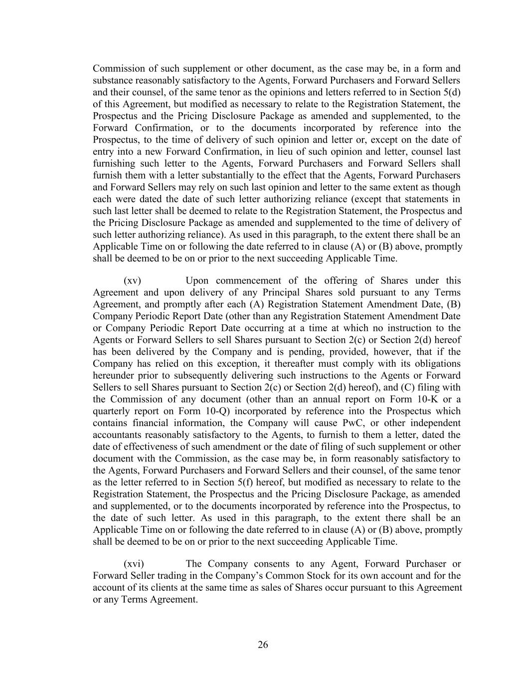 以代理人、远期买方和远期卖方及其大律师合理满意的形式和实质委托该等补充文件或其他文件(视情况而定),其期限与本协议第5(d)节中提及的意见和信函相同,但必要时进行了修改,以涉及经修订和补充的注册声明、招股说明书和定价披露包、远期确认书,或通过引用并入招股说明书的文件,直至该等意见和信函送达之时,或,除非在订立新的远期确认书之日,律师最后一次向代理、远期买方和远期卖方提供此类信函,以代替此类意见和信函,否则应向他们提供一封信函,大意是代理、远期买方和远期卖方可以在相同程度上依赖此类最后意见和信函,就好像每封信的日期都是授权依赖的此类信函的日期一样(但该最后一封信中的陈述应被视为与登记声明有关,经修订和补充的招股说明书和定价披露包对该授权信的交付时间)。如本款所用,在上文(a)或(b)款所述日期当日或之后有适用时间的范围内,应迅速视为在下一个适用时间当日或之前。(十五)在根据本协议开始发售股份及交付根据任何条款协议出售的任何主要股份时,以及在每个(a)登记声明修订日期、(b)公司定期报告日期(任何登记声明修订日期或公司定期报告日期除外,该日期发生在公司未交付任何根据本协议第2(c)条或第2(d)条向代理或远期卖方出售股份的指示且尚待执行的时间,但前提是,如果公司依赖这一例外情况,其后,它必须遵守其在本协议项下的义务,然后才能根据本协议第2节(c)或第2节(d)向代理或远期卖方交付此类指示以出售股份,以及(c)向委员会提交任何以引用方式并入招股说明书的文件(表格10-K的年度报告或表格10-Q的季度报告除外),其中包含财务信息,公司将促使普华永道或其他合理地令代理满意的独立会计师向他们提供信函,日期为该等修订的生效日期或向监察委员会提交该等补充文件或其他文件(视属何情况而定)的日期,其形式为代理人、远期买方及远期卖方及其律师合理满意,与本协议第5(f)节所提述的信函相同,但经必要修改以与经修订和补充的注册声明、招股章程和定价披露包有关,或与以提述方式并入招股章程的文件有关,直至该等信函的日期。如本款所用,在上文(a)或(b)款所述日期当日或之后有适用时间的范围内,应迅速视为在下一个适用时间当日或之前。(xvi)公司同意任何代理人、远期买方或远期卖方在根据本协议或任何条款协议进行股份销售的同时,为自己和客户的账户交易公司普通股。26