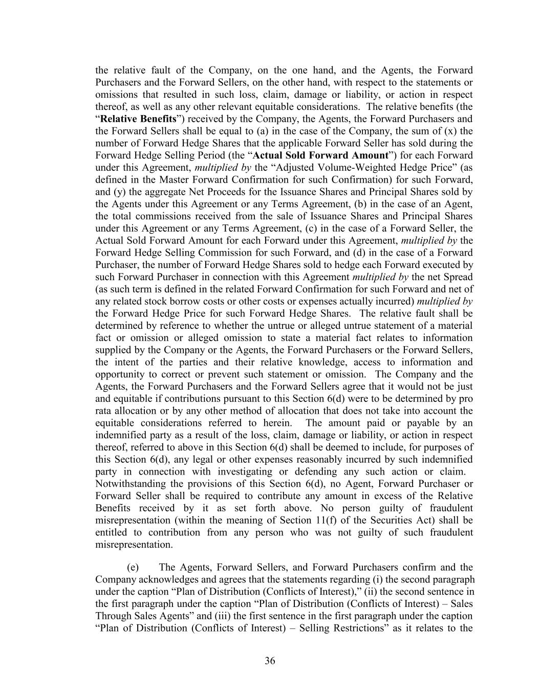 一方面,公司与代理、远期买方和远期卖方在导致此类损失、索赔、损害或责任的陈述或遗漏或与此相关的诉讼以及任何其他相关衡平法考虑方面的相对过错。公司、代理、远期买方和远期卖方获得的相对利益(“相对利益”)应等于(a)在公司的情况下,适用的远期卖方在远期对冲售期内就本协议项下的每笔远期出售的远期对冲股份数量(“实际出售的远期金额”)之和乘以该远期的“调整后的成交量加权对冲价”(定义见此类确认的主远期确认书),及(y)代理根据本协议或任何条款协议出售的发行股份及本金股份的总收益净额,(b)就代理人而言,根据本协议或任何条款协议出售发行股份及本金股份所得的总佣金,(c)就远期卖方而言,根据本协议每笔远期的实际出售远期金额,乘以该远期的远期对冲销售佣金,及(d)就远期买方而言,为对冲该远期买方就本协议执行的每笔远期而出售的远期对冲股份的数量乘以净价差(该术语在该远期的相关远期确认书中定义,并扣除任何相关的股票借贷成本或实际发生的其他成本或费用)乘以该远期对冲股份的远期对冲价格。相对过错应参照对重大事实的不真实或被指称的不真实陈述或遗漏或被指称的遗漏陈述重大事实是否涉及公司或代理、远期买方或远期卖方提供的信息、各方的意图及其相关知识、获取信息的机会以及纠正或防止此类陈述或遗漏的机会来确定。本公司与代理、远期买方和远期卖方一致认为,如果根据本条第6(d)款以按比例分配或任何其他分配方法确定未考虑到此处提及的公平考虑,则将不是公正和公平的。就本条第6(d)款而言,获弥偿一方因上述损失、申索、损害或赔偿责任或与此有关的诉讼而支付或应付的款额,须当作包括该获弥偿一方就调查或抗辩任何该等诉讼或申索而合理招致的任何法律或其他开支。尽管有本条第6(d)款的规定,任何代理人、远期买方或远期卖方均不得被要求提供超过其收到的上述相对利益的任何金额。任何犯有欺诈性虚假陈述罪的人(在《证券法》第11(f)条的含义内)均无权从任何未犯此类欺诈性虚假陈述罪的人那里获得贡献。(e)代理、远期卖方和远期买方确认且公司承认并同意有关(i)标题“分配计划(利益冲突)”下的第二段的陈述,(ii)标题“分配计划(利益冲突)–通过销售代理进行的销售”下的第一段第二句和(iii)标题“分配计划(利益冲突)–销售限制”下的第一段第一句话,因为它与36