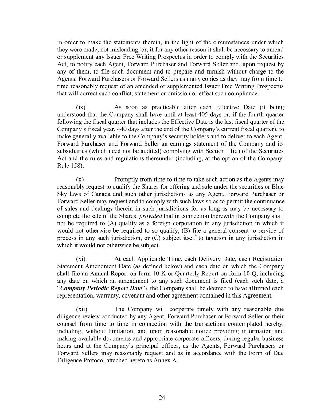 为了作出其中的陈述,根据作出这些陈述的情况,不会产生误导,或者,如果出于任何其他原因,为了遵守《证券法》,有必要修改或补充任何发行人的免费书面招股说明书,通知每个代理、远期买方和远期卖方,并应其中任何人的要求,归档此类文件,并免费准备和提供给代理,远期买方或远期卖方可能会不时合理地要求修订或补充的发行人自由编写招股说明书的尽可能多的副本,以更正此类冲突、陈述或遗漏,或影响此类合规。(ix)在每个生效日期后(据了解,公司须在至少405天前,或如包括生效日期的财政季度之后的第四季度是公司财政年度的最后一个财政季度,则在公司当前财政季度结束后的440天内),在切实可行范围内尽快向公司的证券持有人提供并向各代理人交付,远期买方和远期卖方公司及其子公司(无需审计)的收益报表,符合《证券法》第11(a)条及其下的规则和条例(包括,根据公司的选择,第158条)。(x)不时迅速采取代理人可能合理要求的行动,以符合根据加拿大证券或蓝天法律及任何代理人等其他司法管辖区发售和出售的股份的资格,远期买方或远期卖方可要求并遵守该等法律,以便允许在该等法域的销售和交易持续至可能需要的时间,以完成股份的销售;但与此有关,公司无须(a)在任何司法管辖区符合外国公司的资格,而在其他情况下,公司无须符合该资格,(b)在任何该等司法管辖区提交一般送达程序同意书,或(c)在其原本不会受其管辖的任何司法管辖区受课税。(xI)在每个适用时间、每个交付日期、每个注册声明修订日期(定义见下文)及公司须就表格10-K提交年度报告或表格10-Q提交季度报告的每个日期,包括任何该等文件的修订提交的任何日期(每个该等日期,“公司定期报告日期”),公司须当作已确认本协议所载的每项陈述、保证、契诺及其他协议。(xii)公司将及时配合任何代理、远期买方或远期卖方或其律师不时就本协议所设想的交易进行的任何合理尽职审查,包括但不限于并在提供信息和提供文件及适当的公司高级管理人员的合理通知后,在正常营业时间内和在公司主要办事处,根据代理、远期买方或远期卖方可能合理要求并按照附件A所附的尽职调查议定书的形式进行。24