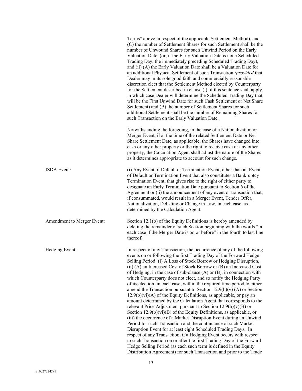 13 # 100272242v5条款》以上有关适用的结算方式),及(c)该等结算的结算股份数目,须为在提早估值日(或如提早估值日并非预定交易日,则为紧接前一预定交易日)该解盘期的未平仓股份数目,(ii)(a)提前估值日期应为该交易的额外实物结算的估值日期(但交易商可凭其唯一善意和商业上合理的酌情权选择适用本句第(i)款所述的交易对手为结算选择的结算方式,在这种情况下,交易商将确定将是此类现金结算或净股份结算的第一个解盘日的预定交易日)和(b)此类额外结算的结算股份数量应是该交易在早期估值日的剩余股份数量。尽管有上述规定,在国有化或合并事件的情况下,如果在相关的结算日或净股份结算日(如适用)时,股份已变为现金或任何其他财产或收取现金或任何其他财产的权利,则计算代理人应酌情调整股份的性质,以计入该等变动。ISDA事件:(i)引起任何一方有权根据协议第6条指定提前终止日期的任何违约事件或终止事件,但也构成破产终止事件的违约事件或终止事件除外,或(ii)任何事件或交易的公告,如果完成,将导致合并事件、要约收购、国有化、退市或法律变更,在每种情况下,由计算代理确定。对合并事件的修订:现对股权定义第12.1(b)节进行修订,删除该节倒数第四行中以“在每种情况下,如果合并日期在或之前”开头的文字。对冲事件:就任何交易而言,在远期对冲卖出期的第一个交易日或之后发生以下任何事件:(i)股票借贷损失或对冲中断,(ii)(a)股票借贷成本增加或(b)对冲成本增加,在(a)或(b)项的情况下,交易对手方未选择,因此将其选择通知对冲方,在每种情况下,在规定的时间内根据权益定义第12.9(b)(v)(a)条或适用的权益定义第12.9(b)(vi)(a)条修订交易,或支付计算代理根据权益定义第12.9(b)(v)(b)条或适用的权益定义第12.9(b)(vi)(b)条确定的与相关价格调整相对应的金额,或(iii)在该交易的解套期间发生市场扰乱事件,并且该市场扰乱事件持续至少八个预定交易日。就任何交易而言,如在该交易的远期对冲卖出期(每个该等术语在Equity Distribution协议中定义)的第一个交易日或之后以及在该交易之前发生与该交易有关的套期保值事件