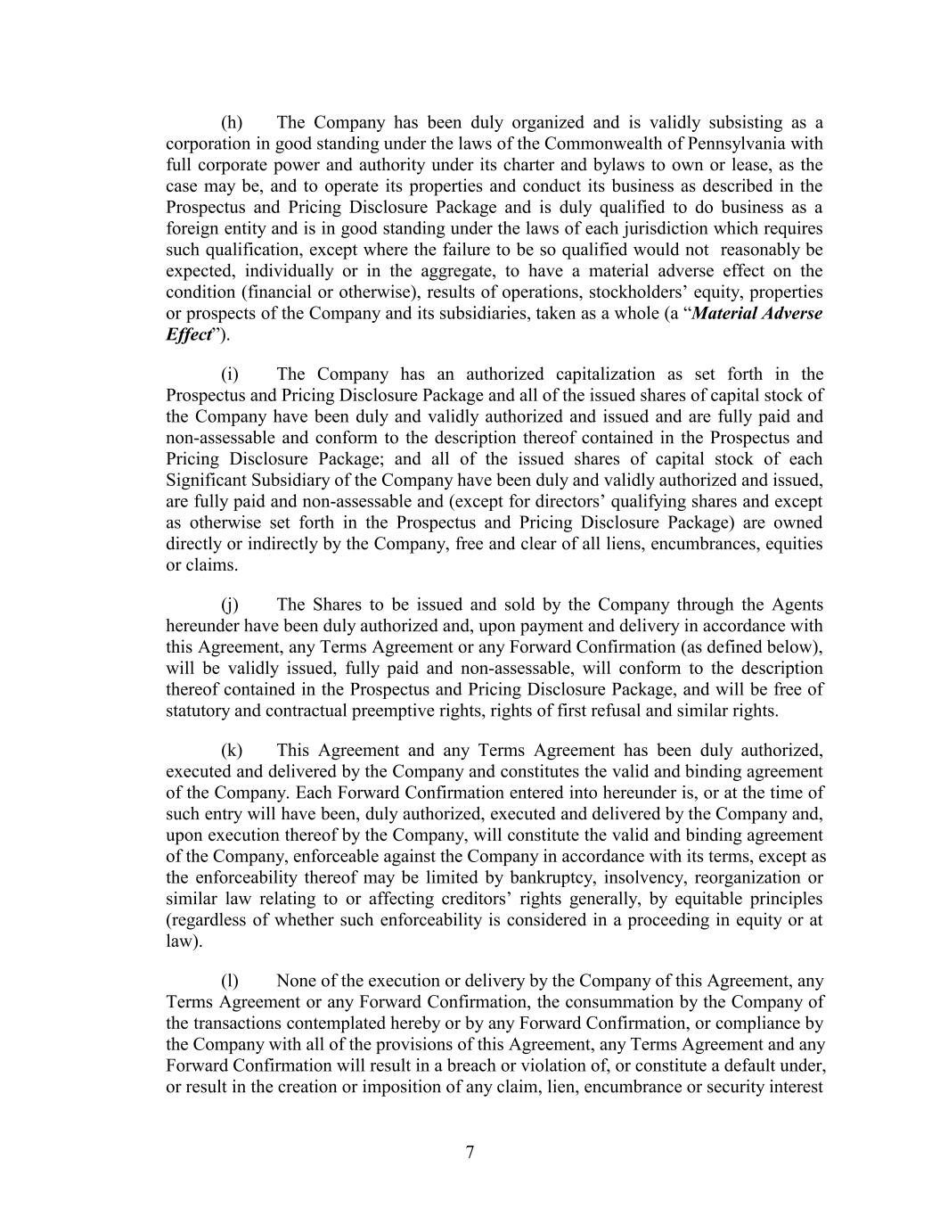 (h)公司已妥为组织,并正有效地作为根据宾夕法尼亚州联邦法律具有良好信誉的公司生存,根据其章程和附例拥有充分的公司权力和权力,以拥有或租赁(视情况而定),并按招股章程和定价披露包所述经营其财产和经营其业务,并具有作为外国实体开展业务的适当资格,并在要求这种资格的每个司法管辖区的法律下具有良好的信誉,除非未能如此符合资格将无法合理地预期个别或总体上对公司及其附属公司的整体状况(财务或其他方面)、经营业绩、股东权益、财产或前景(“重大不利影响”)产生重大不利影响(“重大不利影响”)。(i)公司拥有招股章程及定价披露资料包所载的授权资本,且公司所有已发行股本股份已获妥为及有效授权及发行,并已全数支付且不可评税,且符合招股章程及定价披露资料包所载的描述;及公司各重要附属公司的所有已发行股本股份已获妥为及有效授权及发行,是全额支付和不可评估的,并且(董事的合格股份除外,以及招股说明书和定价披露包中另有规定的除外)由公司直接或间接拥有,没有任何留置权、产权负担、股权或债权。(j)公司将透过本协议项下的代理发行及出售的股份已获正式授权,而在按照本协议付款及交付后,任何条款协议或任何远期确认书(定义见下文)将有效发行、全额支付及不可评估,将符合招股章程及定价披露资料包所载的描述,并将不附带法定及合约上的优先购买权、优先购买权及类似权利。(k)本协议及任何条款协议已获公司正式授权、签立及交付,并构成公司有效及具约束力的协议。根据本协议订立的每份远期确认书均由公司正式授权、签立和交付,或在该等订立时将已由公司正式授权、签立和交付,一旦公司签立,将构成公司的有效和具有约束力的协议,可根据其条款对公司强制执行,除非其可执行性可能受到破产、无力偿债、重组或一般与债权人权利有关或影响债权人权利的类似法律的限制,并受到衡平法原则的限制(无论此种可执行性是否在股权程序或法律程序中被考虑)。(l)公司执行或交付本协议、任何条款协议或任何远期确认书、公司完成本协议所设想的交易或通过任何远期确认书,或公司遵守本协议、任何条款协议和任何远期确认书的所有规定,均不会导致违反或违反,或构成违约,或导致产生或强加任何债权、留置权、产权负担或担保权益7