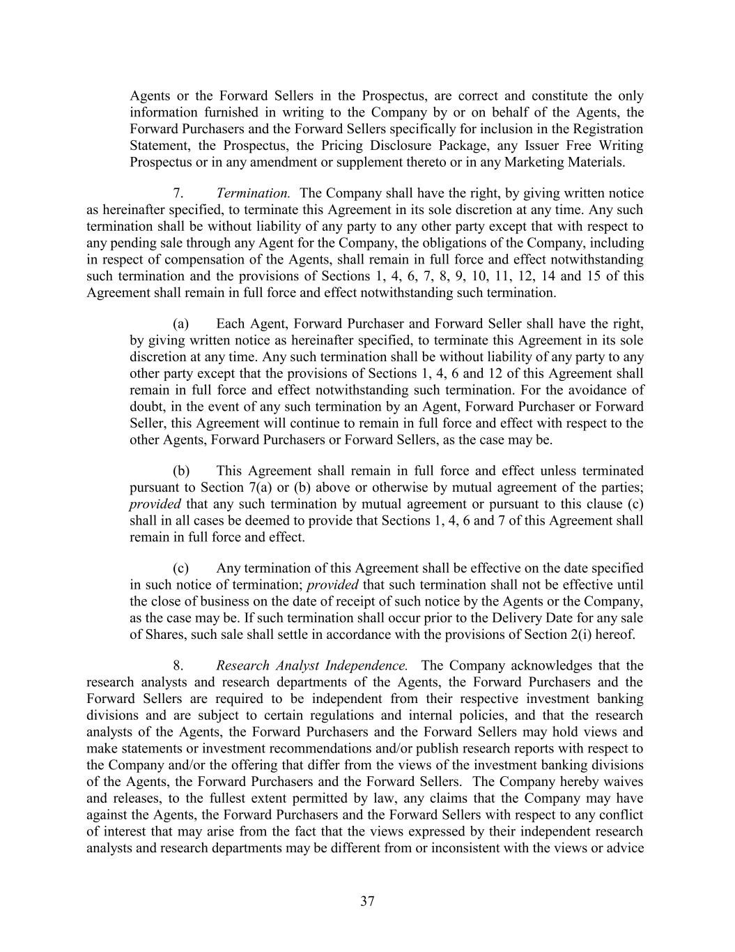 招股说明书中的代理或远期卖方,是正确的,并构成由或代表代理、远期买方和远期卖方以书面形式向公司提供的唯一信息,专门用于纳入注册声明、招股说明书、定价披露包、任何发行人自由编写的招股说明书或其任何修订或补充或任何营销材料。7.终止。本公司有权在任何时候通过发出以下具体规定的书面通知,自行决定终止本协议。任何该等终止均无须任何一方对任何其他一方承担法律责任,但就透过任何代理人为公司进行的任何待决销售而言,即使该等终止,公司的义务,包括有关对代理人的赔偿,仍须保持完全有效,而本协议第1、4、6、7、8、9、10、11、12、14及15条的规定,即使该等终止,仍须保持完全有效。(a)每一代理人、远期买方和远期卖方均有权在任何时候通过发出下文规定的书面通知,自行决定终止本协议。任何此种终止均无须任何一方对任何其他一方承担责任,但本协议第1、4、6和12条的规定应保持完全有效,尽管有此种终止。为免生疑问,如发生任何代理、远期买方或远期卖方的任何此类终止,本协议将继续对其他代理、远期买方或远期卖方(视情况而定)保持完全有效。(b)除非根据上述第7(a)或(b)条或经双方共同协议以其他方式终止,否则本协议应保持完全有效;但通过相互协议或根据本(c)条的任何此类终止在所有情况下均应被视为规定本协议第1、4、6和7条应保持完全有效。(c)本协议的任何终止应于该终止通知所指明的日期生效;但该终止应在代理人或公司(视情况而定)收到该通知之日的营业时间结束前生效。如果终止发生在任何股份出售的交付日期之前,则该出售应按照本协议第2(i)节的规定结算。8.研究分析师独立性。公司确认,代理、远期买方及远期卖方的研究分析师及研究部门须独立于各自的投资银行部门,并受若干法规及内部政策所规限,且代理、远期买方及远期卖方的研究分析师可能就公司及/或发售持有与代理、远期买方及远期卖方的投资银行部门的观点不同的观点及作出陈述或投资建议及/或发表研究报告。公司特此在法律允许的最大范围内放弃和解除公司就其独立研究分析师和研究部门所表达的观点可能与观点或建议不同或不一致而可能产生的任何利益冲突而可能对代理、远期买方和远期卖方提出的任何索赔37