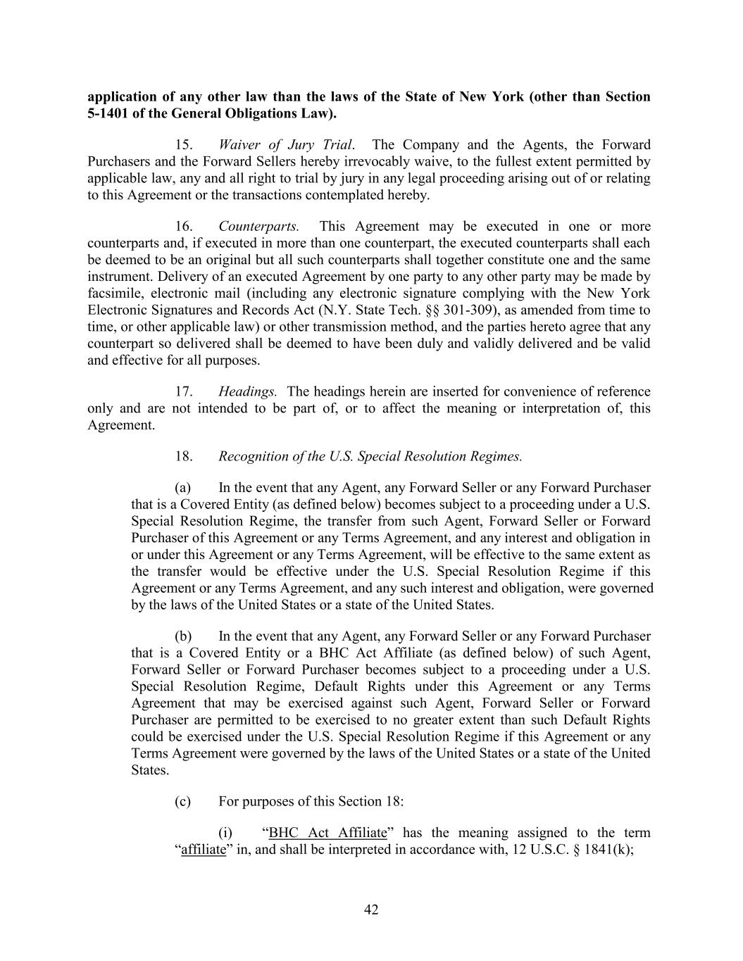 适用纽约州法律以外的任何其他法律(《一般义务法》第5-1401节除外)。15.放弃陪审团审判。本公司与代理、远期买方和远期卖方在此不可撤销地放弃在适用法律允许的最大范围内,在因本协议或本协议所设想的交易而产生或与之有关的任何法律程序中由陪审团审判的任何和所有权利。16.同行。本协议可以在一个或多个对应方中执行,如果在多个对应方中执行,则被执行的对应方应各自被视为原件,但所有这些对应方应共同构成同一文书。一方当事人向任何其他当事人交付已执行的协议,可以通过传真、电子邮件(包括任何符合《纽约电子签字和记录法》(N.Y. State Tech. § 301-309)(不时修订)或其他适用法律的电子签字)或其他传输方式进行,双方当事人同意,如此交付的任何对应方应被视为已妥为有效交付,并对所有目的均有效有效。17.标题。此处插入的标题仅为方便参考,并非旨在成为本协议的一部分,或影响本协议的含义或解释。18.承认美国特别决议制度。(a)如果任何代理、任何远期卖方或作为涵盖实体的任何远期买方(定义见下文)成为美国特别决议制度下的程序的受制人,则从该代理、远期卖方或远期买方转让本协议或任何条款协议,以及本协议或任何条款协议中或根据本协议或任何条款协议产生的任何利益和义务,将在与本协议或任何条款协议产生的转让在美国特别决议制度下有效的同等程度上有效,以及任何此类利益和义务,受美国法律或美国某州法律管辖。(b)如果任何代理人、任何远期卖方或任何作为涵盖实体或该代理人的BHC法案关联公司(定义见下文)的远期买方、远期卖方或远期买方成为受美国特别决议制度下的程序、本协议或可能对该代理人行使的任何条款协议下的违约权利的约束,如果本协议或任何条款协议受美国或美国某州法律管辖,则允许远期卖方或远期买方行使的程度不超过根据美国特别决议制度可以行使的此种默认权利。(c)就本第18条而言:(i)“BHC Act Affiliate”具有《12 U.S.C. § 1841(k)》中赋予“Affiliate”一词的含义,并应按照该含义进行解释;42