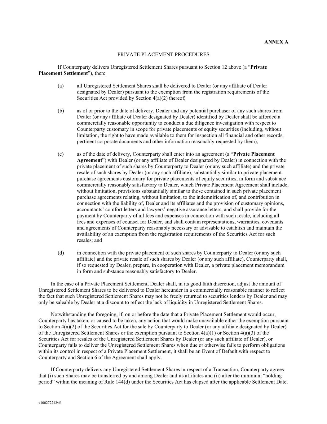 # 100272242v5附件A私募程序如果交易对手方根据上述第12条交付未登记的结算股份(“私募结算”),则:(a)所有未登记的结算股份应根据其第4(a)(2)条规定的《证券法》登记要求的豁免交付给交易商(或交易商指定的交易商的任何关联公司);(b)截至交付之日或之前,交易商和交易商确定的交易商(或交易商指定的交易商的任何关联公司)的任何此类股份的任何潜在购买者,应获得商业上合理的机会,对股本证券私募范围内惯常的交易对手进行尽职调查(包括但不限于有权向其提供所有财务和其他记录、相关公司文件和他们合理要求的其他信息以供查阅);(c)截至交割之日,交易对手应与交易商(或交易商指定的交易商的任何关联公司)就交易对手向交易商(或任何该等关联公司)私募配售该等股份以及交易商(或任何该等关联公司)私下转售该等股份订立协议(“私募协议”),该协议在形式和实质上与股权证券私募的惯常做法基本相似,且在商业上令交易商合理满意,该私募协议应包括但不限于与该等私募购买协议所载的内容基本相似的条款,有关但不限于,向交易商及其关联公司的赔偿和与其责任相关的分担以及提供惯常意见、会计师的安慰函和律师的否定保证函,并应规定交易对手支付与此类转售有关的所有费用和开支,包括为交易商提供法律顾问的所有费用和开支,并应包含陈述、保证,交易对手的契诺和协议是合理必要或可取的,以确立和维持此类转售可获得《证券法》登记要求的豁免;以及(d)就交易对手向交易商(或任何此类关联公司)私募配售此类股份以及交易商(或任何此类关联公司)非公开转售此类股份而言,交易对手应在交易商提出要求的情况下,与交易商合作,编制一份形式和内容均令交易商合理满意的私募备忘录。在私募结算的情况下,交易商应根据其善意酌情权,以商业上合理的方式调整根据本协议向交易商交付的未登记结算股份的数量,以反映该等未登记结算股份可能不会由交易商自由返还给证券出借人,而交易商只能以折扣价出售,以反映未登记结算股份缺乏流动性的情况。尽管有上述规定,如果在将发生私募结算之日或之前,交易对手已采取或导致采取任何行动,使交易对手根据《证券法》第4(a)(2)节就交易对手向交易商(或交易商指定的任何关联公司)出售未登记结算股份的豁免或根据《证券法》第4(a)(1)节或第4(a)(3)节就交易商(或交易商的任何此类关联公司)转售未登记结算股份的豁免,或交易对手未在到期时交付未登记的结算股份或以其他方式未能就私募结算履行其控制范围内的义务,则就交易对手而言即为违约事件,适用协议第6条。如果交易对手就某项交易交付任何未登记的结算股份,则交易对手同意(i)此类股份可由交易商及其关联公司转让并在其之间转让,以及(ii)在适用的结算日之后《证券法》第144(d)条所指的最短“持有期”过去后,