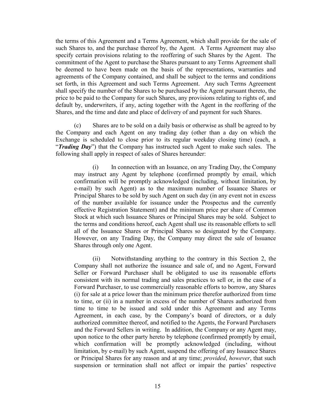 本协议和条款协议的条款,其中应规定向代理出售此类股份,并由代理购买。条款协议还可以具体规定与代理重新发售此类股份有关的某些条款。代理根据任何条款协议购买股份的承诺应被视为已根据本协议及该等条款协议所载公司的陈述、保证及协议作出,并应受本协议及该等条款协议所载的条款及条件所规限。任何该等条款协议须指明将由代理人依据该协议购买的股份数目、就该等股份向公司支付的价格、任何有关承销商(如有的话)在股份重新发售中与该代理人一起行事的权利和违约的规定,以及该等股份的交付和付款的时间、日期和地点。(c)股份须按公司与各代理人所议定的每日基准或其他方式在公司已指示该代理人进行该等销售的任何交易日(交易所预定在其正常工作日收盘时间之前收市的一天除外)(每个交易日,即“交易日”)出售。根据本协议出售股份适用以下规定:(i)就发行而言,在任何交易日,公司可通过电话指示任何代理(以电子邮件迅速确认,该确认将被迅速确认(包括但不限于,通过电子邮件)由该代理人)就该代理人在该日出售的发行股份或本金股份的最高数量(在任何情况下均不得超过根据《招股说明书》和现行有效的登记声明可供发行的数量)以及可出售该发行股份或本金股份的普通股的最低每股价格。在符合本协议条款和条件的情况下,各代理人应尽其合理努力出售公司如此指定的全部发行股份或本金股份。但在任何交易日,公司可仅通过一名代理机构指导销售发行股份。(ii)尽管本条第2条另有相反规定,公司不得授权发行及出售任何代理、远期卖方或远期买方,而任何代理人、远期卖方或远期买方均无义务使用其符合其正常交易及销售惯例的合理努力,以低于不时授权的最低价格出售任何股份(i),或就远期买方而言,使用商业上合理的努力借入任何股份(i),或(ii)数量超过公司董事会或其正式授权委员会根据本协议及任何条款协议不时授权发行及出售的股份数目,并以书面通知代理、远期买方及远期卖方。此外,公司或任何代理人经电话通知另一方(通过电子邮件迅速确认,该确认将由该代理人迅速确认(包括但不限于通过电子邮件))后,可在任何时间以任何理由暂停任何发行股份或本金股份的发售;但该暂停或终止不影响或损害双方各自的15