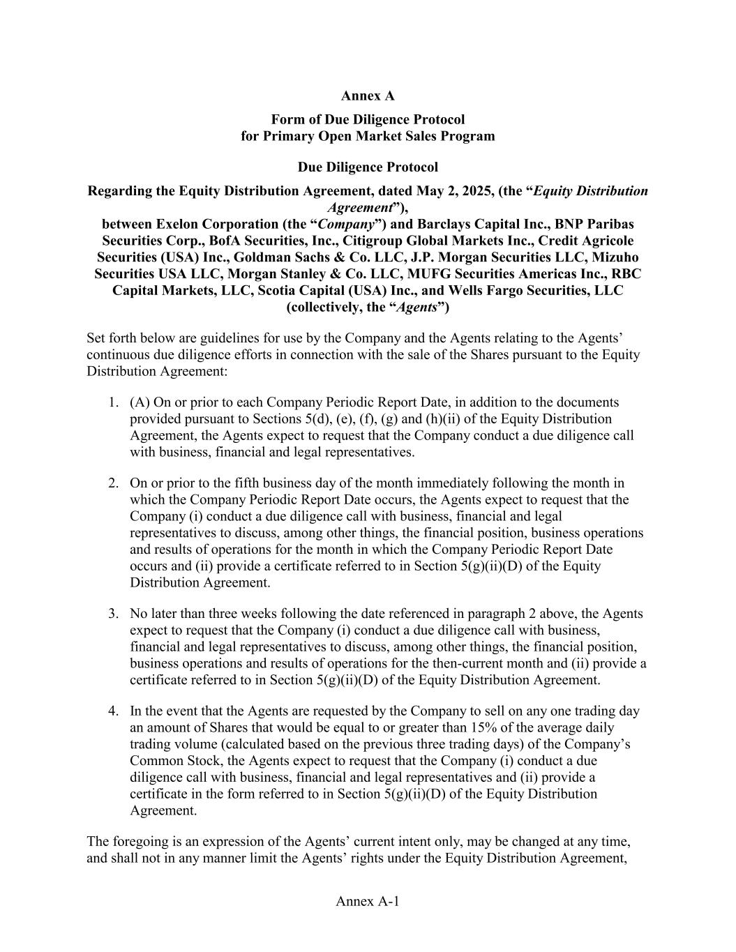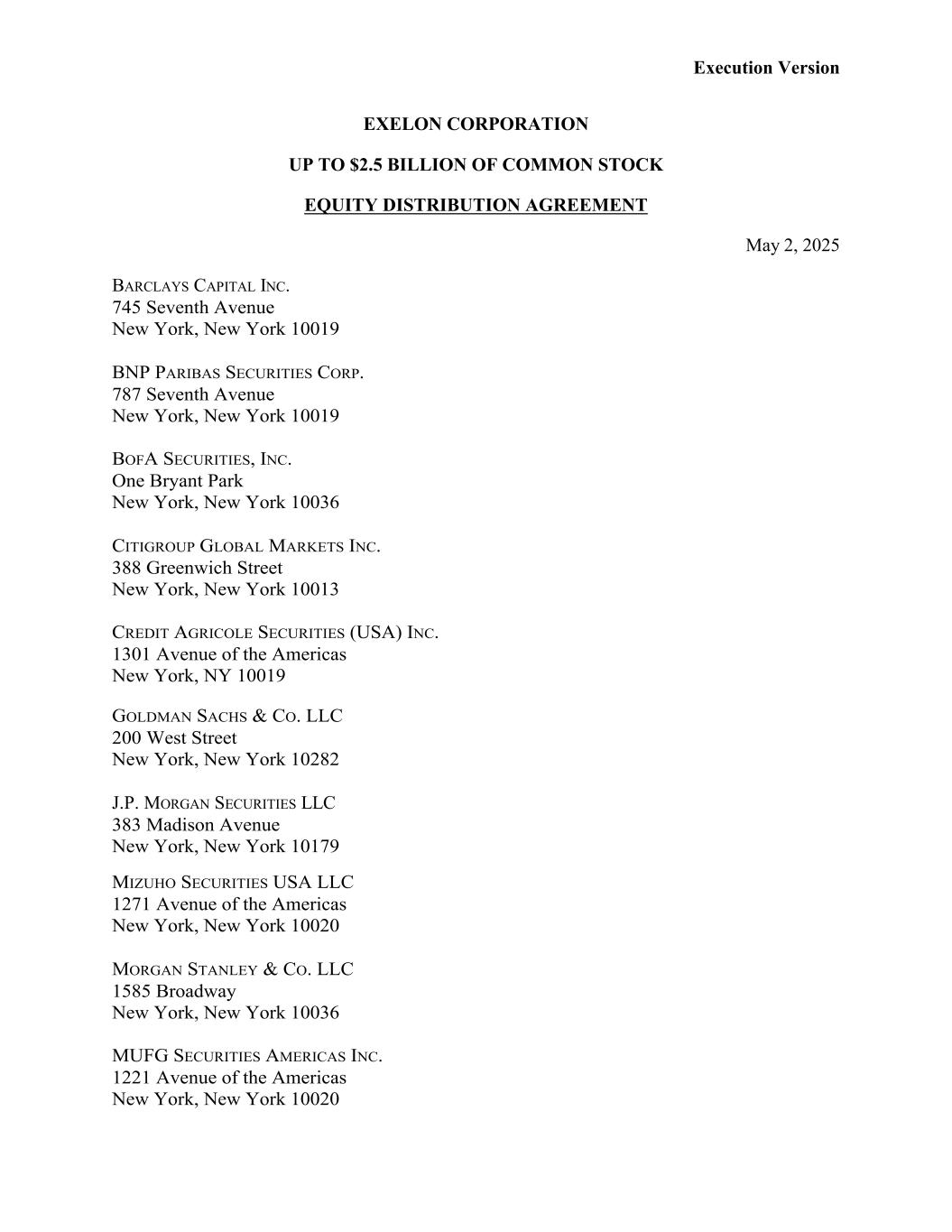 执行版EXELON CORPORATION高达25亿美元的普通股股票分配协议2025年5月2日BARCLAYS CAPITAL INC. 745 Seventh Avenue New York,New York 10019 BNP PARIBAS SECURITIES CORP. 787 Seventh Avenue New York,New York 10019 BOFA SECURITIES,INC。One Bryant Park New York,New York 10036 CITIGROUP Global Markets INC. 388 Greenwich Street New York,New York 10013 CREDIT AGRICOLE SECURITIES(USA)INC. 1301 Avenue of the Americas New York,NY 10019 GOLDMAN SACHS & CO. LLC 200 West Street New York,New York 10282 J.P. MORGAN SECURITIES LLC 383 Madison Avenue New York,New York 10179 MIZUHO SECURITIES USA LLC 1271 Avenue of the Americas New York,New York 10020 MORGAN STANLEY & CO. LLC 1585 Broadway New York,New York 10036 MUFG SECURITIES AMERICAS