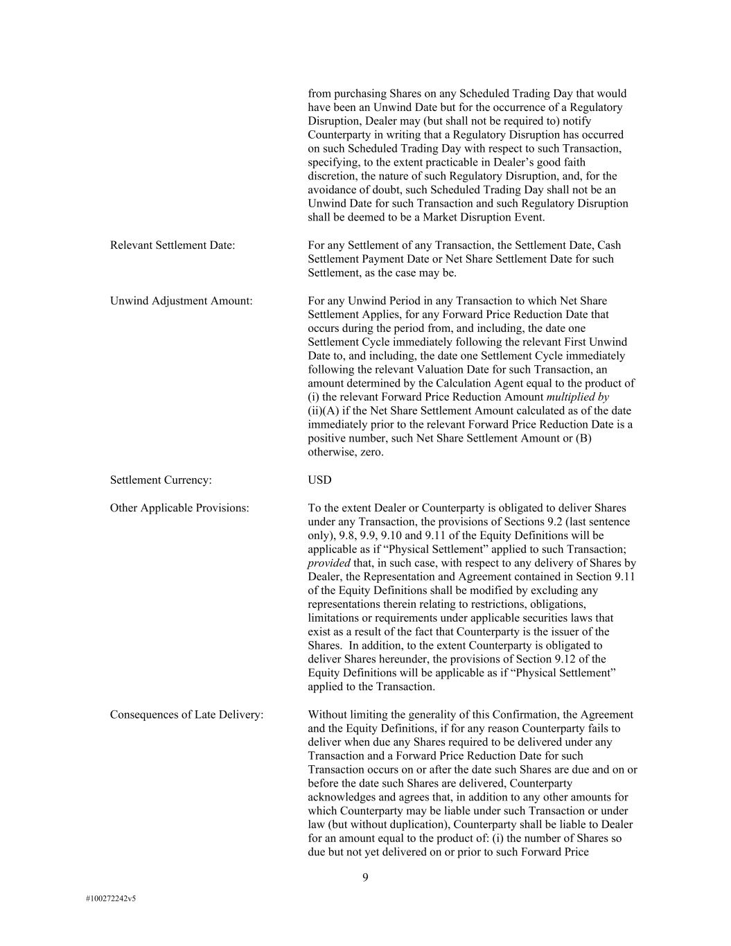 9 # 100272242v5在任何本应是解套日期的预定交易日购买股票,但若发生监管中断,交易商可(但不得被要求)书面通知交易对手,在该预定交易日发生了与该交易有关的监管中断,并在可行范围内以交易商的善意酌处权指明该监管中断的性质,为免生疑问,该预定交易日不应是此类交易的解禁日,此类监管中断应被视为市场扰乱事件。相关结算日:任何交易的任何结算,视情况而定,该等结算的结算日、现金结算支付日或净股结算日。平仓调整金额:就适用净股结算的任何交易的任何平仓期间而言,就自(包括)紧接有关第一个平仓日期后一个结算周期的日期至(包括)紧接有关该交易的相关估值日期后一个结算周期的日期期间内发生的任何远期减价日期而言,由计算代理确定的金额等于(i)相关远期减价金额乘以(ii)(a)的乘积,如果截至紧接相关远期减价日期之前的日期计算的净股份结算金额为正数,则该净股份结算金额或(b)否则为零。结算货币:美元其他适用条款:在交易商或交易对手有义务根据任何交易交付股份的范围内,股权定义第9.2节(仅最后一句)、9.8、9.9、9.10和9.11的规定将适用,如同“实物结算”适用于此类交易;但在这种情况下,就交易商的任何股份交付而言,股权定义第9.11节中包含的陈述和协议应通过排除其中与限制、义务、因交易对手为股份发行人而存在的适用证券法的限制或要求。此外,在交易对手有义务根据本协议交付股份的范围内,股权定义第9.12节的规定将适用,如同“实物结算”适用于交易。延迟交付的后果:在不限制本确认书、协议和权益定义的一般性的情况下,如果交易对手因任何原因未能在到期时交付任何交易项下要求交付的任何股份,并且该交易的远期减价日期发生在该等股份到期之日或之后以及该等股份交付之日或之前,交易对手承认并同意,除了交易对手根据该交易或根据法律可能承担责任的任何其他金额(但不重复),交易对手应向交易商承担相当于以下各项乘积的金额:(i)如此到期但尚未在该远期价格或之前交付的股份数量